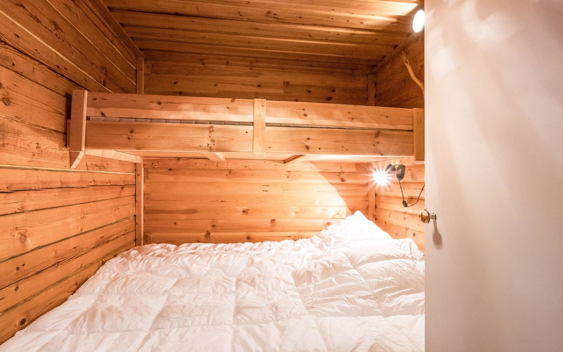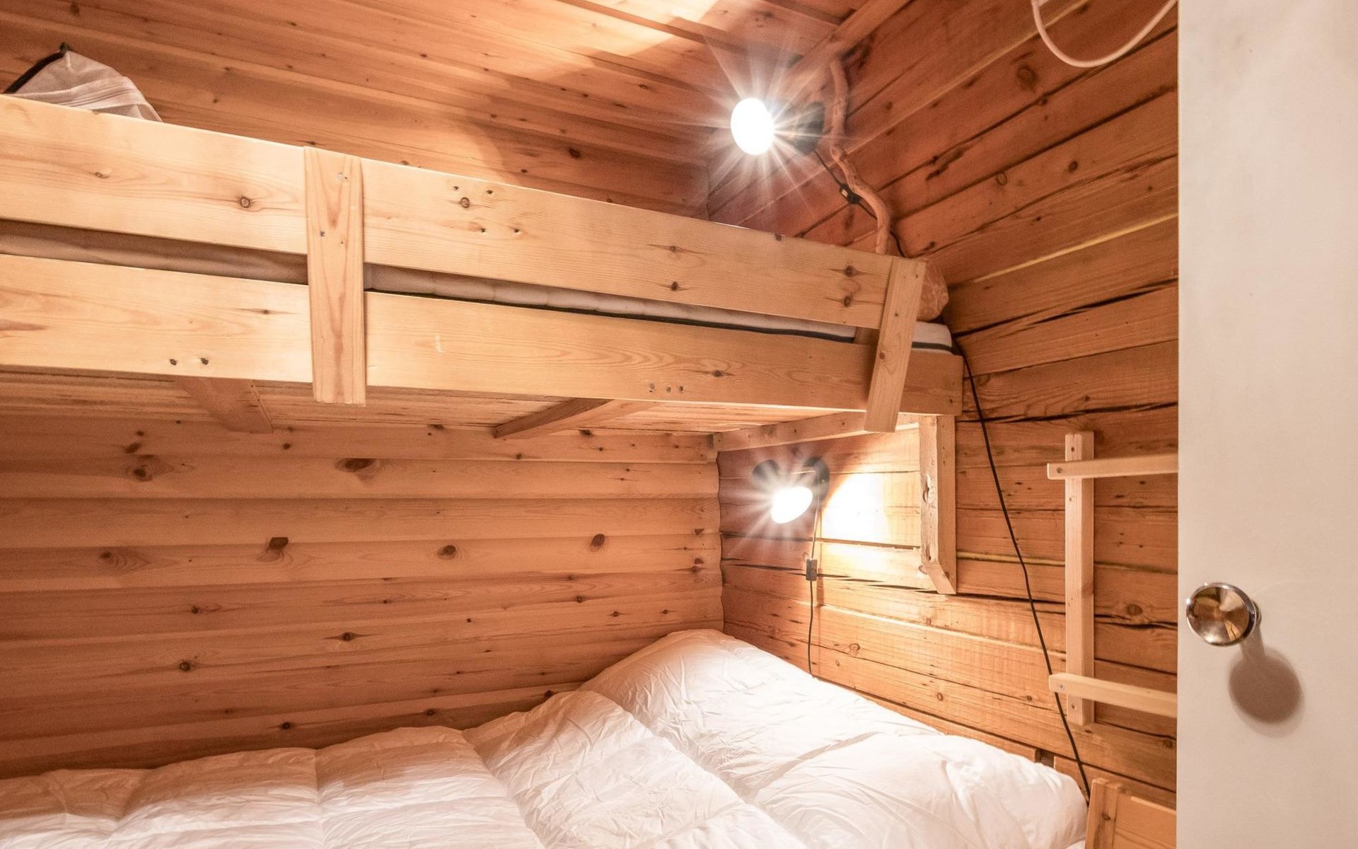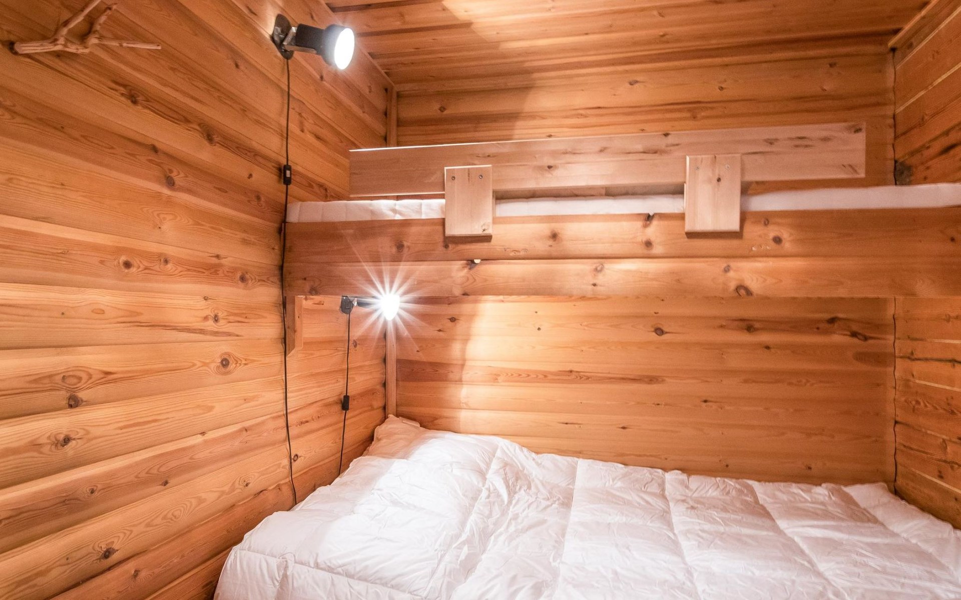 Sleeping arrangements: The cabin has three sleeping alcoves, each with a bunk bed. In two alcoves, the lower beds are 120 cm wide, and the upper beds are 80 cm wide. In the third alcove, the lower bed is 160 cm wide, and the upper bed is 80 cm wide. The upper beds are accessible via wall-mounted ladders. Each alcove also has its own wardrobe.