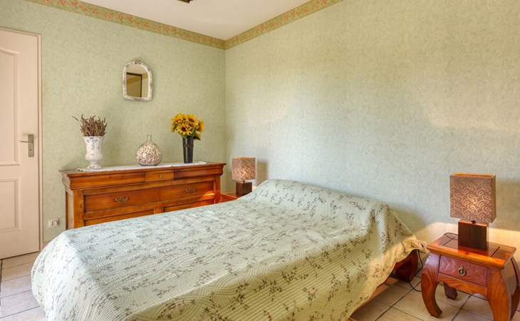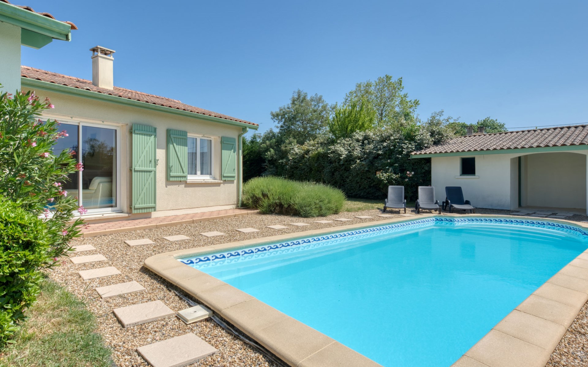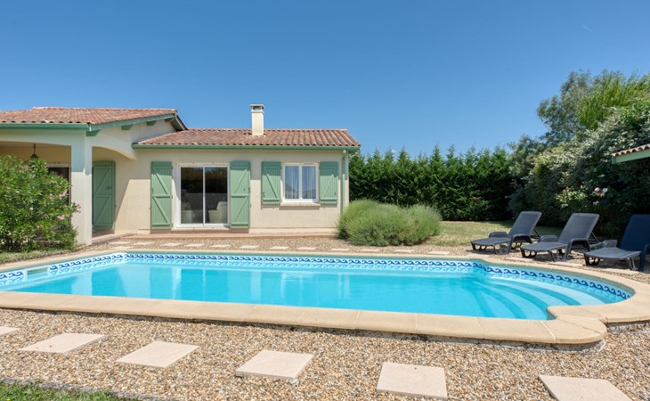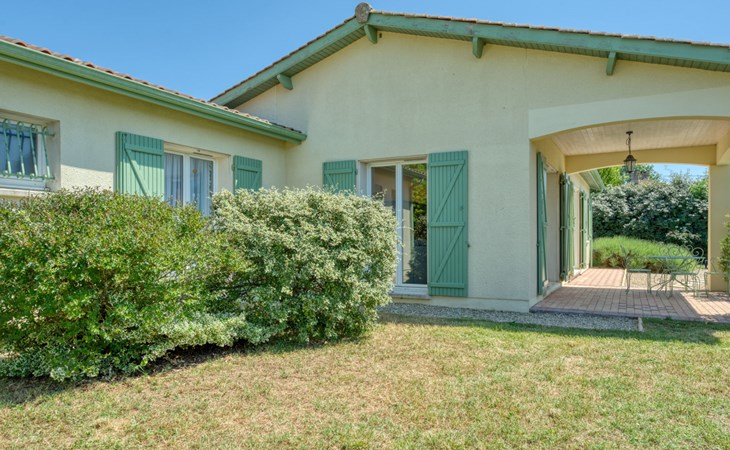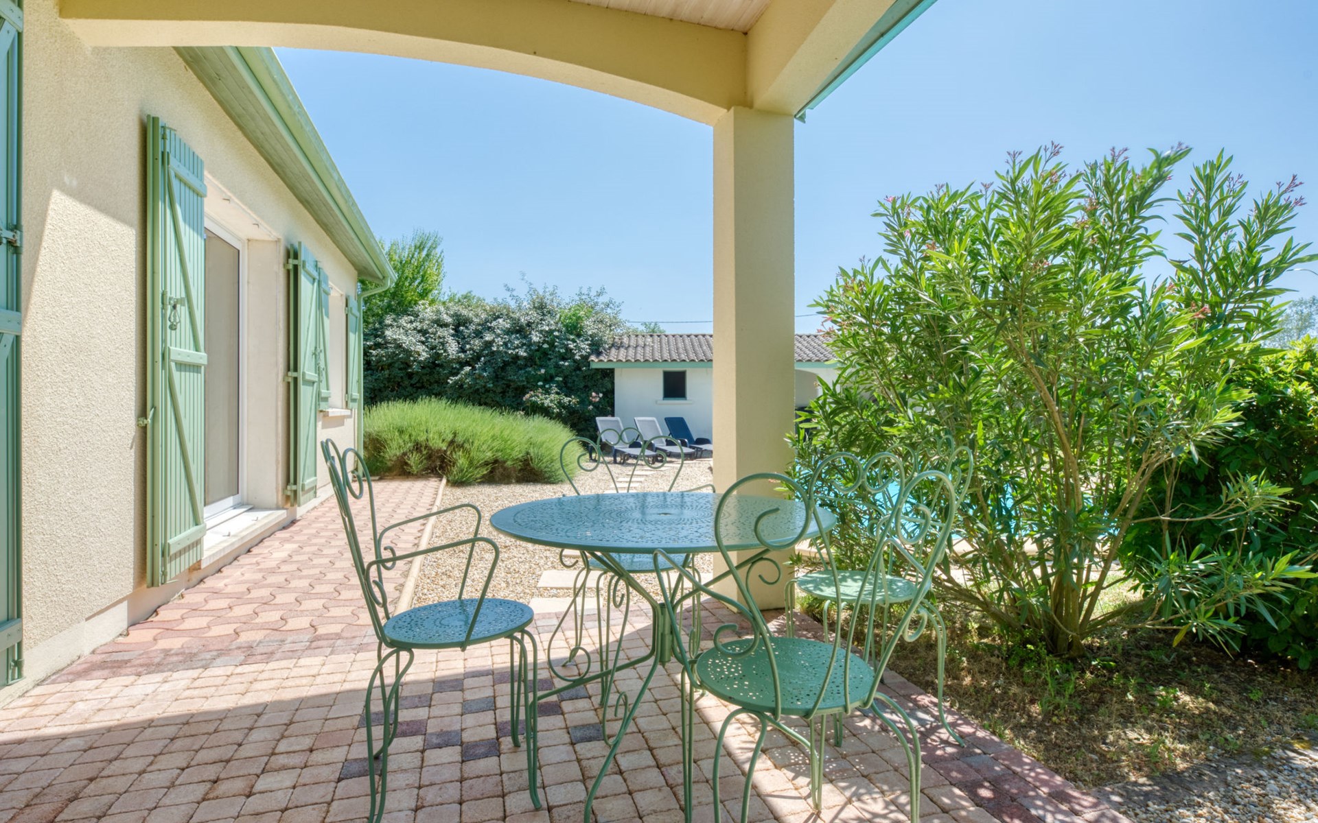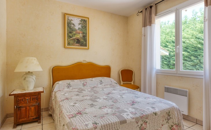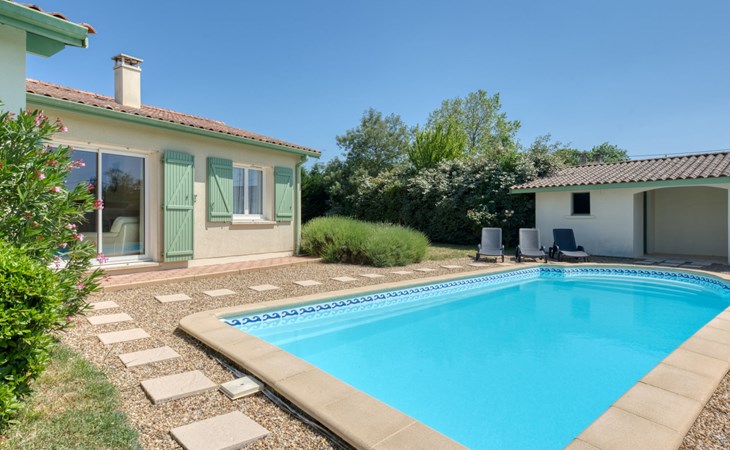 Beautiful, cosy single-family house "Les Lavandiers", surrounded by vineyards. In the district of Hôpital 4 km from the centre of Ordonnac, 8 km from the centre of Lesparre, 68 km from the centre of Bordeaux, in a sunny position, 29 km from the sea, in the countryside. Private: large, well-kept garden 1'700 m2 (fenced) with lawn and wildlife garden, swimming pool (10 x 5 m, depth 150 cm, seasonal availability: 01.Jan. - 31.Dec.) with internal staircase and alarm system. Parking (for 3 cars) at the house on the premises. Supermarket 8 km, bus stop "Route de l'hôpital" 600 m, sandy beach "Le Pin Sec" 29 km.
