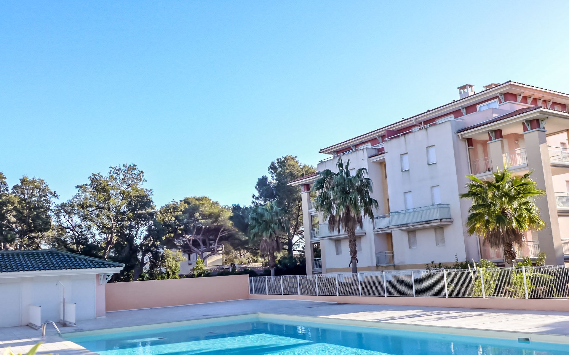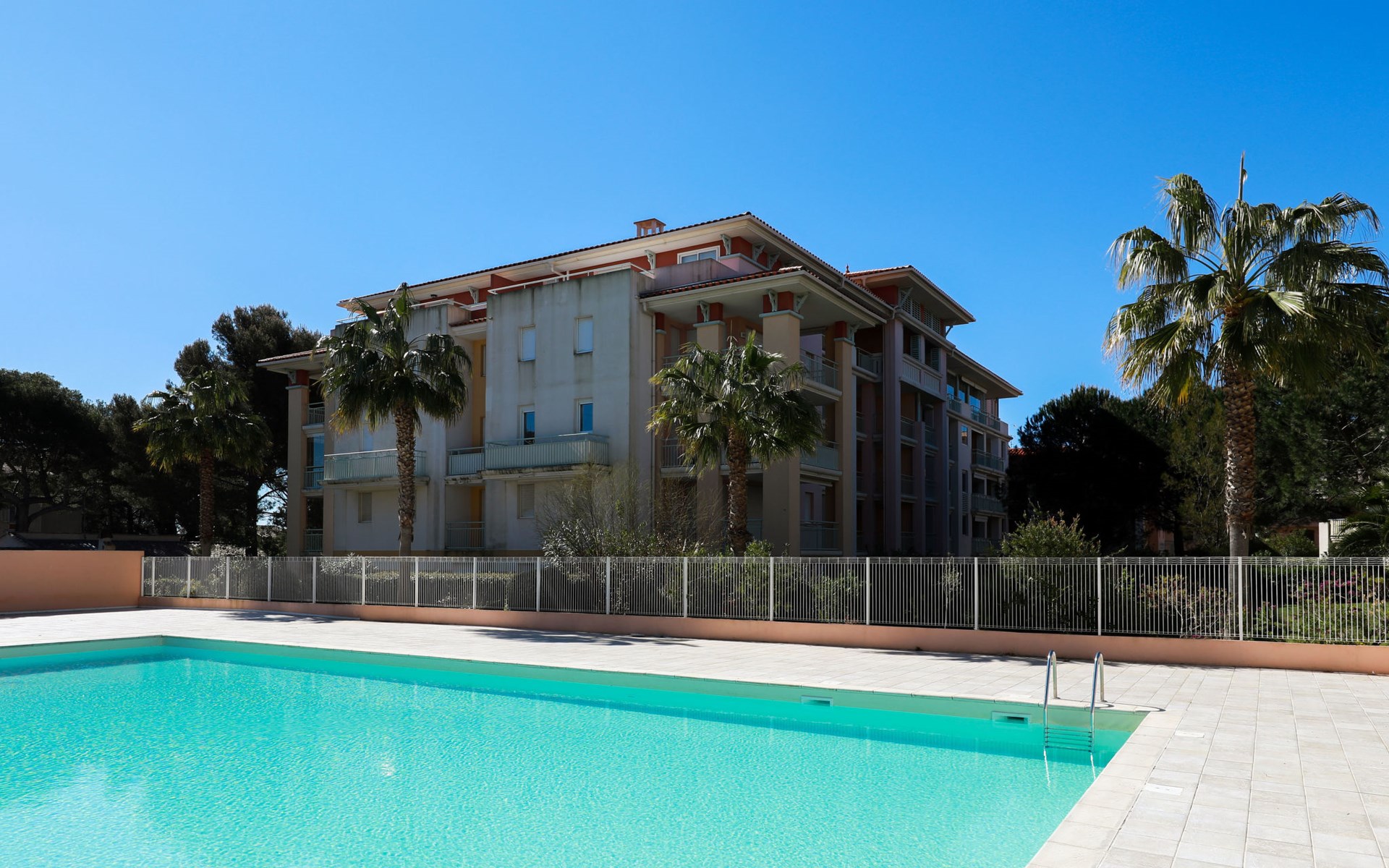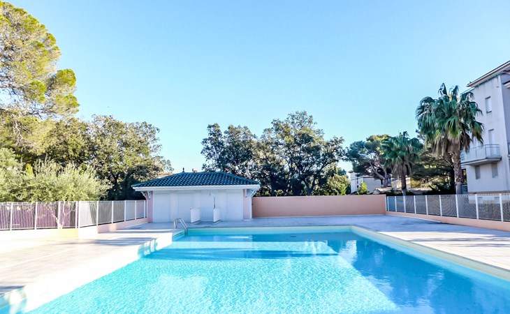 Modern, beautiful residence "Les Calanques du Parc", 4 storeys, built in 2003, surrounded by trees. In the resort, 200 m from the centre, in the residential district, 300 m from the sea, 300 m from the beach. For shared use: park (fenced), swimming pool angular fenced (seasonal availability: 15.May. - 30.Sep. pool opening hours: 09:00-20:00). Children's pool. In the complex: lift. Roofed, parking. Shop 350 m, shopping centre 5 km, 5 minute walk to the centre, bus stop "Grand Parc" 260 m, railway station "Fréjus" 6 km, sandy beach 500 m, park "Areca" 100 m, diving center 6 km, thermal baths "Thalasso de Port Fréjus" 6 km. Sports harbour 500 m, golf course (18 hole) 8 km, sailing school 7 m, riding stable 1 km, sports centre 500 m. Nearby attractions: Lunapark, Aqualand 5 km, Fréjus 6 km, Saint Raphaël 8 km, St Tropez 30 km, Cannes 47 km, Nice 71 km. Well-known ski regions can easily be reached: Auron, Isola 2000 150 km. Well-known lakes can easily be reached: Lac de St Cassien 45 km, Lac du Du Verdon 90 km. Hiking paths: Estérel 16 km, Sentier du Littoral 300 m. Please note: the keys‘ handover takes place by the agency Interhome in Saint Aygulf. Property ref. FR8541.140 is situated on the same property.