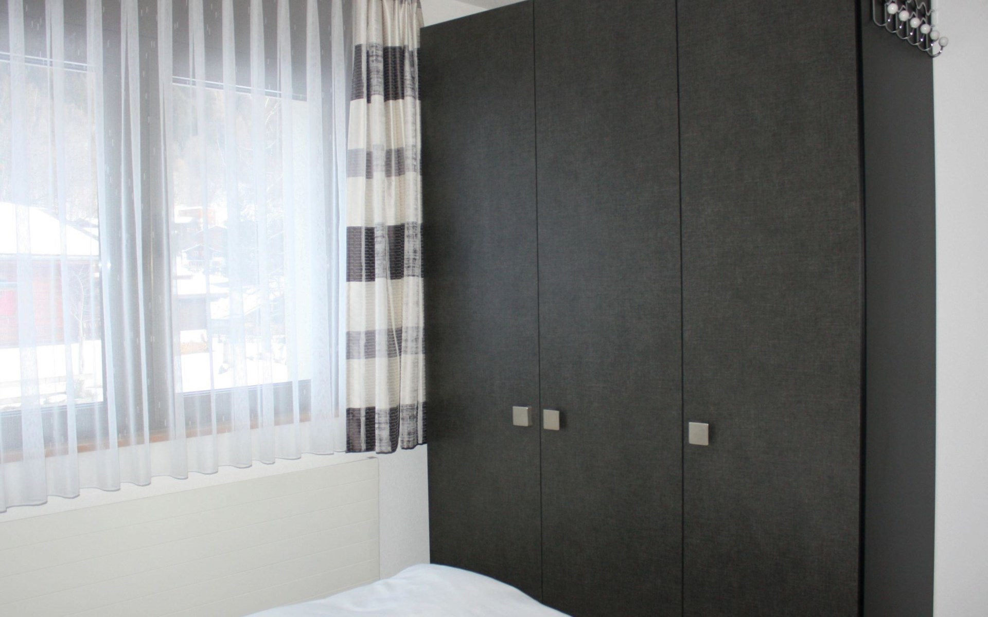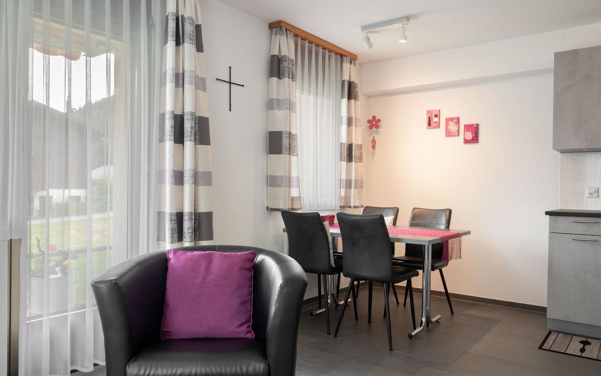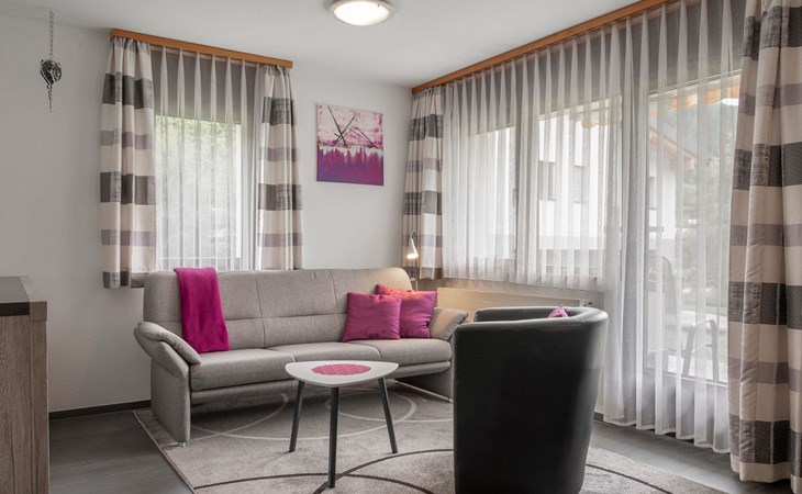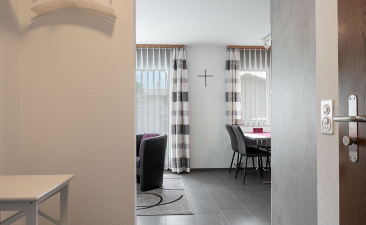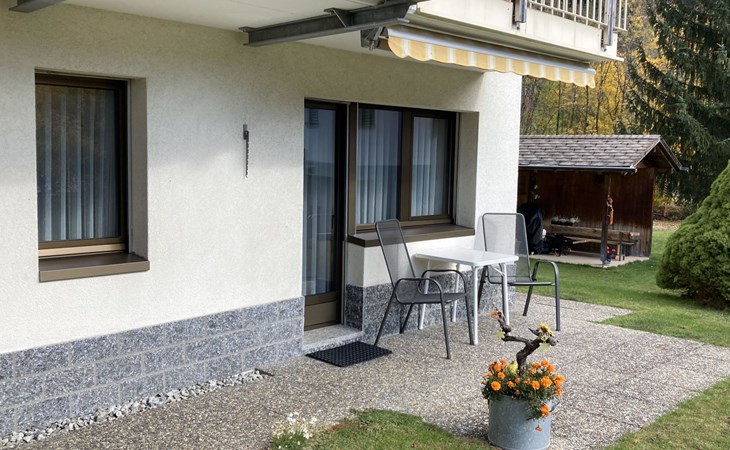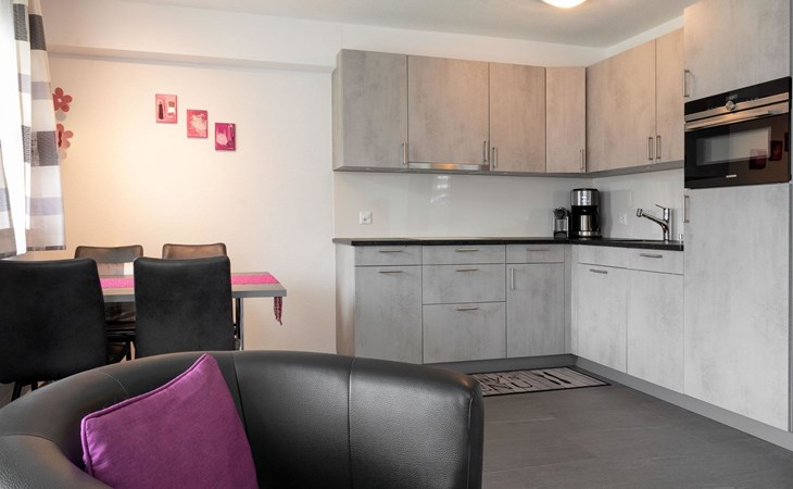 The apartment is modern and comfortably furnished. The bedroom features a double bed. The living area includes a TV, radio, CD player and internet connection. The kitchen with integrated dining area is fully equipped, including a coffee machine, kettle and toaster. A fondue set and a raclette oven are also available. A washing machine, dryer and iron in the adjacent room can be used for free.