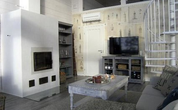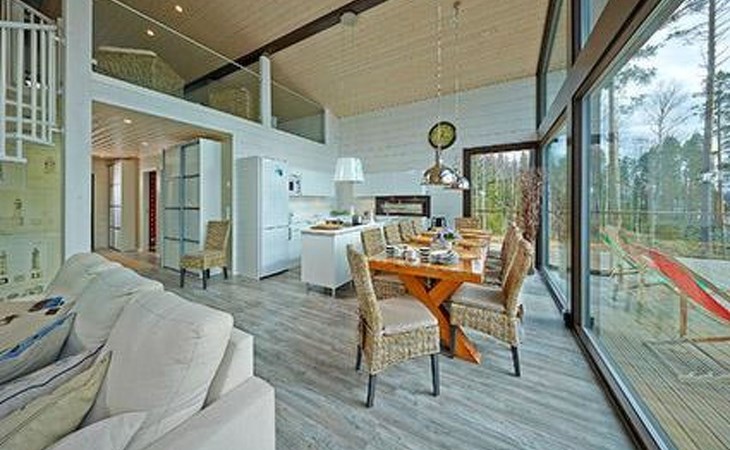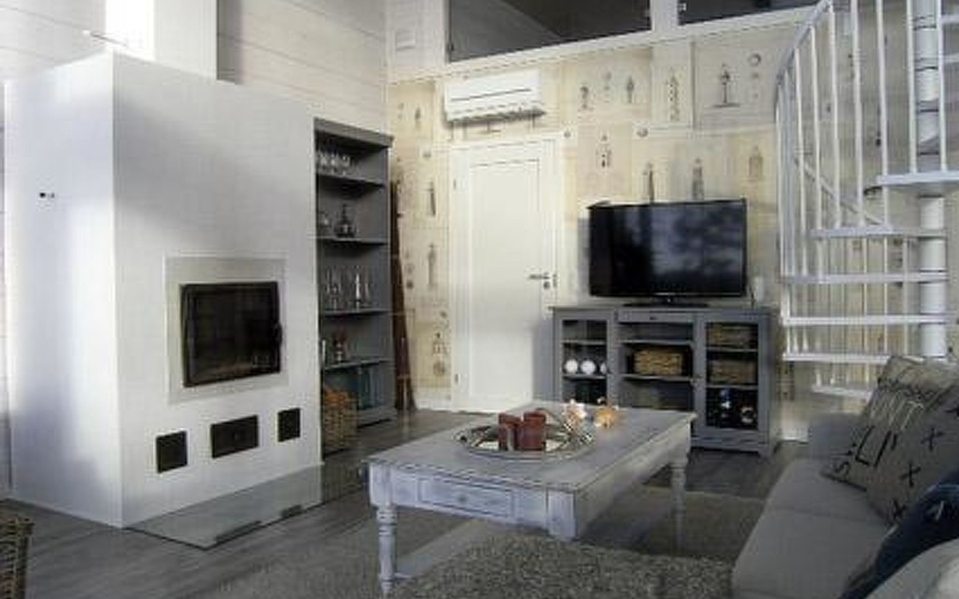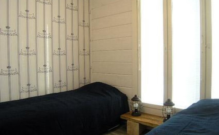 Log villa 2015, kitchen-living room, two bedrooms each with double bed, bedroom with 2 beds, WC, sauna, shower room, entrance hall, large open terrace, loft with 2 beds and 2 extra beds (sofa bed). Two showers in villa.