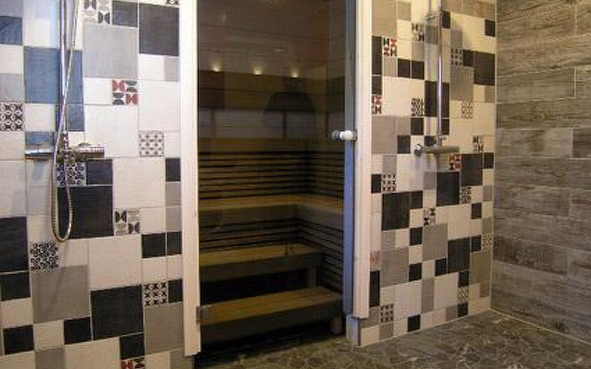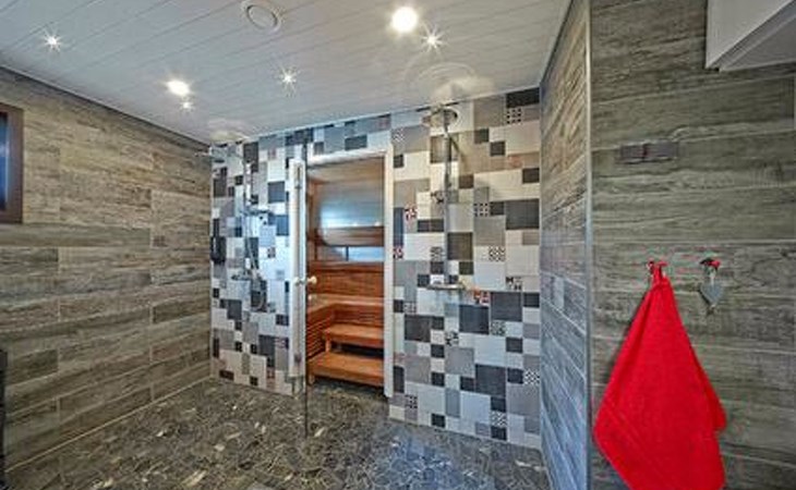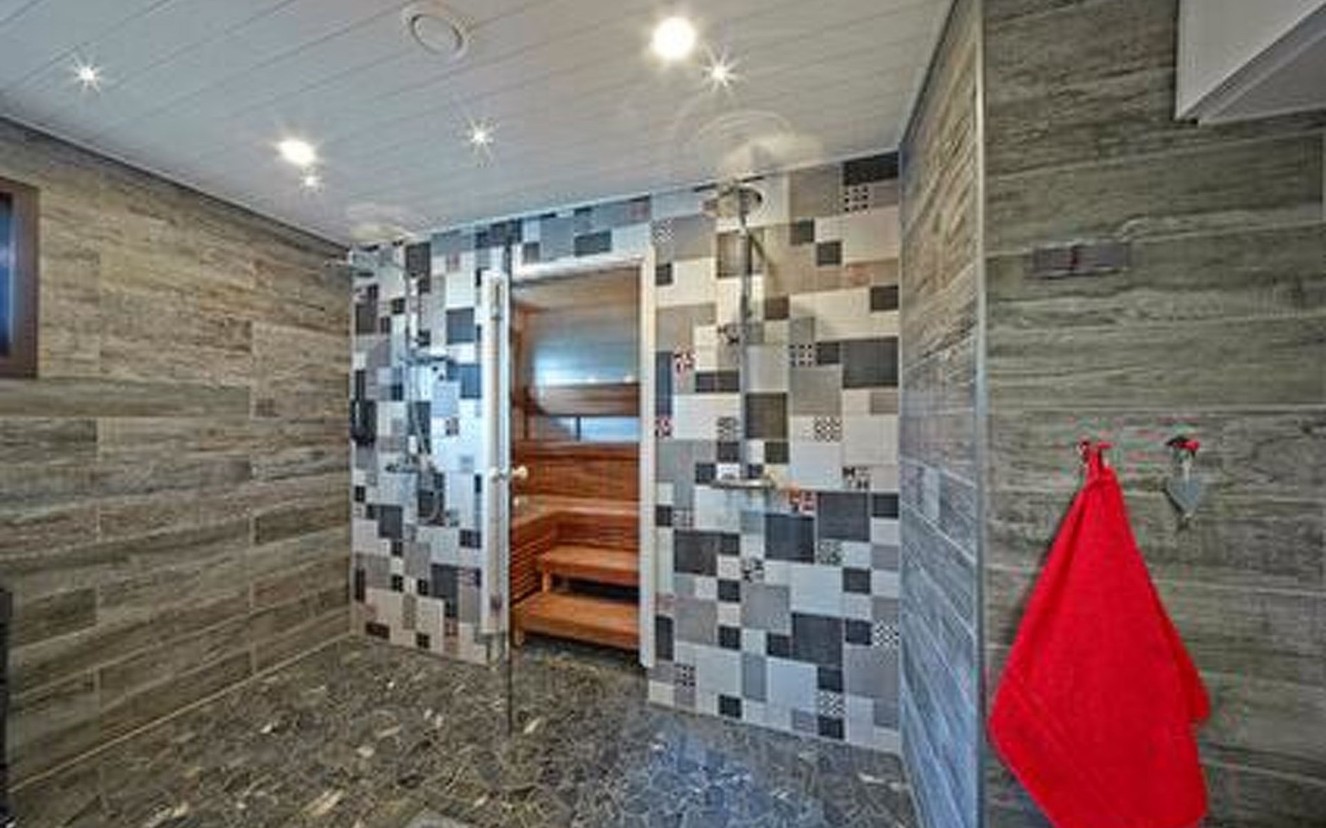 Wood fired lake side sauna 2016 (15 m²), steam room with shower, dressing room. Big terrace with fireplace.