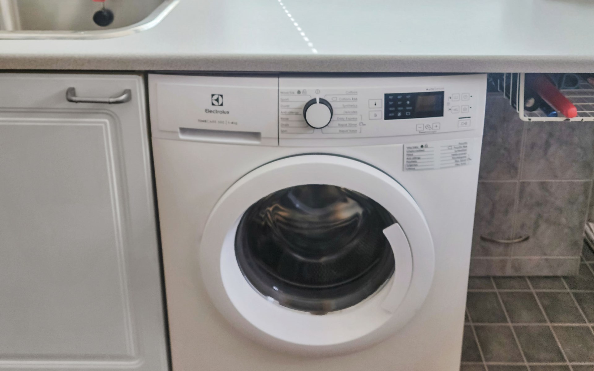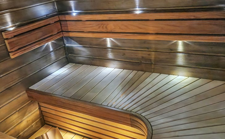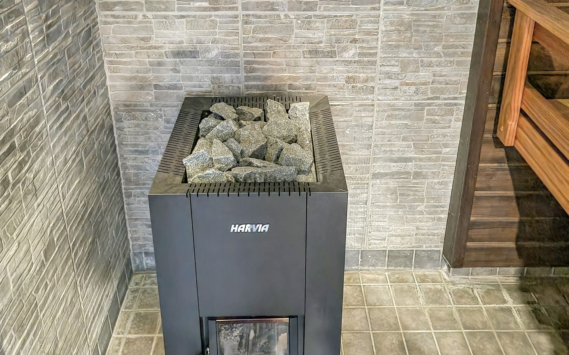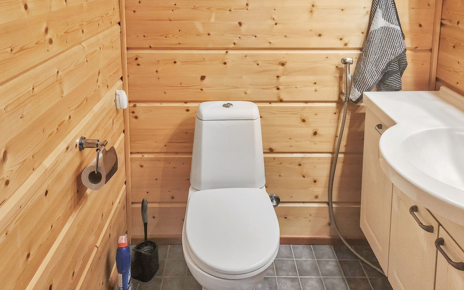 The utility room includes a washing machine and a separate sink, perfect for rinsing outdoor gear. The sauna is fitted with a wood-burning stove and atmospheric lighting, while the washroom has a shower, WC, and washbasin.