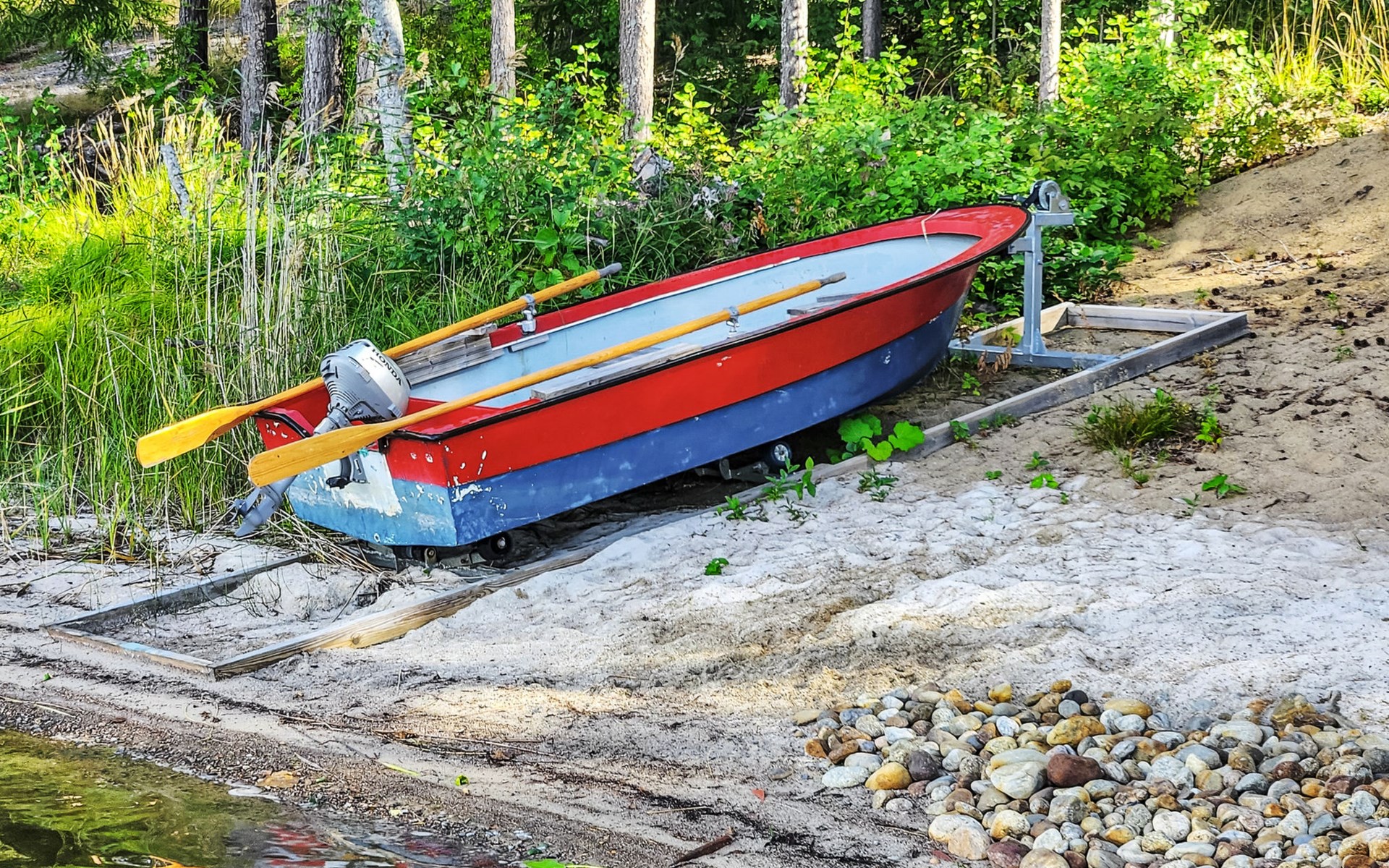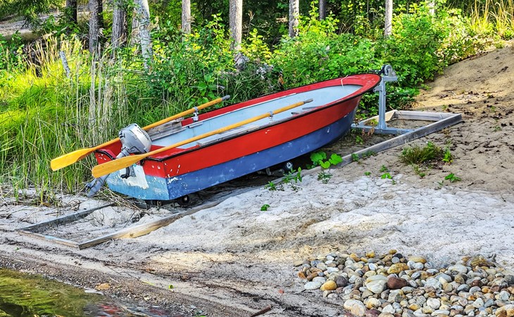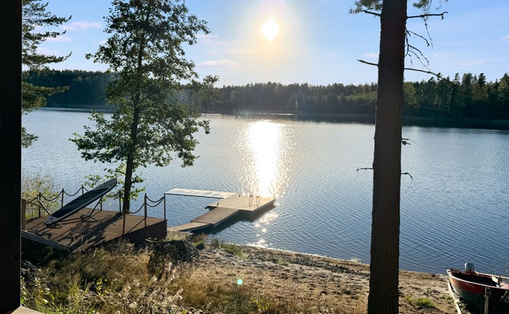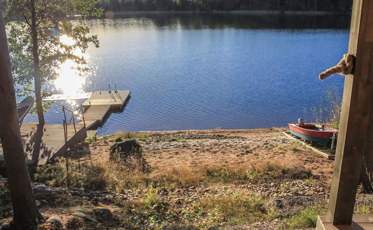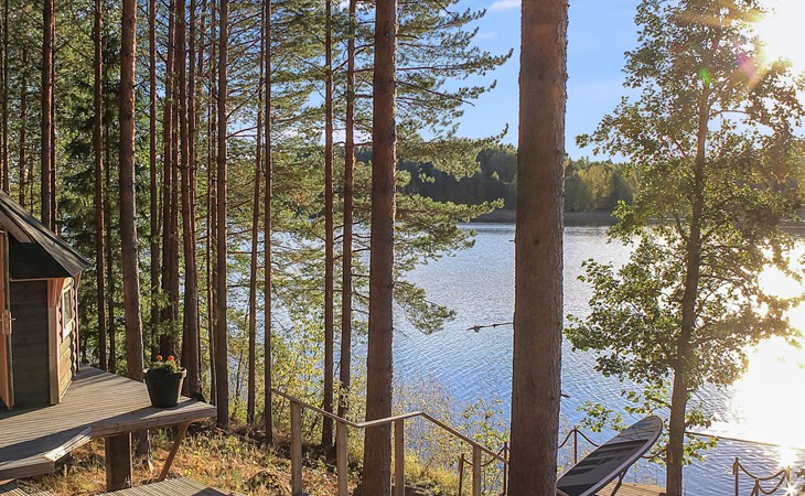 The shoreline is about 150 m from the main building, accessible via a marked path through a scenic forest. There you’ll find a sauna cabin with panoramic lake views from the steam room. A pier leads into the lake, reached by steep stairs, with a small sandy swimming area beside it. Guests also have access to a rowing boat with a small outboard motor. By the shore, there is also a traditional Finnish hut with a grill, refrigerator, and three extendable benches that can even be used for overnight stays.