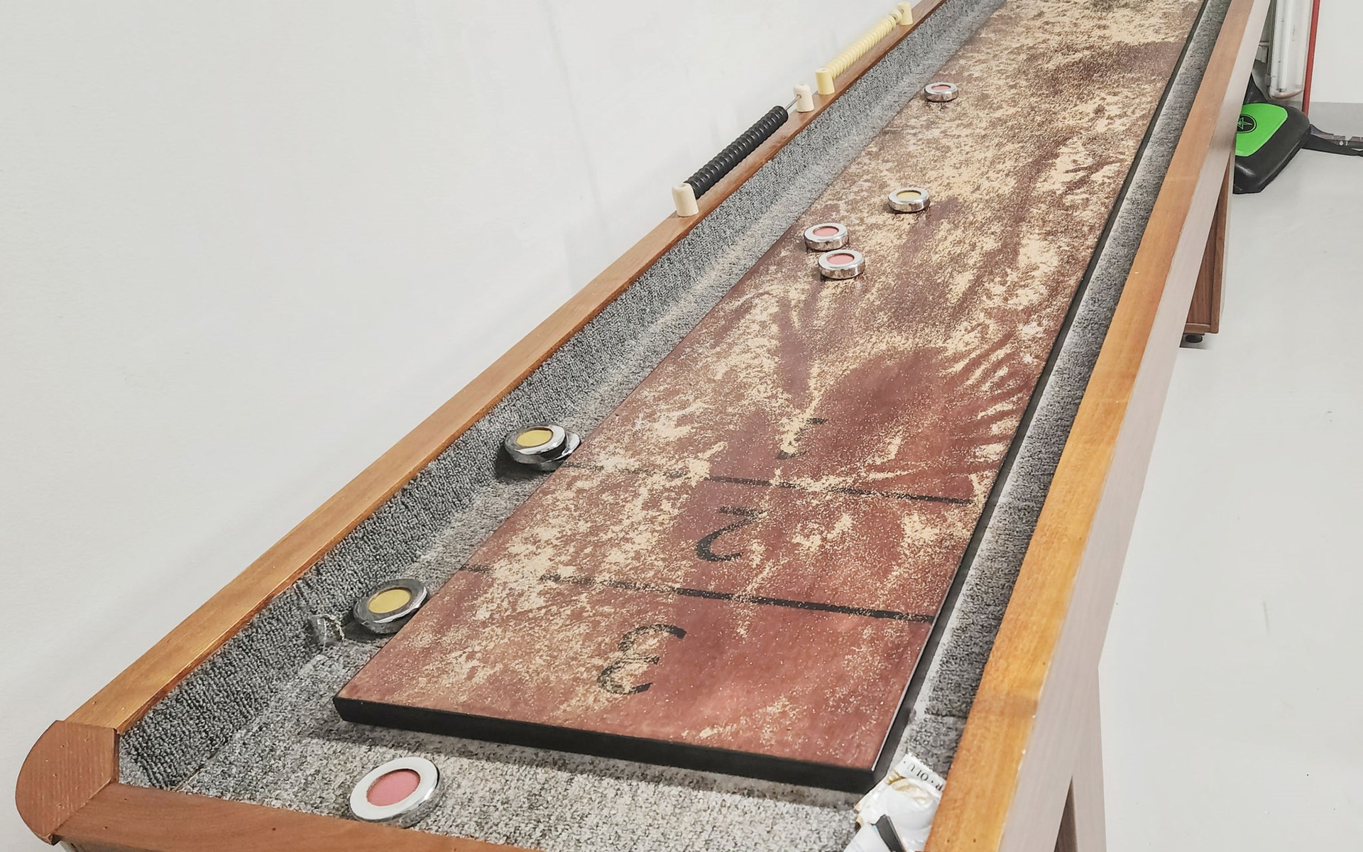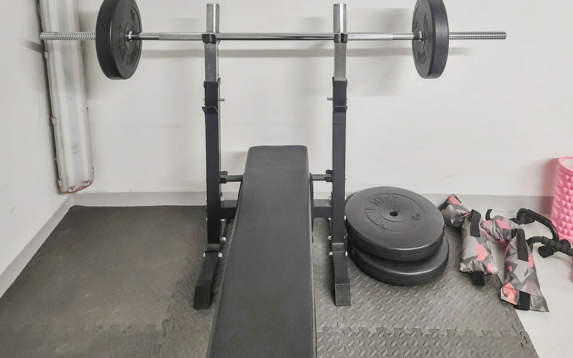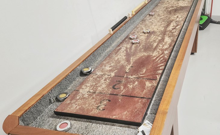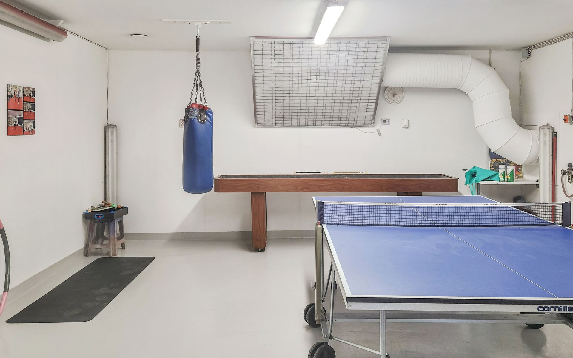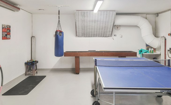 A separate outbuilding houses a small home gym with a bench and weights for light workouts, as well as a table tennis table and table curling.
