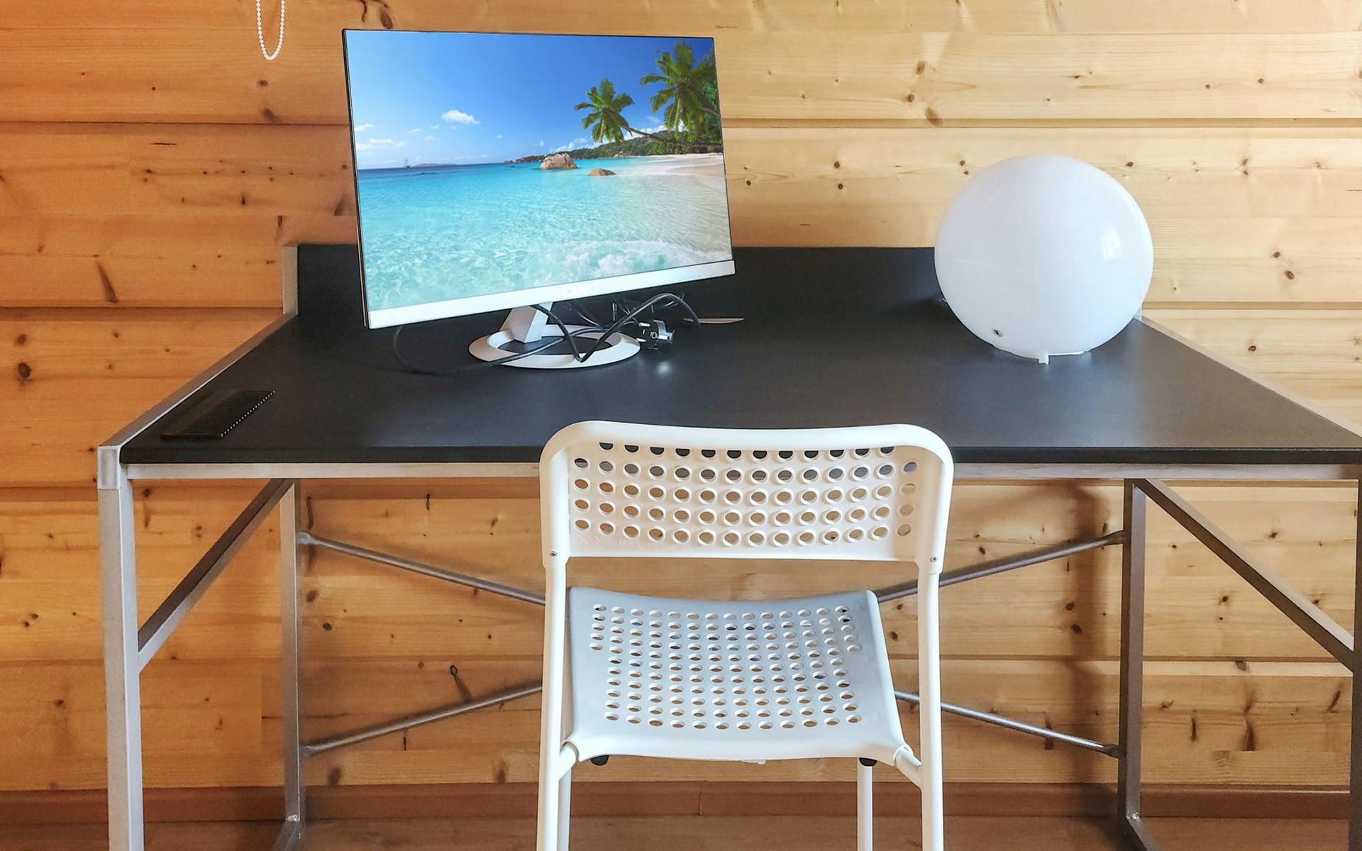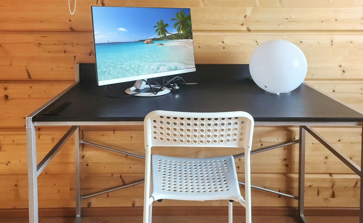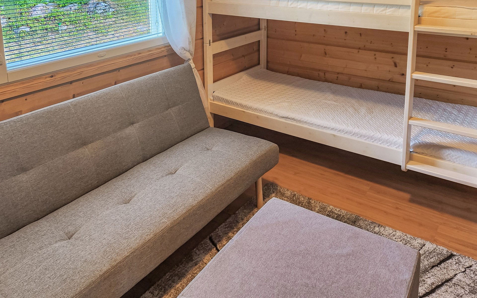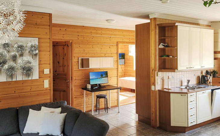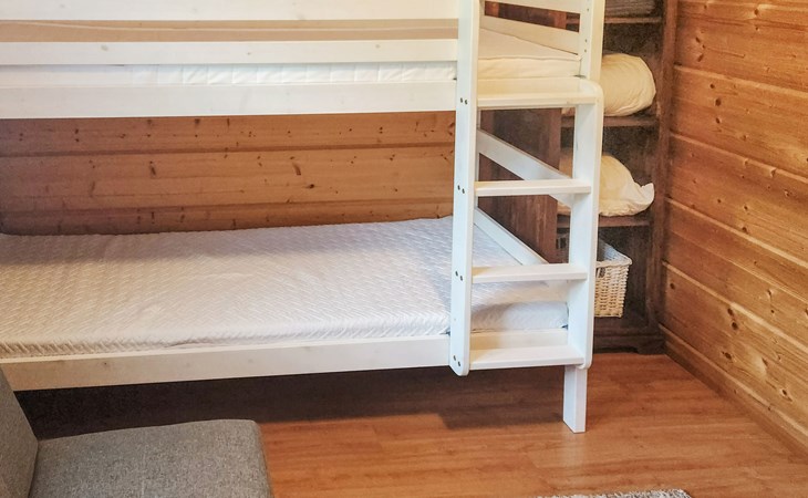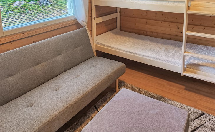 Two bedrooms, one of which has a bunk bed (80 cm). In addition, there is a sofa bed (190 cm x 140 cm) for temporary sleeping. This bedroom also has a Smart TV. And the other bedroom has an 80 cm bed. The room also has a remote workstation, which makes it possible to work in peace and quiet.