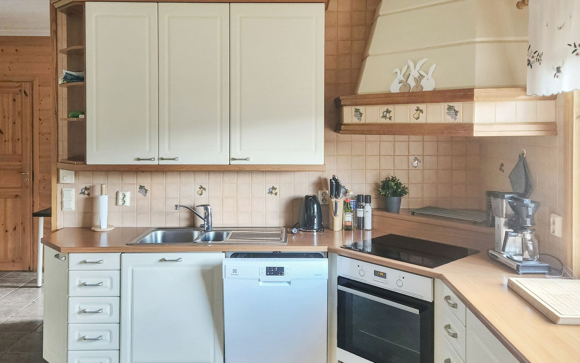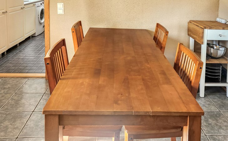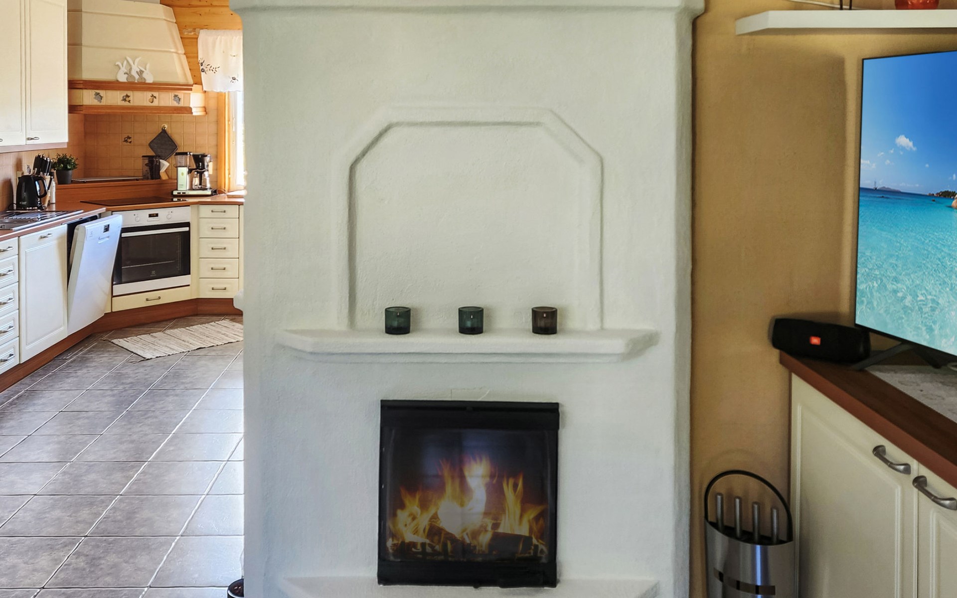 The spacious living room/kitchen features a large sofa set, a large Smart TV, and a heat-storing fireplace. The kitchen area is equipped with everything needed for cooking and dining. The wood burning oven in the kitchen is not available to the clients.