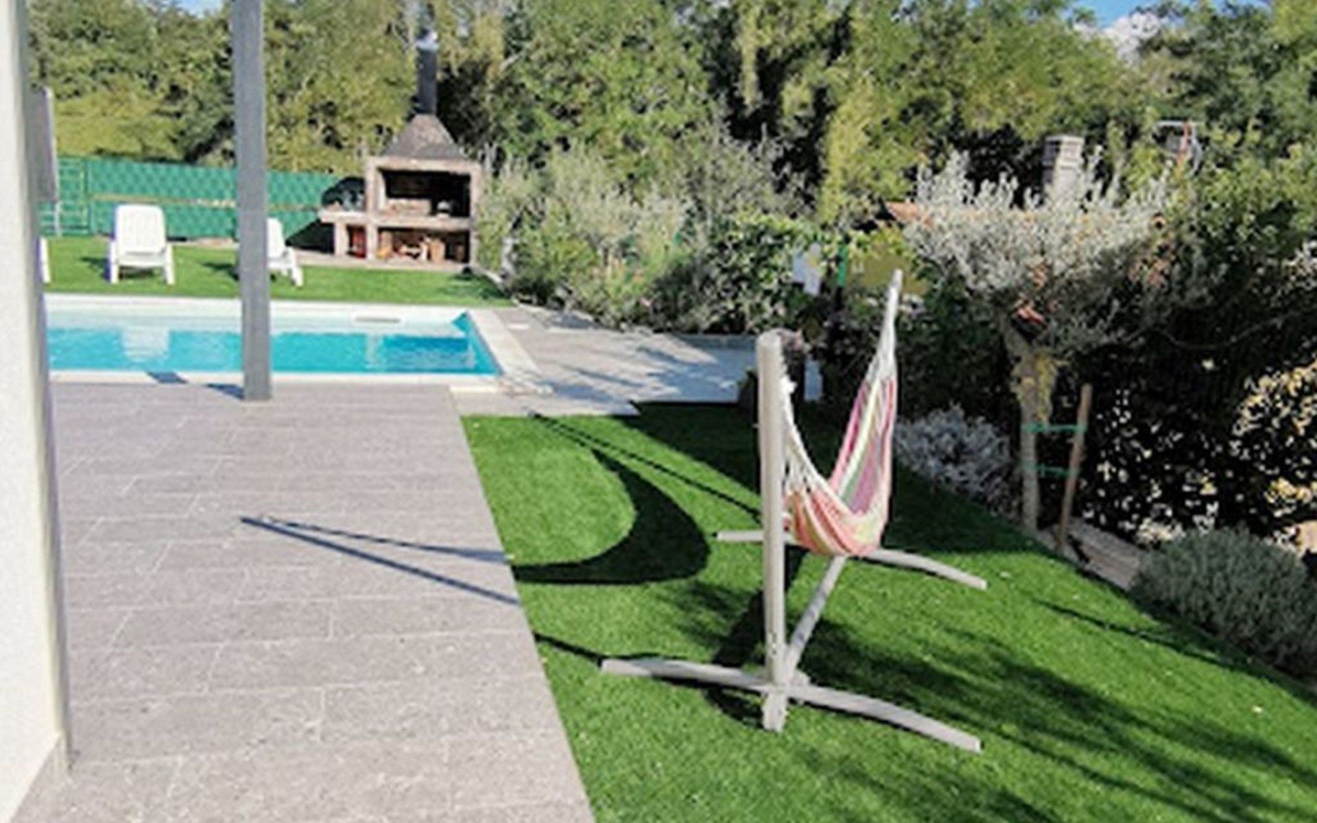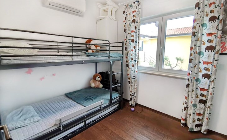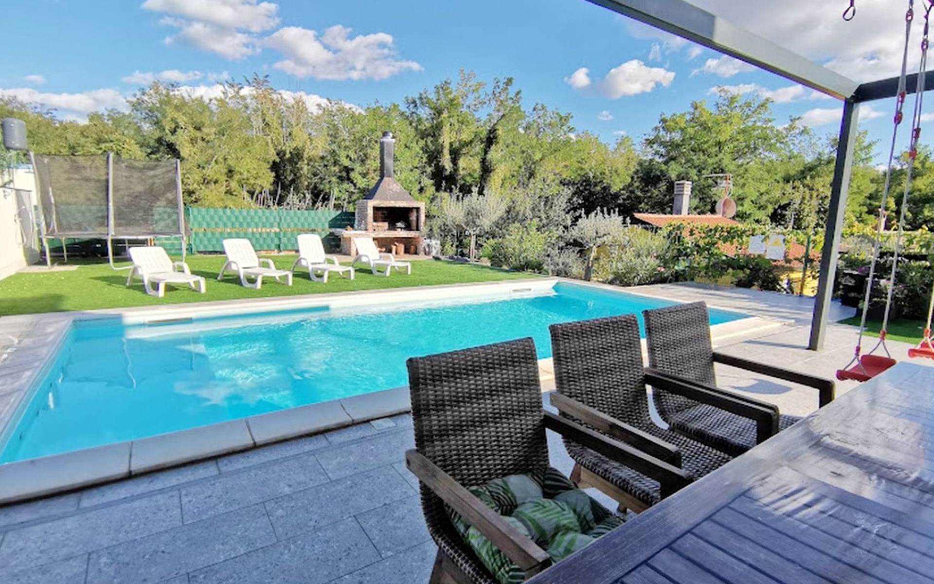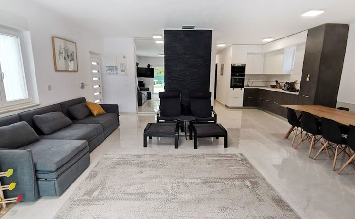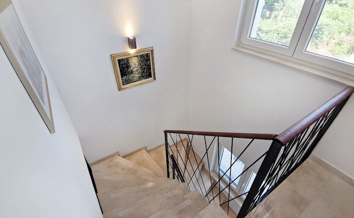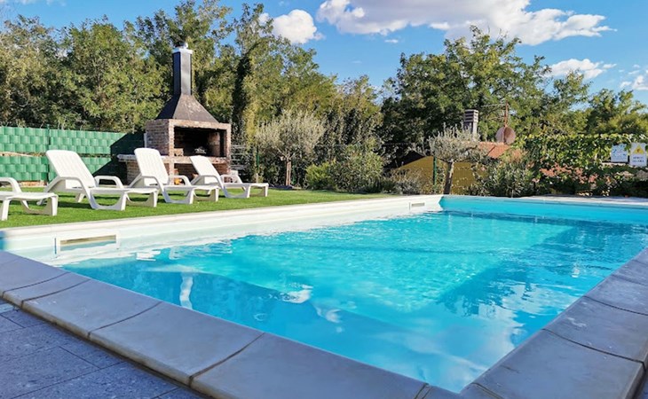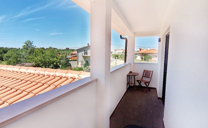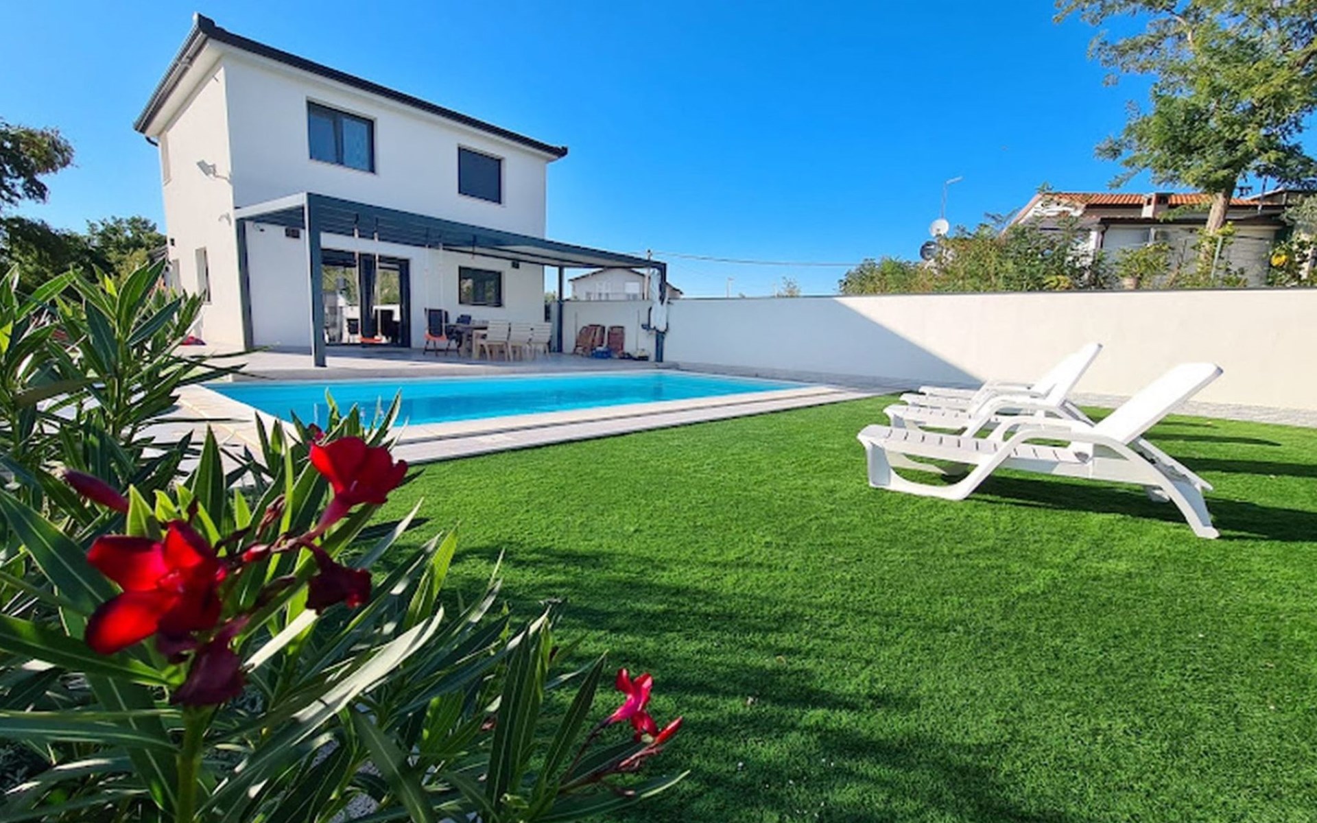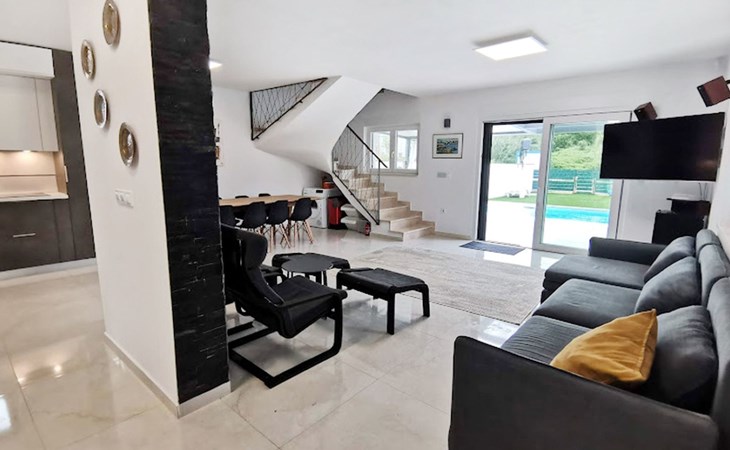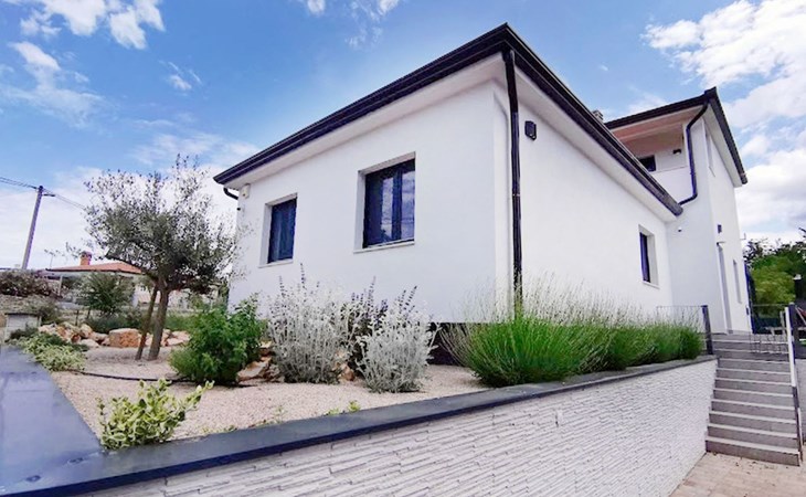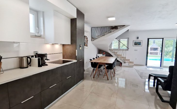 The idyllic setting continues outside: a spacious, covered terrace provides the perfect setting for morning breakfasts under the blue sky or evening socialising. The view of the well-tended garden, the private pool and the picturesque Istrian landscape makes every minute spent outdoors a pleasure. In addition, the nearby free car park facilitates your mobility during your stay.