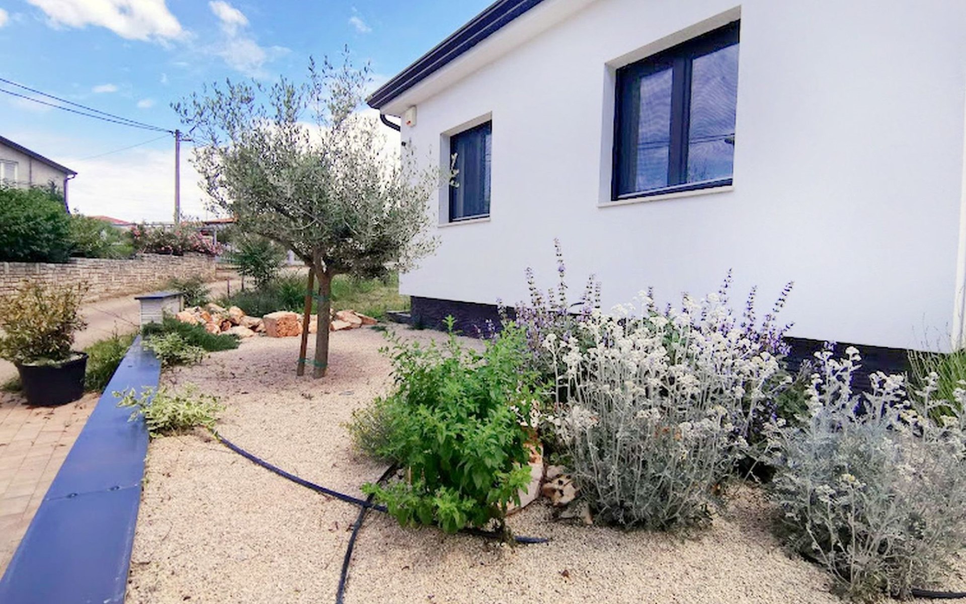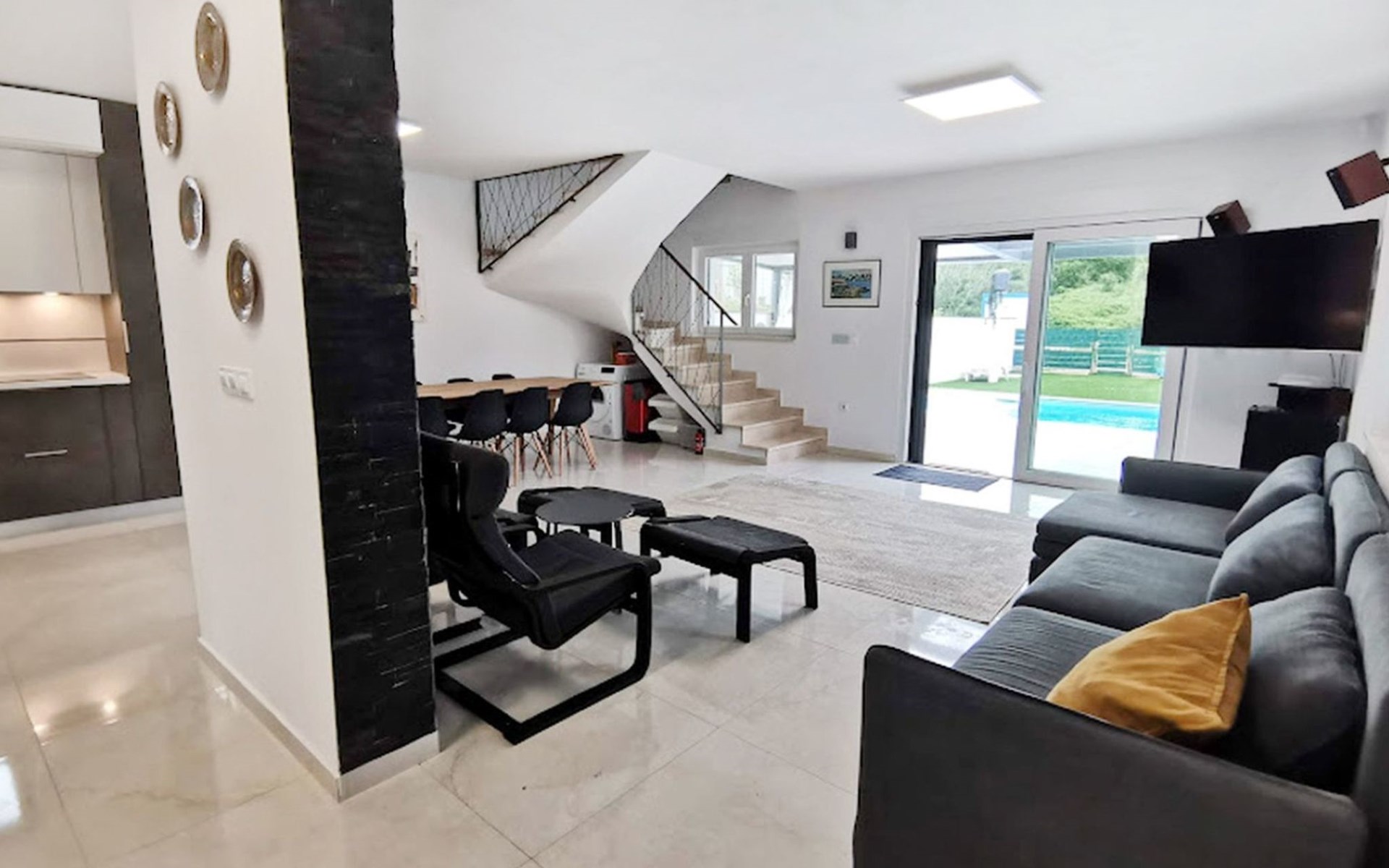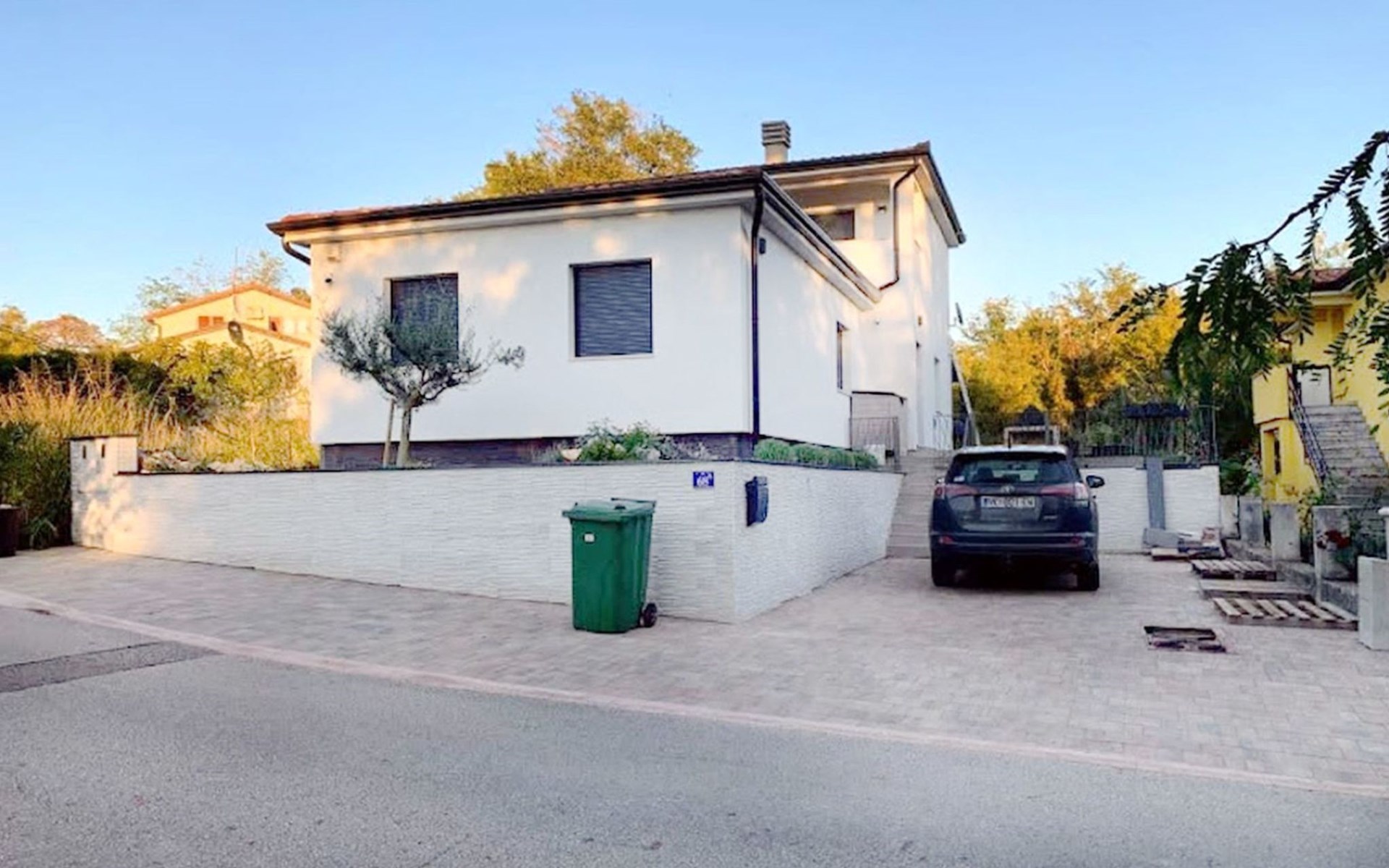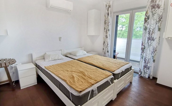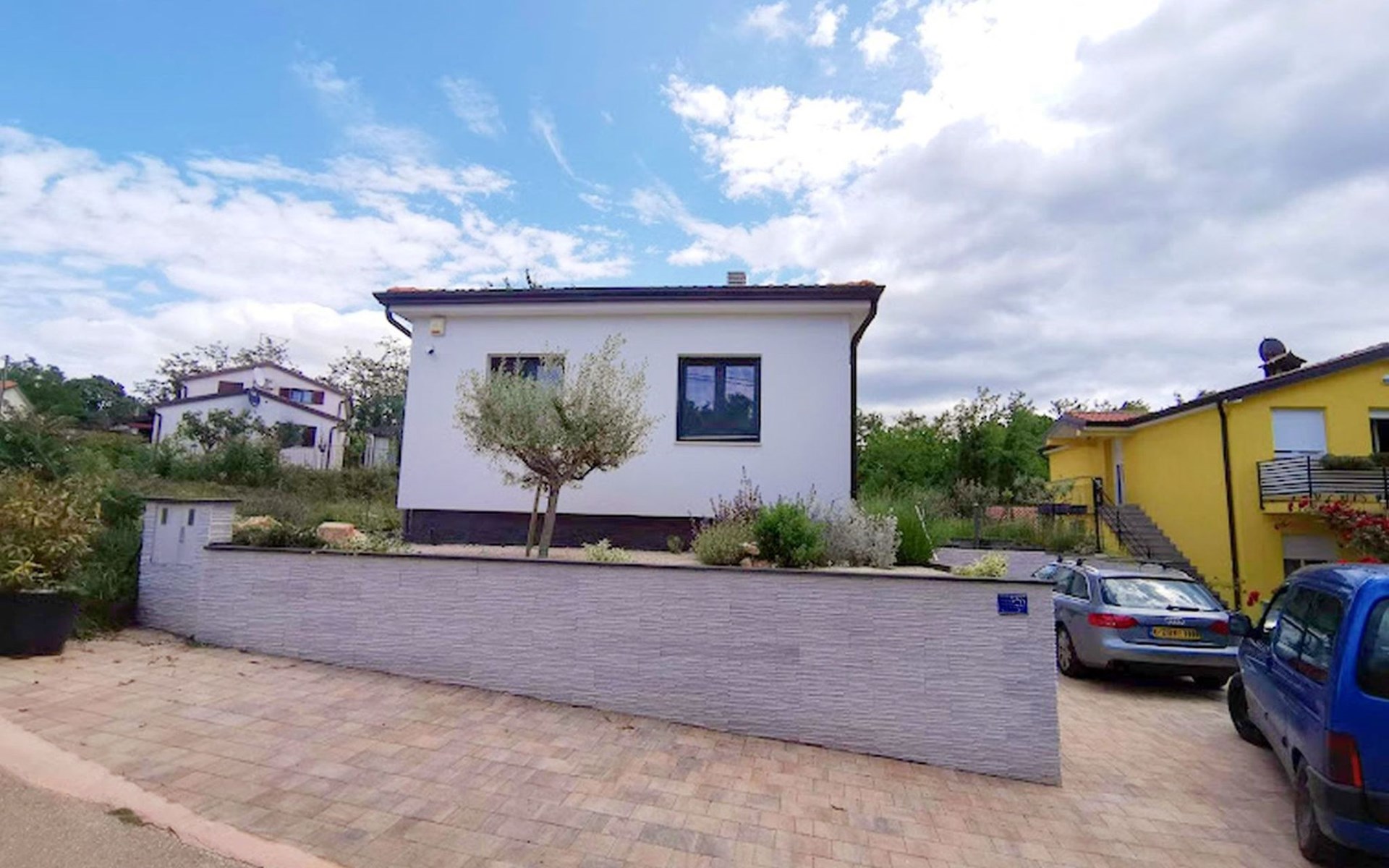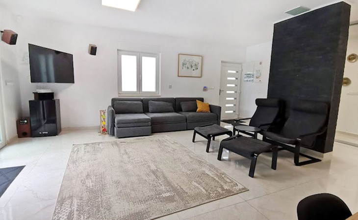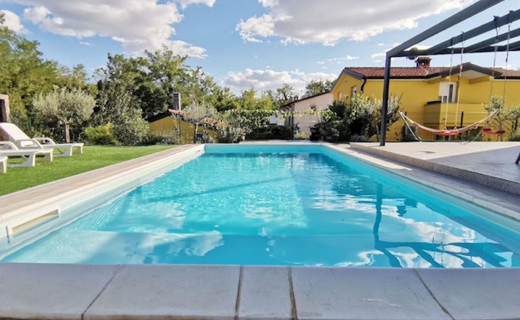 The idyllic setting continues outside: a spacious, covered terrace provides the perfect setting for morning breakfasts under the blue sky or evening socialising. The view of the well-tended garden, the private pool and the picturesque Istrian landscape makes every minute spent outdoors a pleasure. In addition, the nearby free car park facilitates your mobility during your stay.