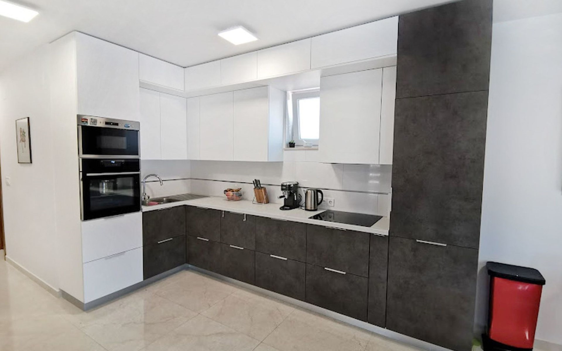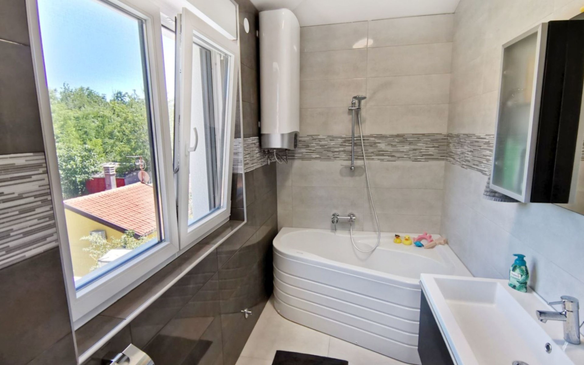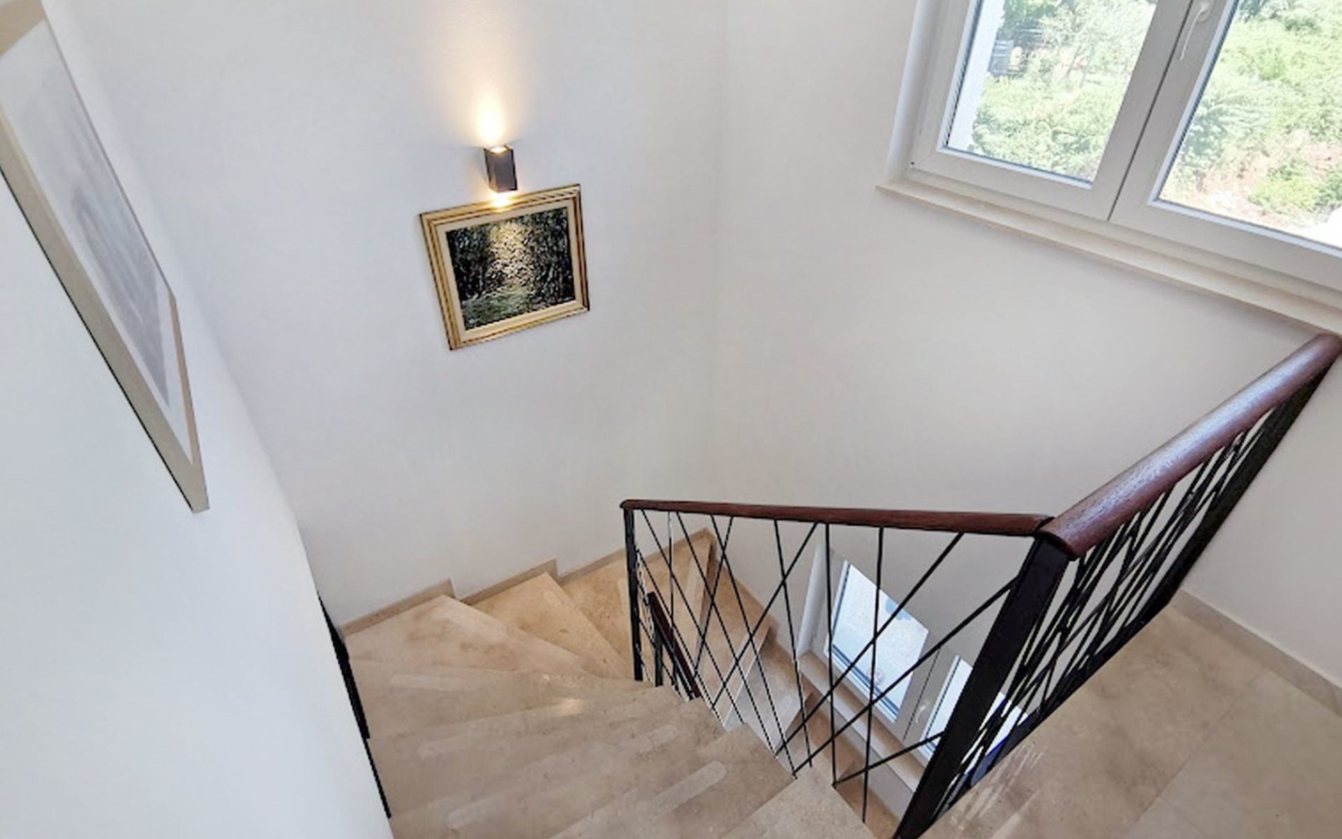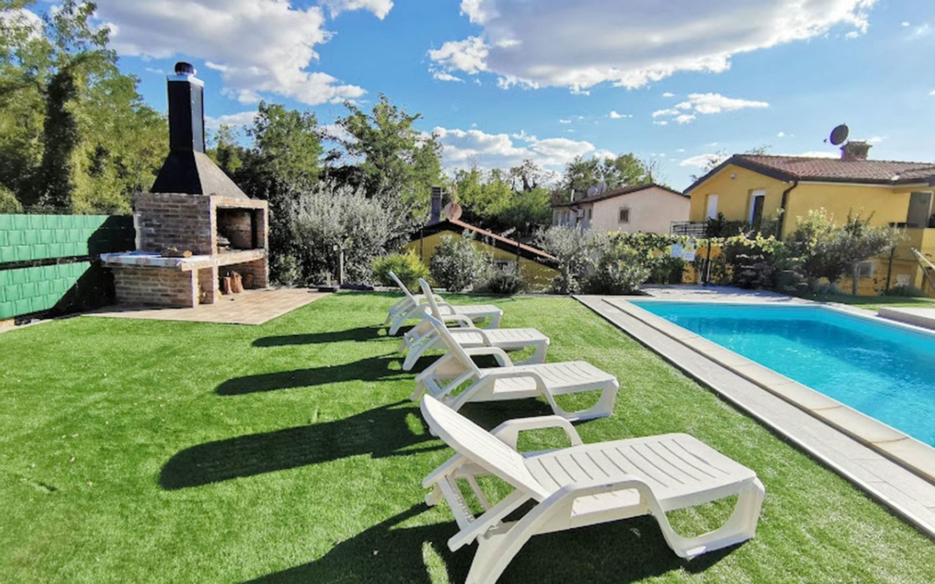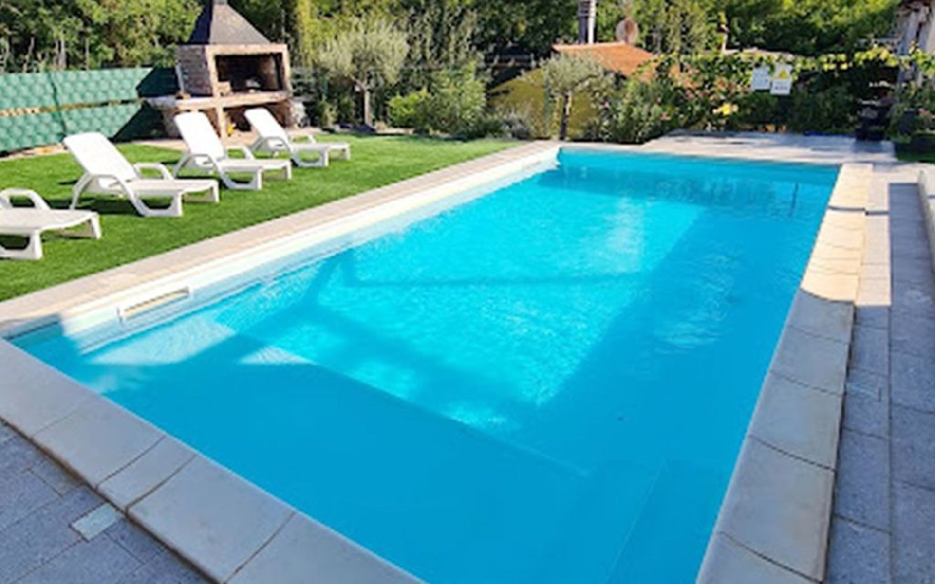 The idyllic setting continues outside: a spacious, covered terrace provides the perfect setting for morning breakfasts under the blue sky or evening socialising. The view of the well-tended garden, the private pool and the picturesque Istrian landscape makes every minute spent outdoors a pleasure. In addition, the nearby free car park facilitates your mobility during your stay.