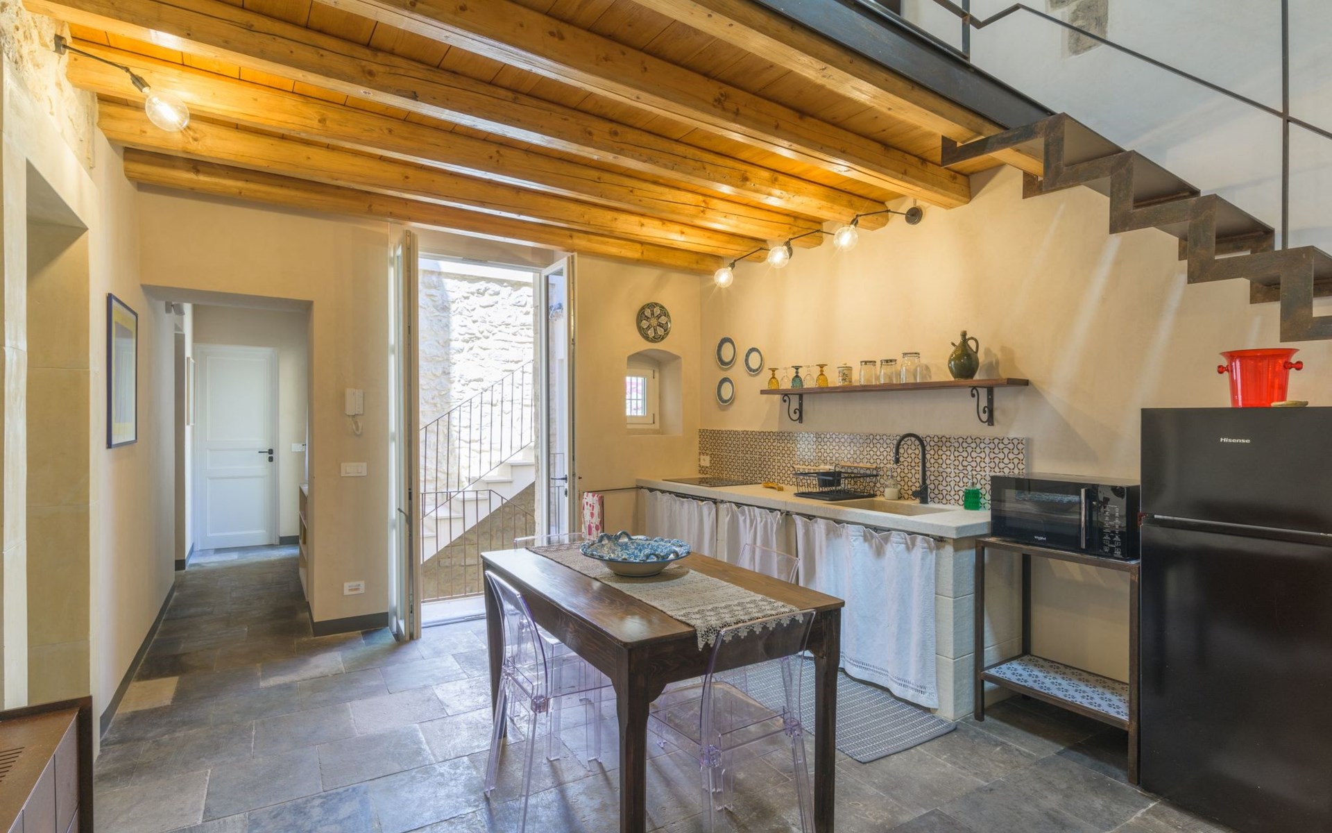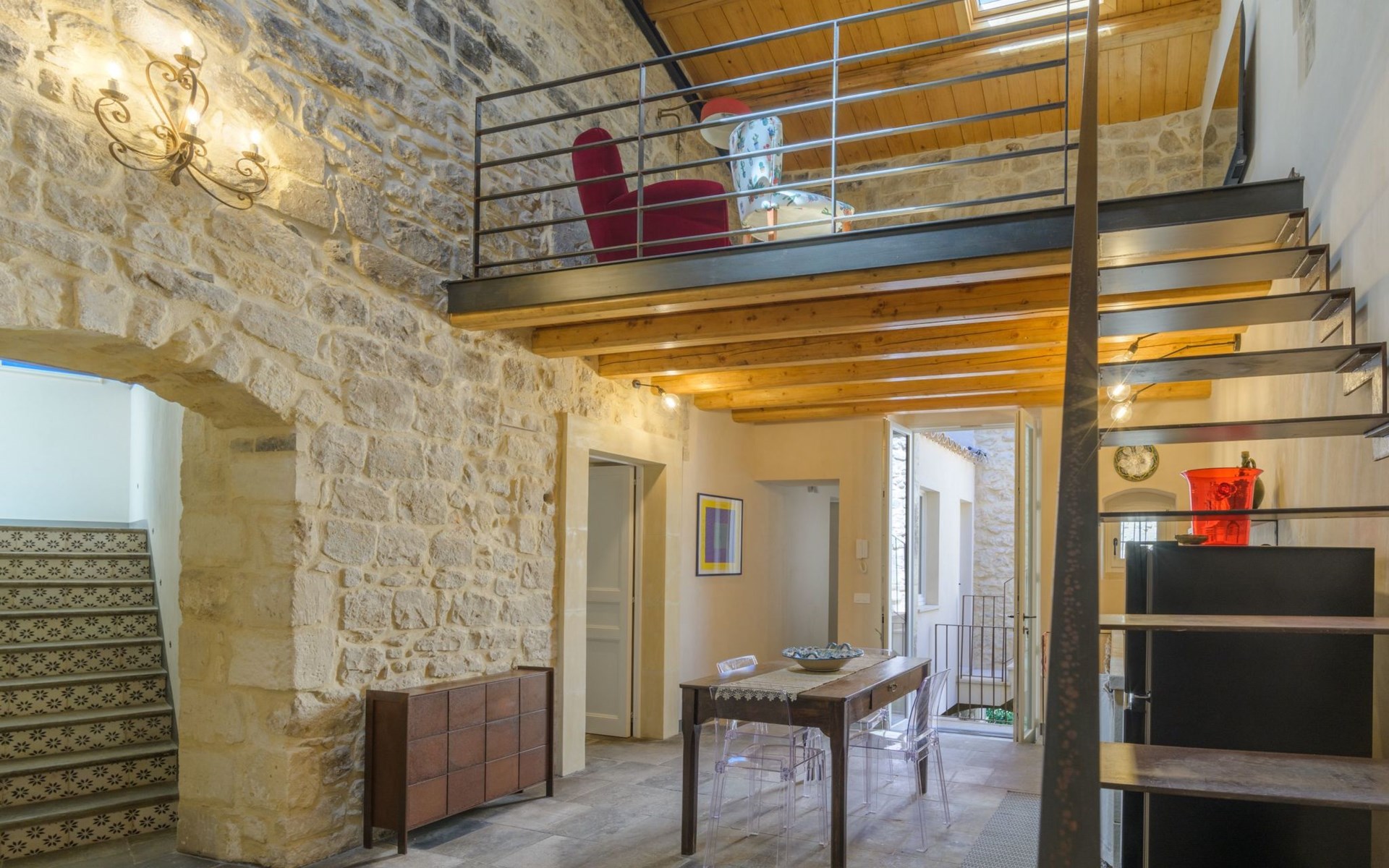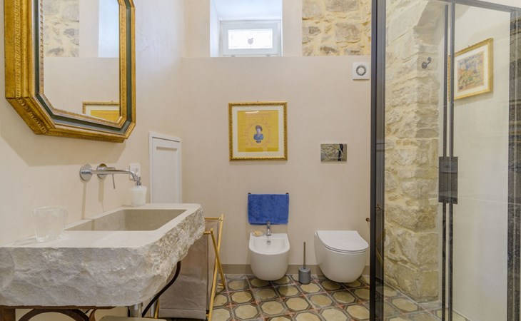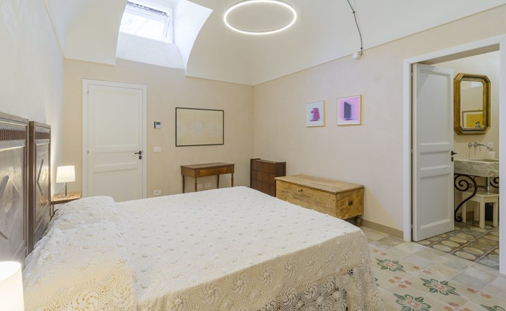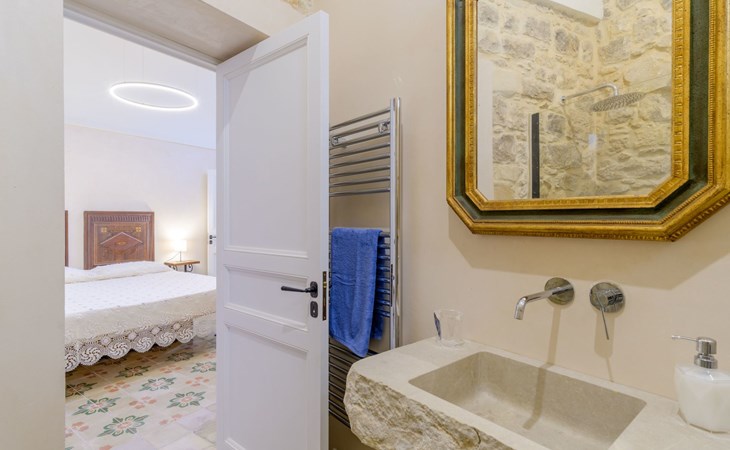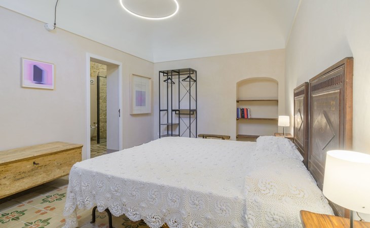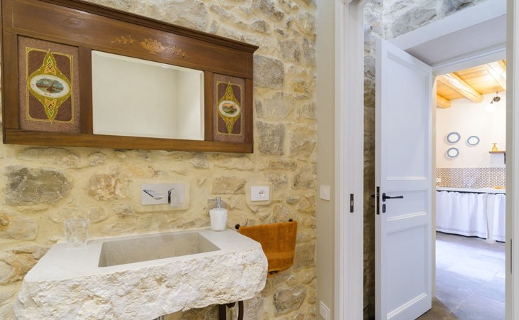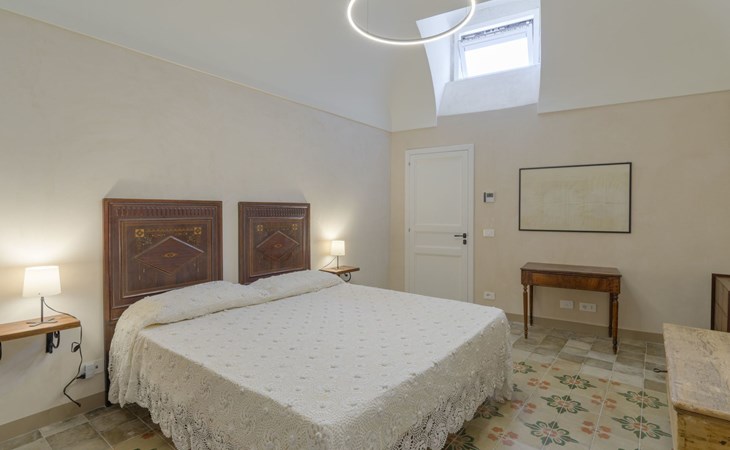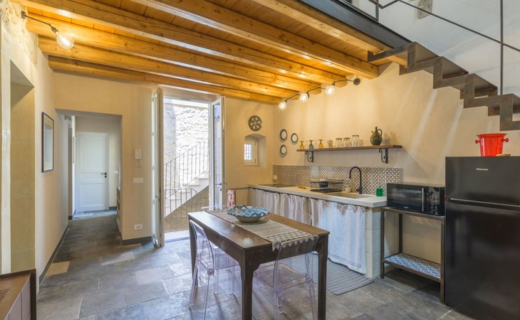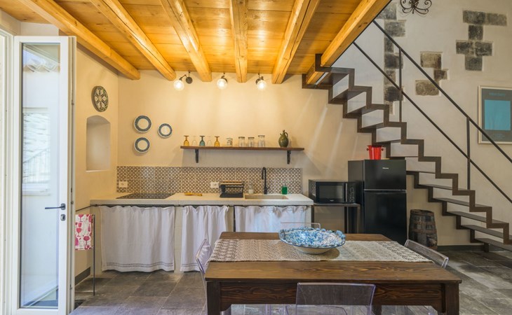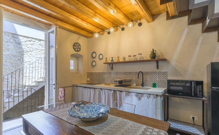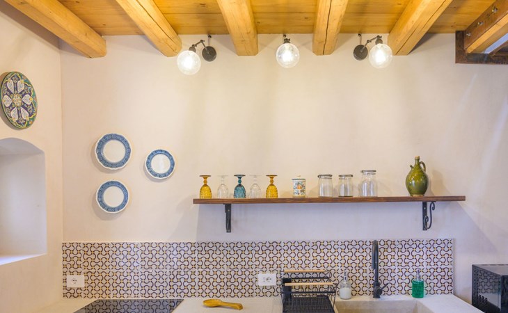 The flat is furnished in an original and refined antique style, with white stone walls, a wooden ceiling and floors in pitch stone and decorated tiles.