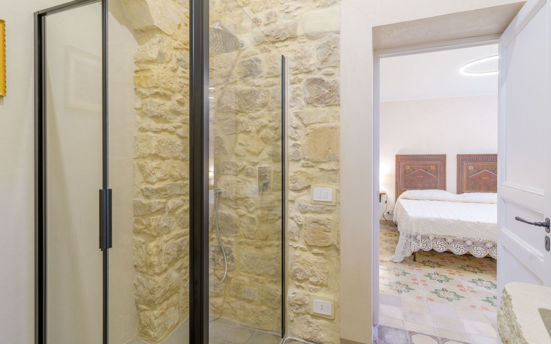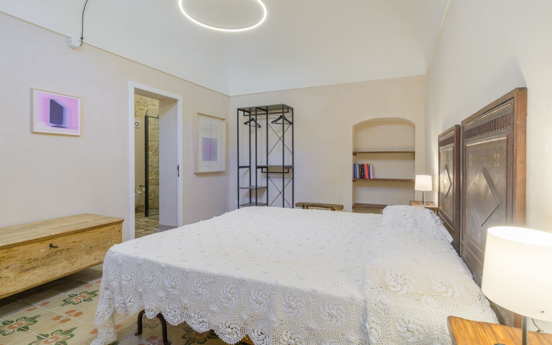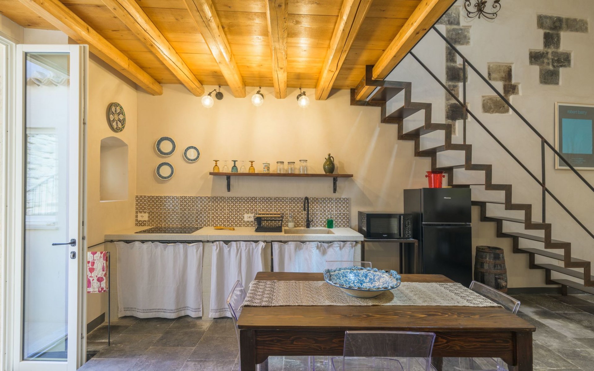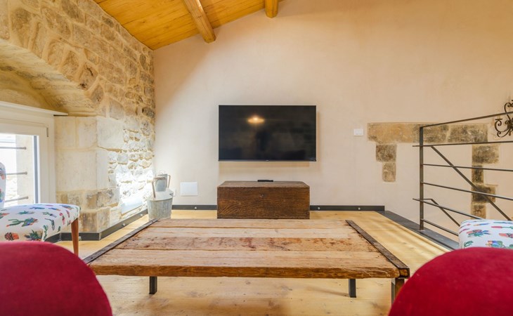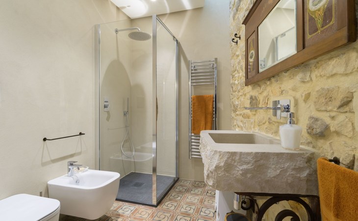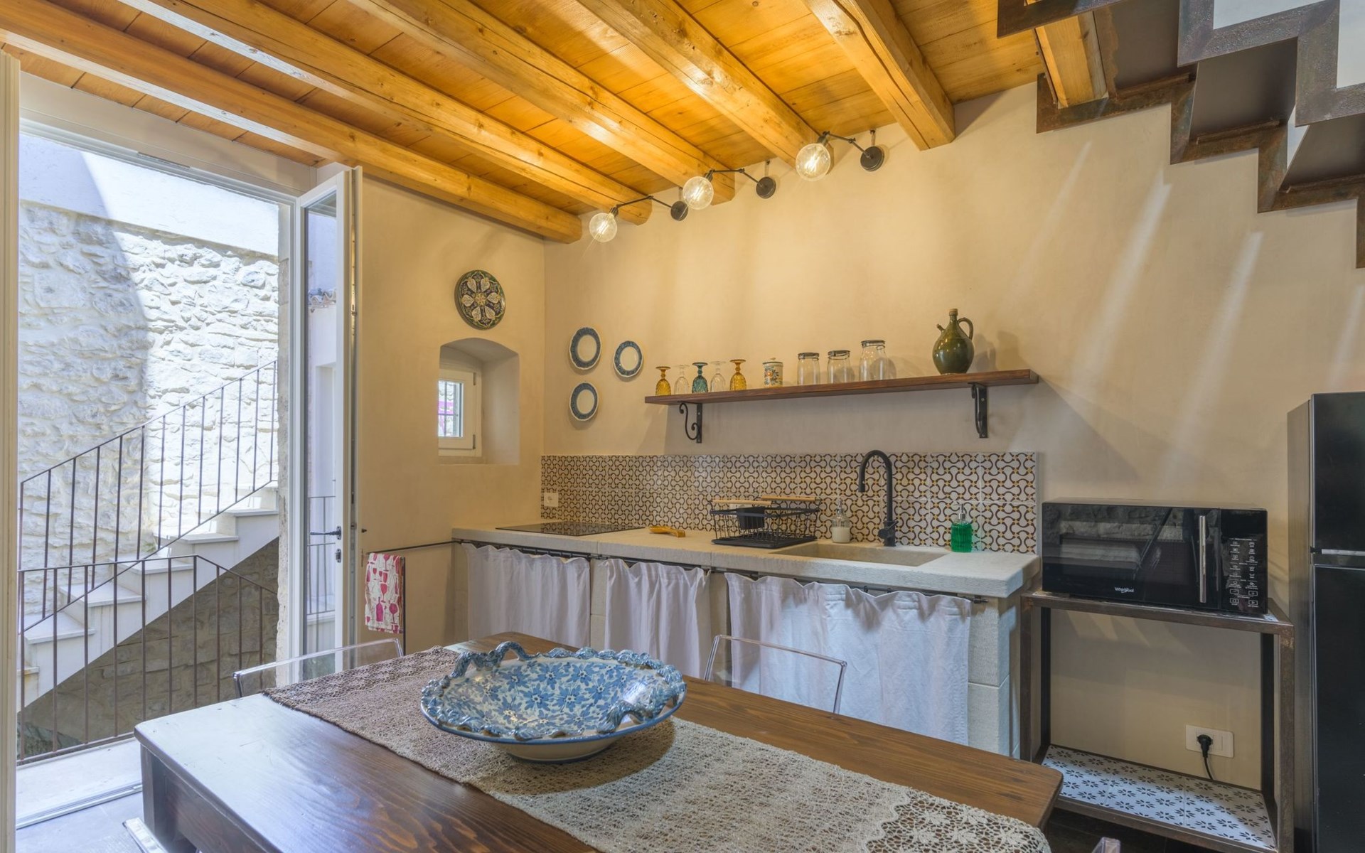 The flat is furnished in an original and refined antique style, with white stone walls, a wooden ceiling and floors in pitch stone and decorated tiles.