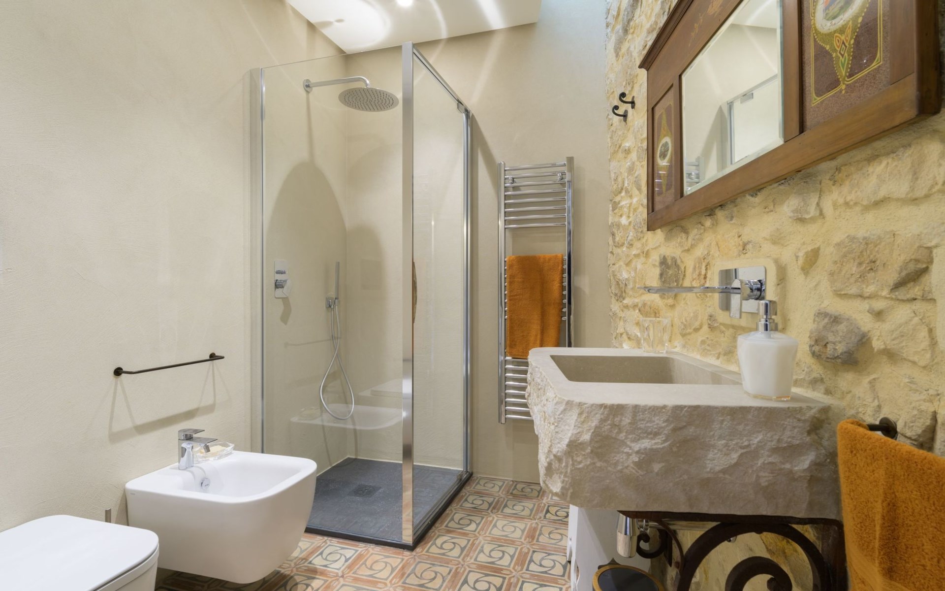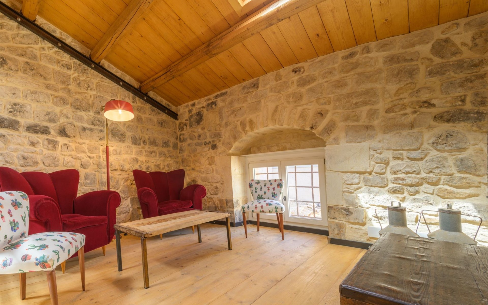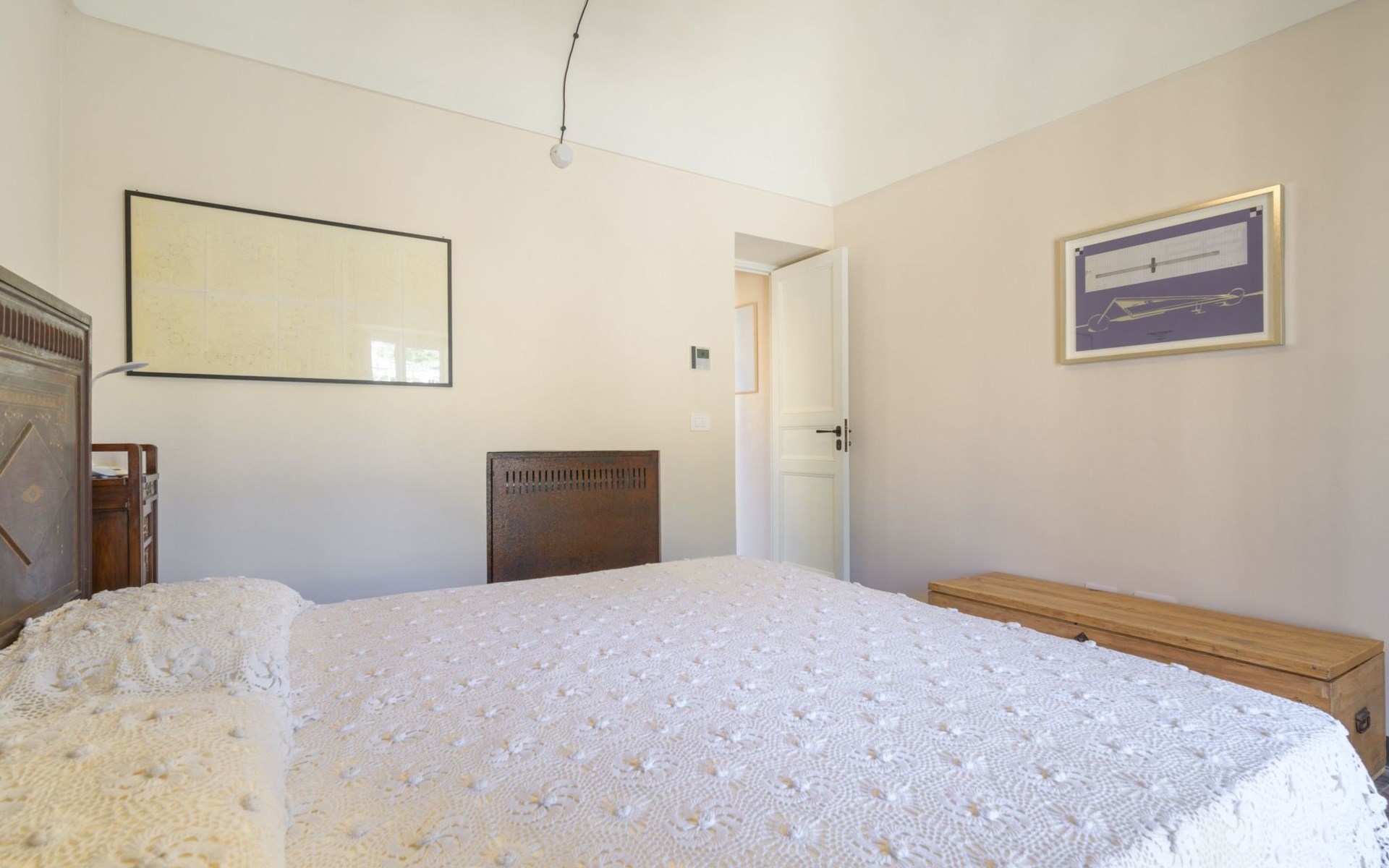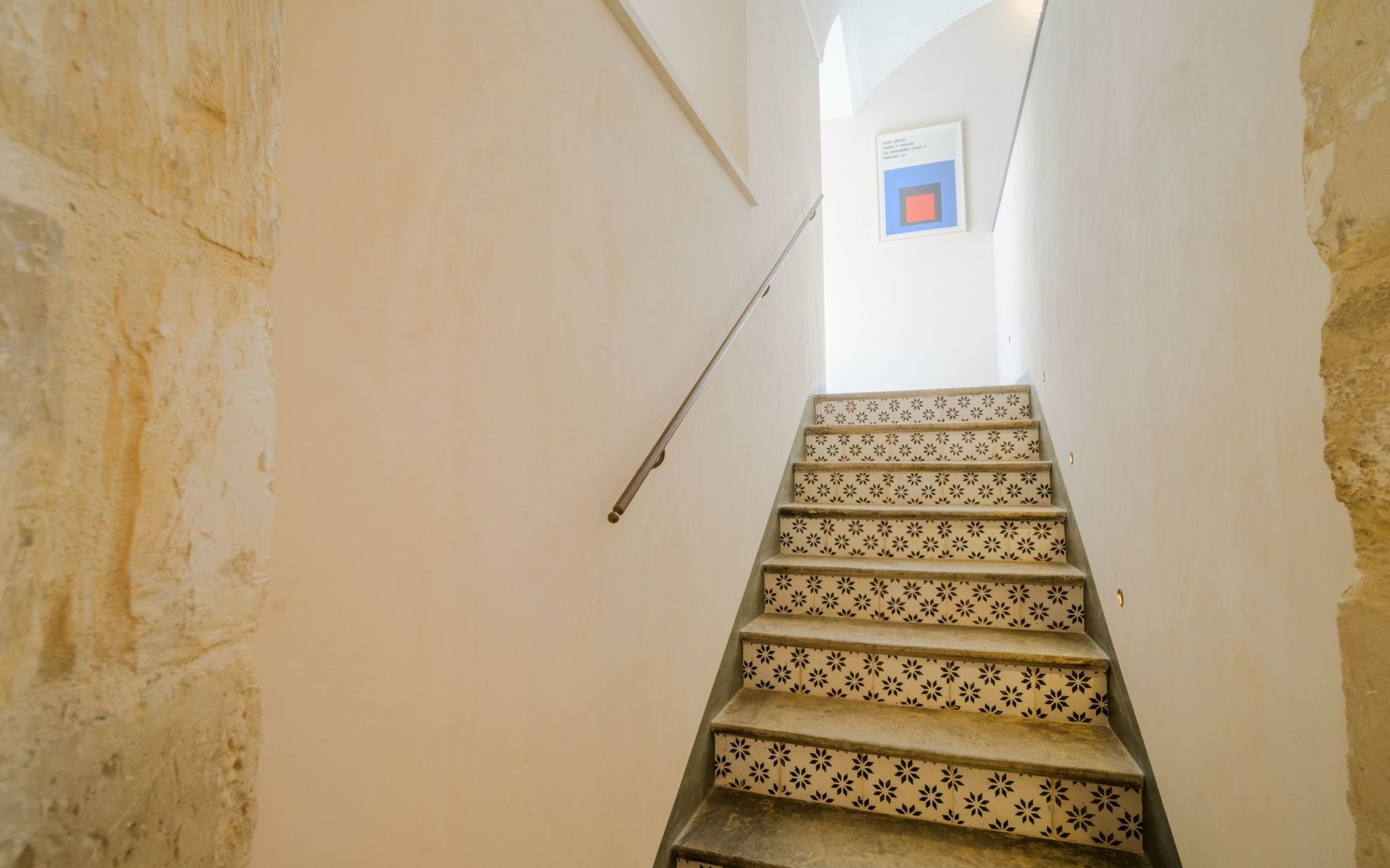 The flat is furnished in an original and refined antique style, with white stone walls, a wooden ceiling and floors in pitch stone and decorated tiles.