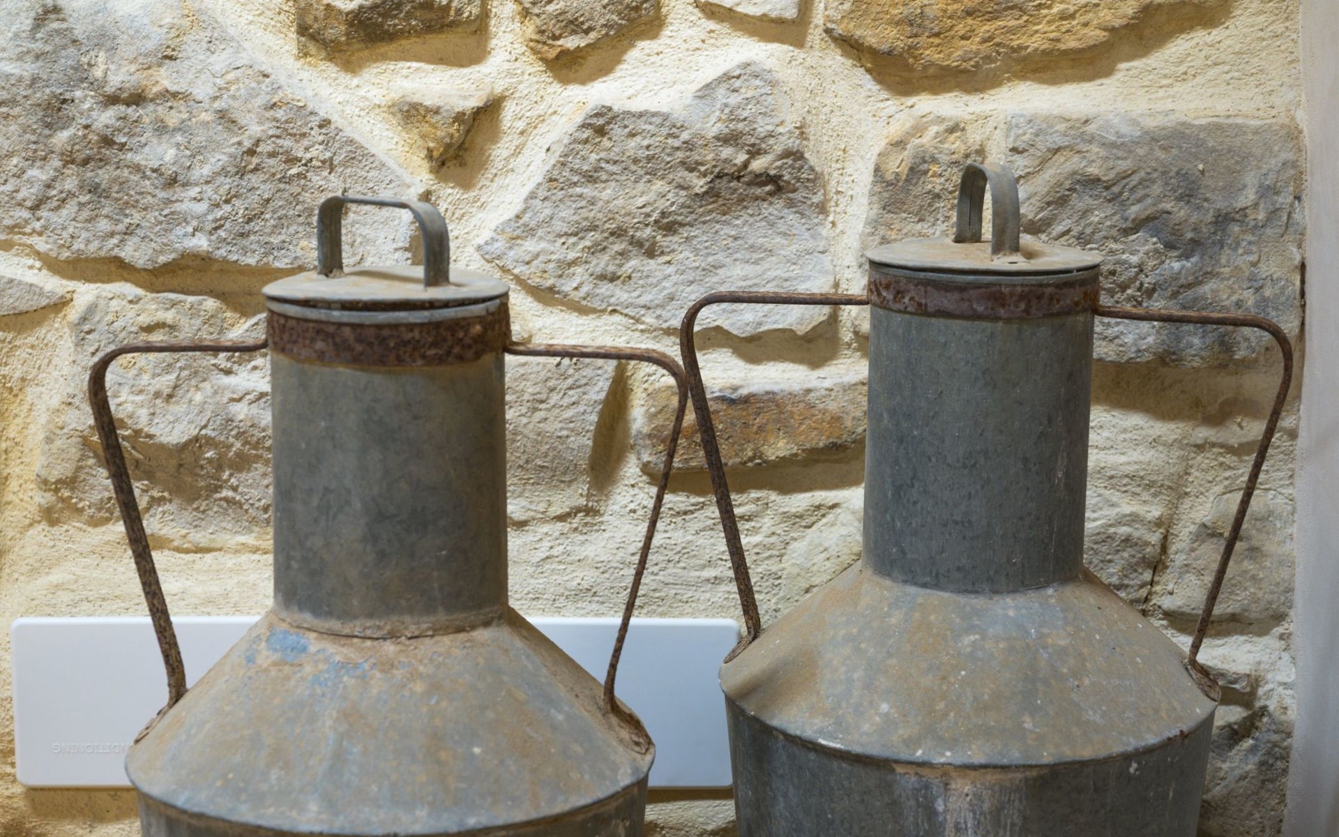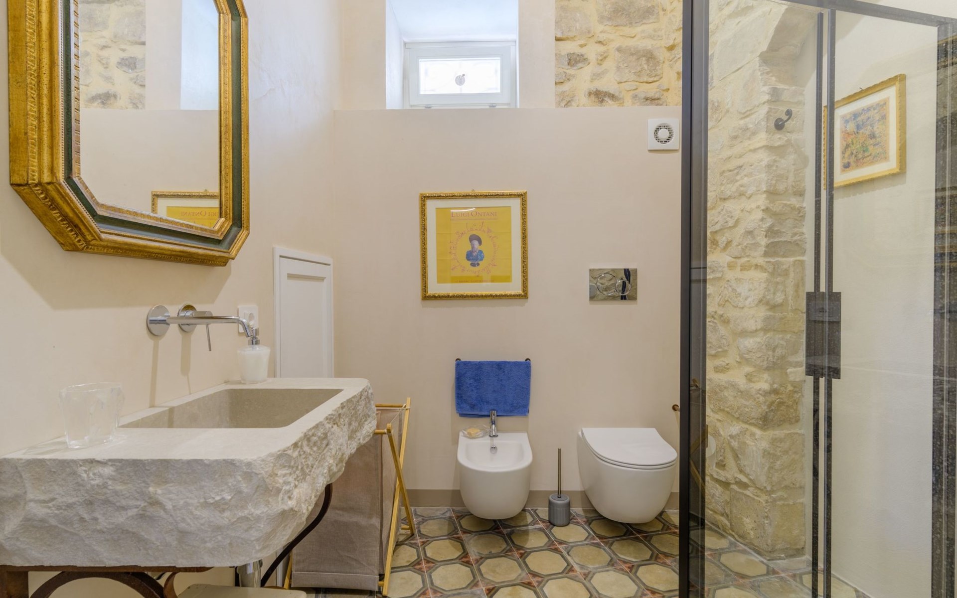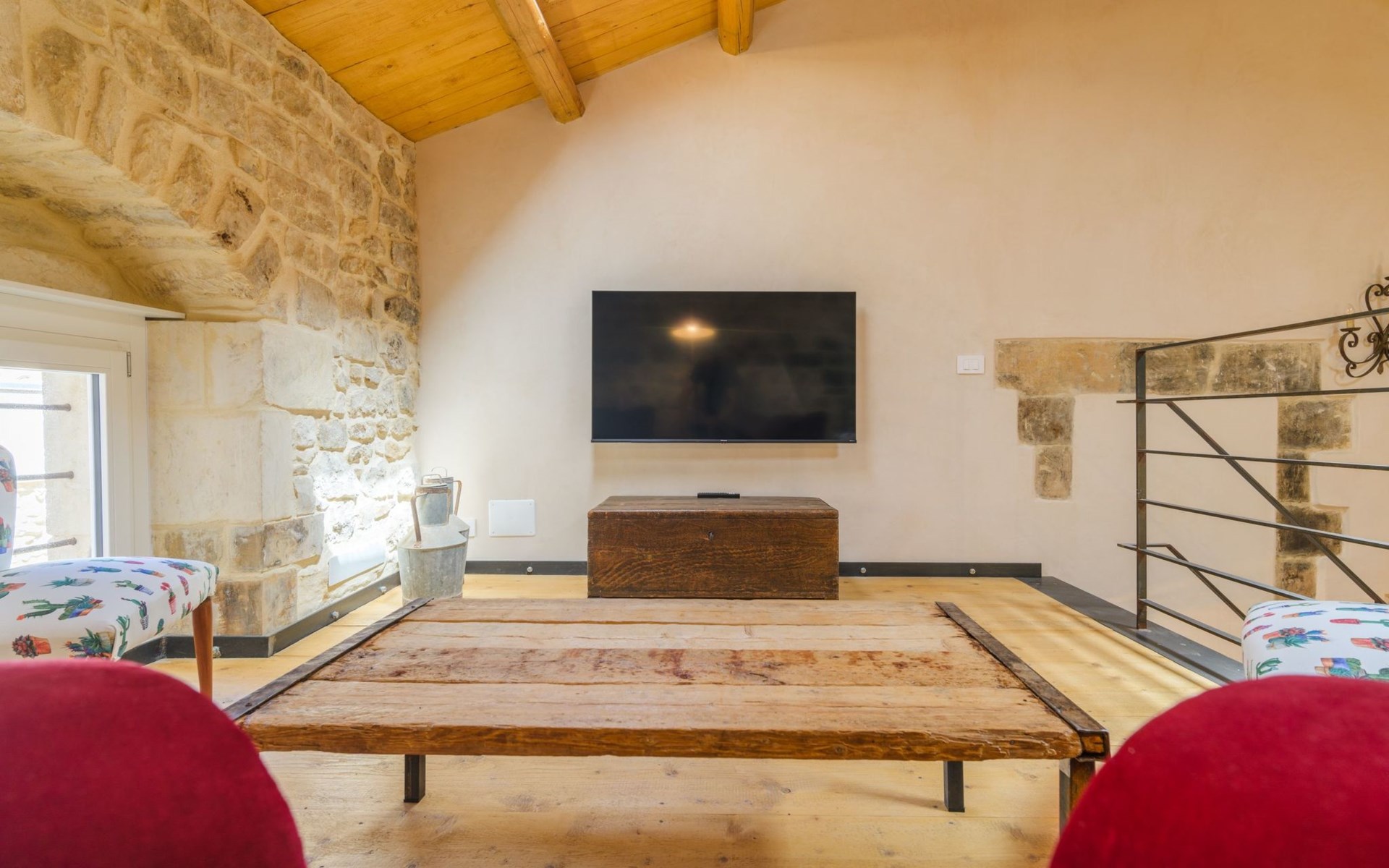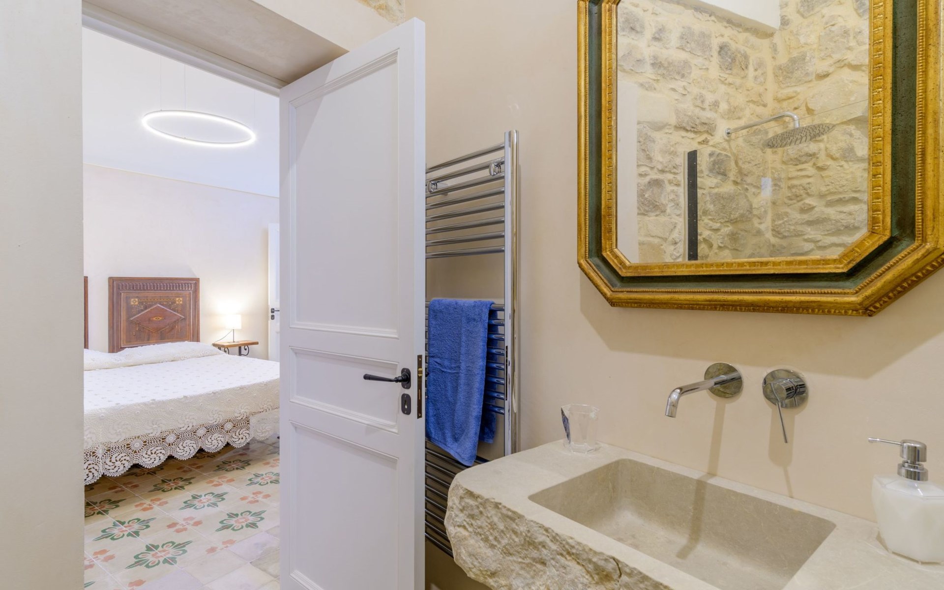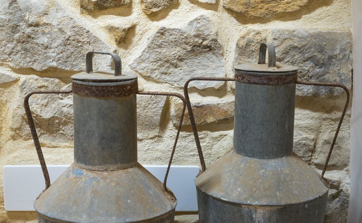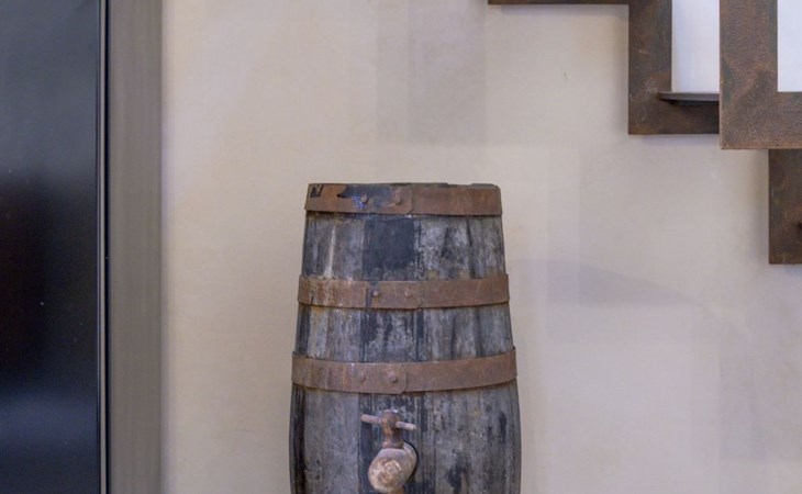 The flat is furnished in an original and refined antique style, with white stone walls, a wooden ceiling and floors in pitch stone and decorated tiles.