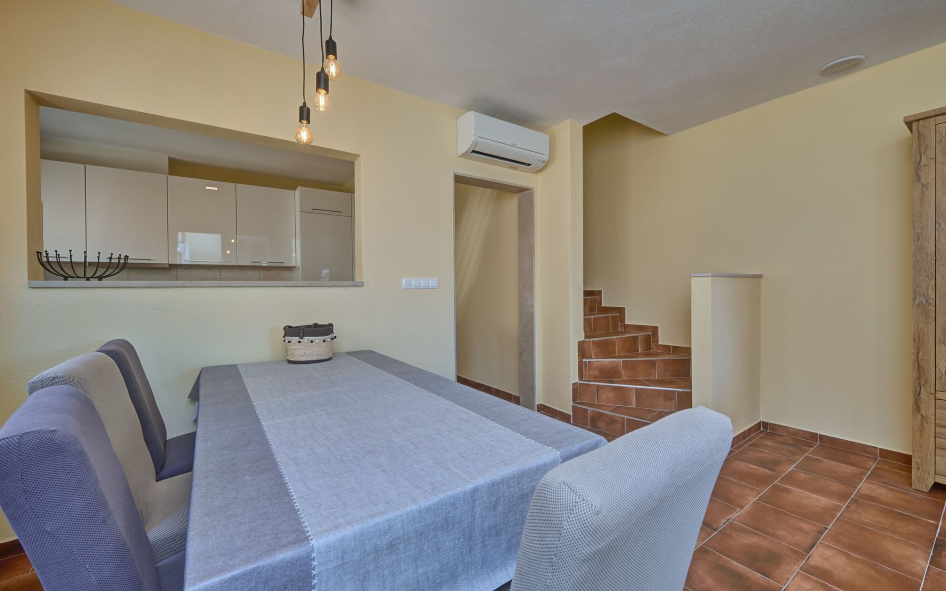 Inside, the holiday home boasts a welcoming interior equipped with air-conditioning throughout, ensuring a pleasant stay regardless of the weather. The living areas are thoughtfully appointed, featuring a satellite flat-screen TV for your entertainment and a seating area where guests can unwind after a day of exploring. The house benefits from two well-sized bedrooms and two bathrooms, offering ample space and convenience for all guests. The kitchen comes fully fitted with a dishwasher, an induction hob, a filter coffee machine, and an electric kettle, alongside other modern amenities such as a washing machine for exclusive use, making it easy to cater to your group's preferences and needs.