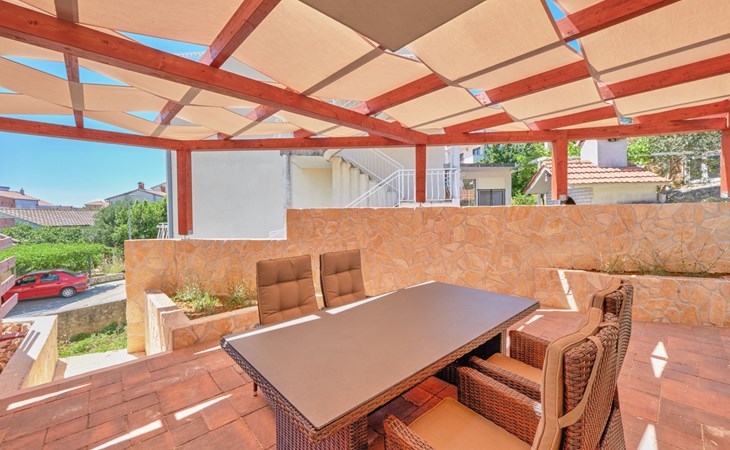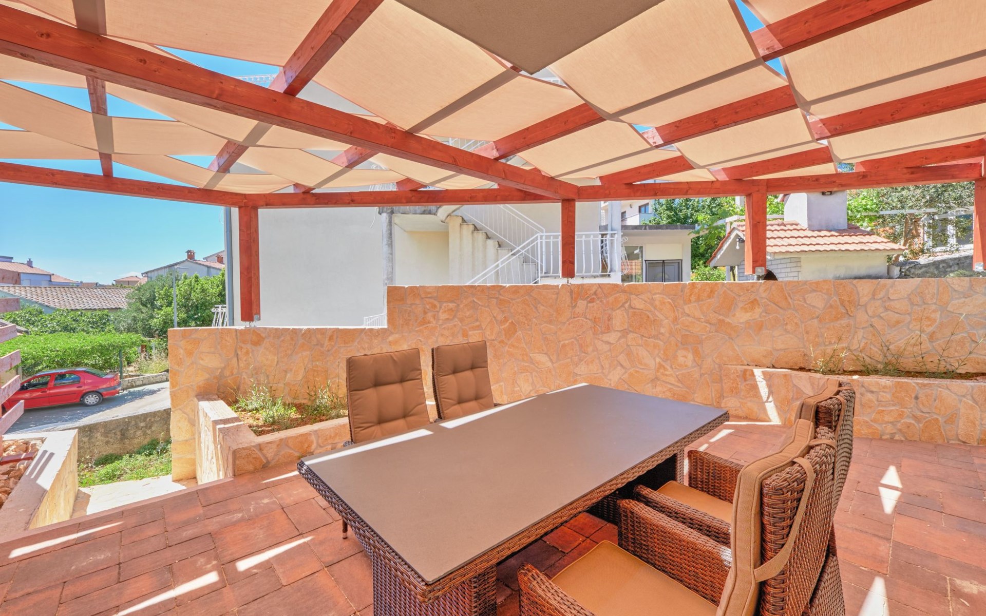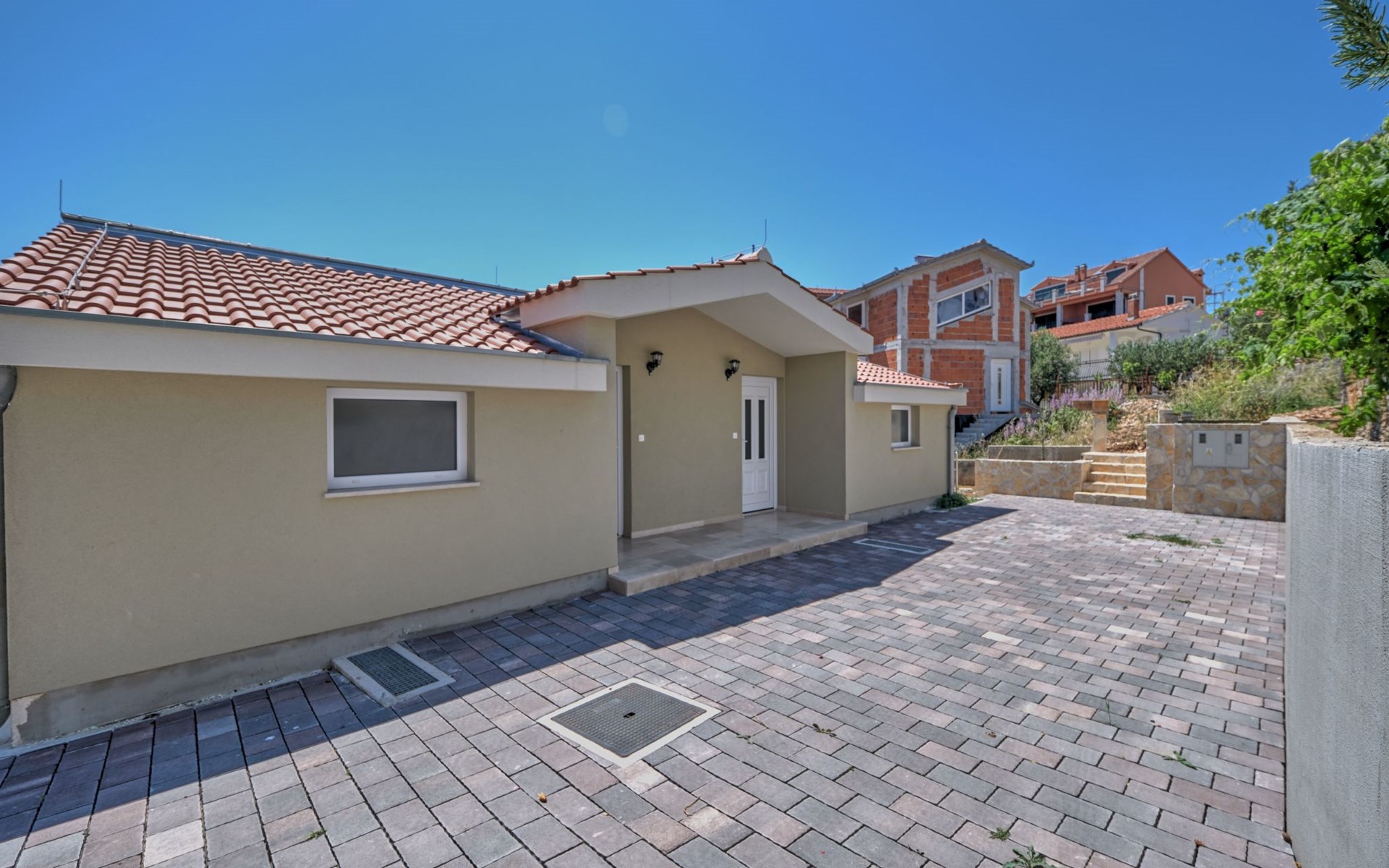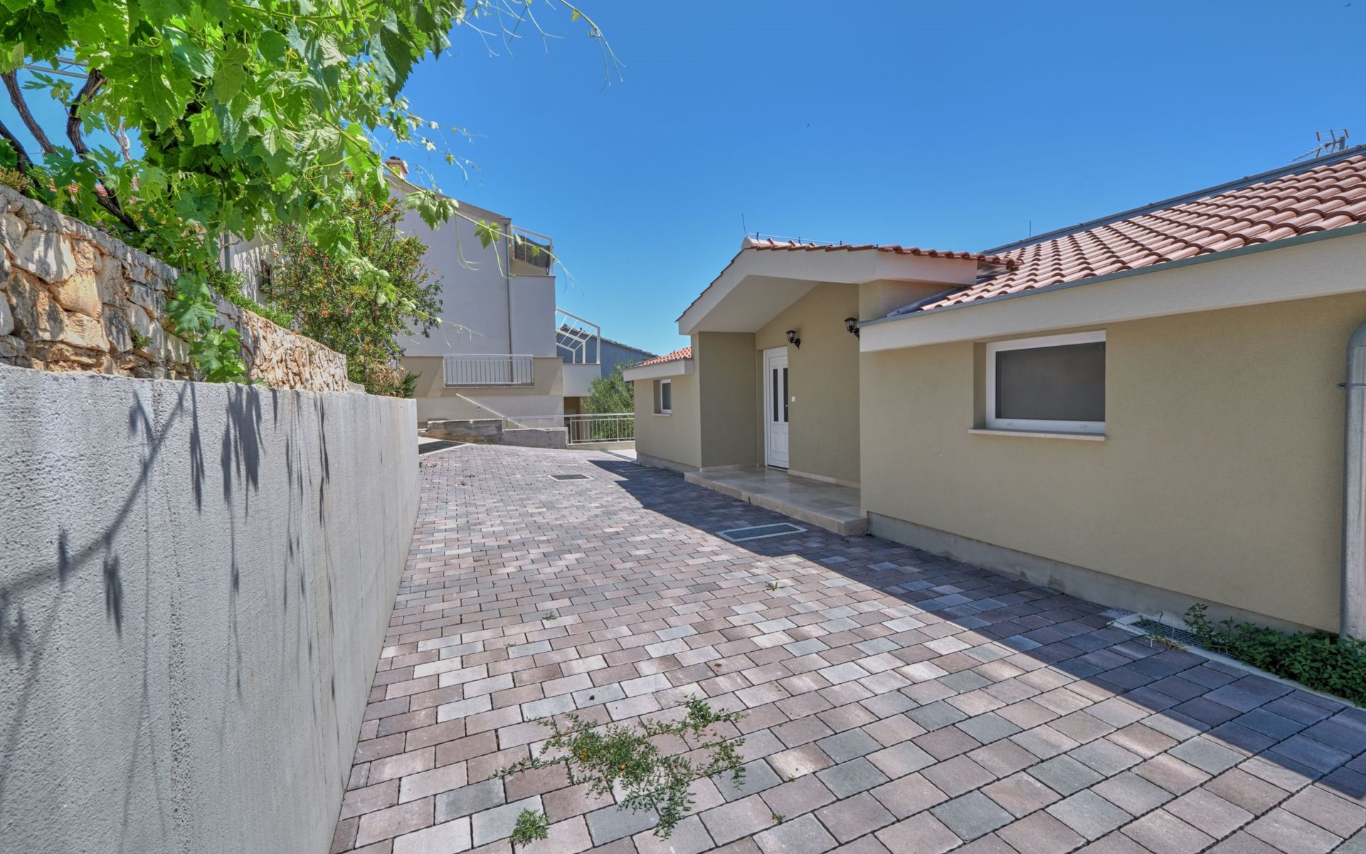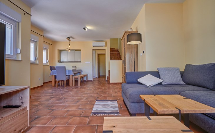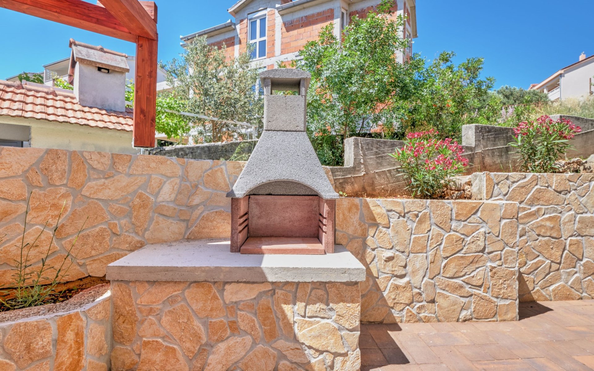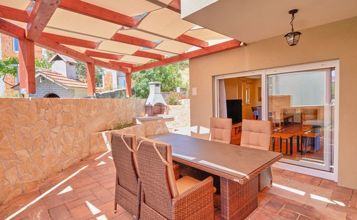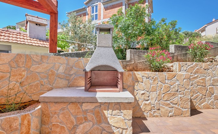 The outdoor area of Anovi Holiday Homes is just as inviting, with a beautifully maintained garden for sole use and a spacious patio ensuring moments of tranquility and leisure. Guests can enjoy the delightful Dalmatian climate, making use of the barbecue facilities available for memorable meals al fresco. With the beach and crystal-clear sea just a 300m walk away, you'll have easy access to sun, sea, and sand whenever you wish.