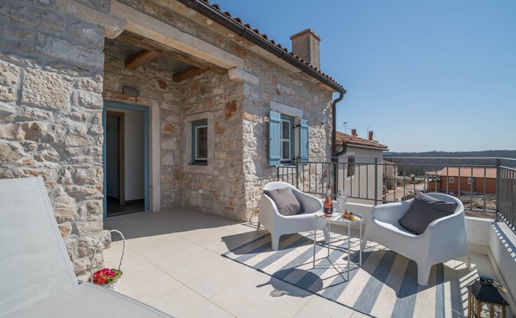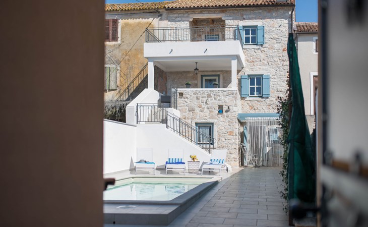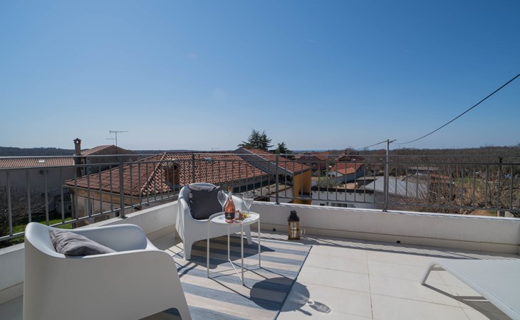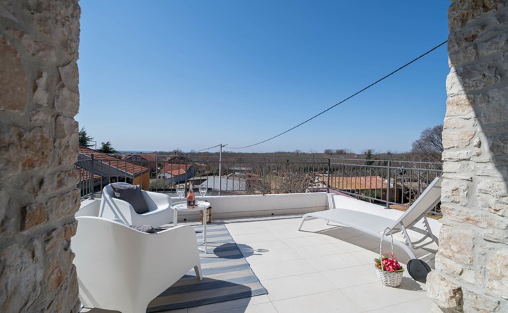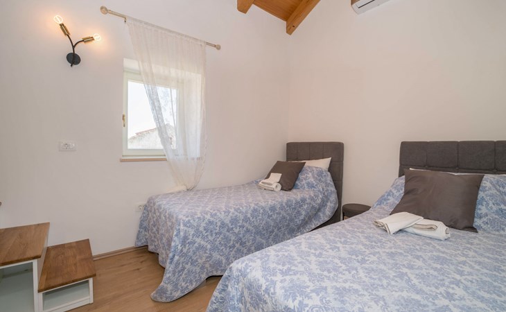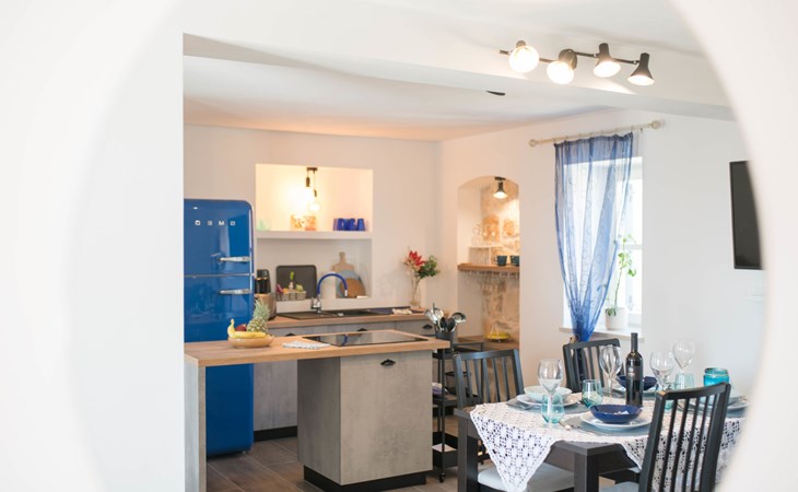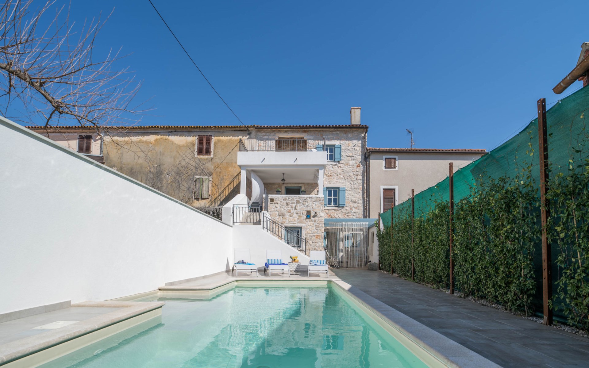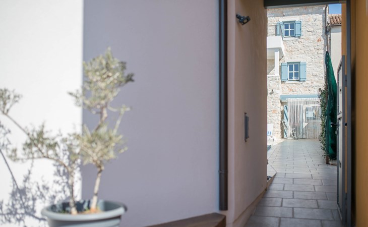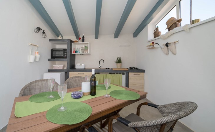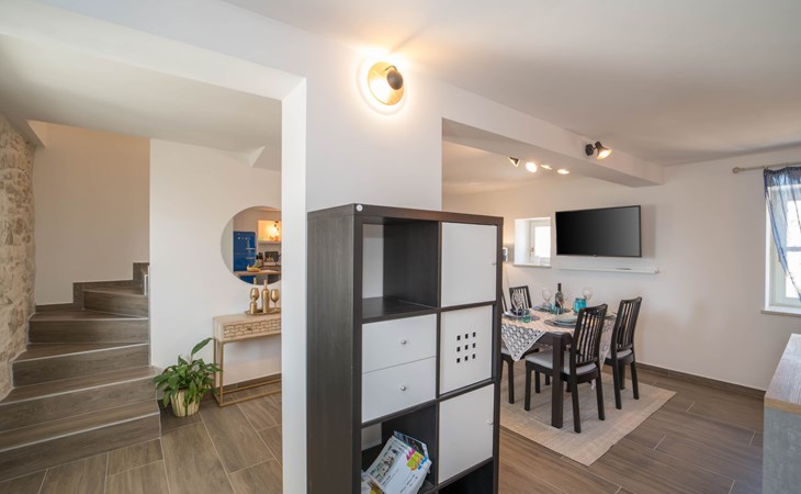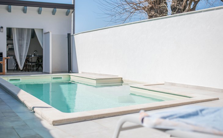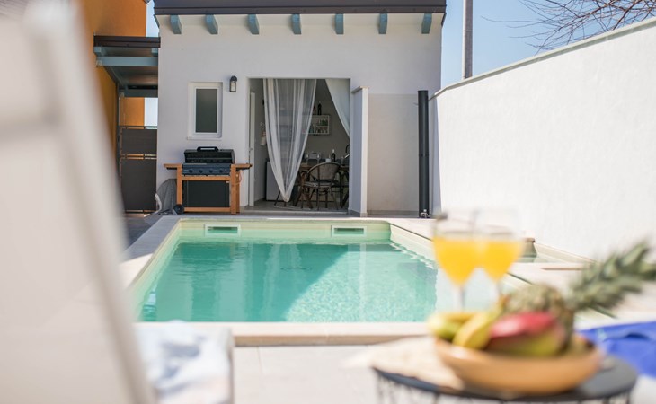 Terraced house "Villa Caterina", 2 storeys, renovated in 2022. In the hamlet Fiorini 8 km from the centre of Novigrad, in a sunny position, 2 km from the sea, 2 km from the beach, in a cul-de-sac. Private: property 200 m2 (fenced), swimming pool angular (15 m2, depth 140 cm, seasonal availability: 01.May. - 30.Sep.). Outdoor shower. In the house: internet access, washing machine. Parking (for 2 cars) at the house on the premises. Shop 6 km, restaurant 50 m, bus stop 2.4 km, pebble beach 2 km, rocky beach 2 km. Walking paths from the house 50 m, cycle lane 100 m, children's playground 200 m. Please note: the owner lives in the same residence. The owner is at guests' disposal for pool cleaning and property maintenance. Private: outdoor kitchen (2 hot plates, oven, microwave, fridge). Organizing a party is not allowed. Swimming pool heated (extra).