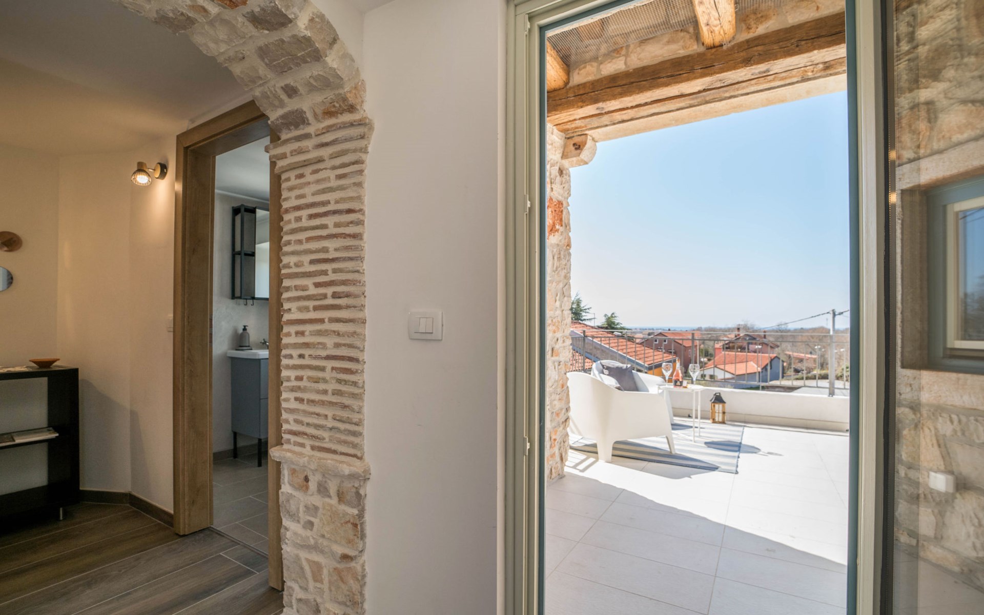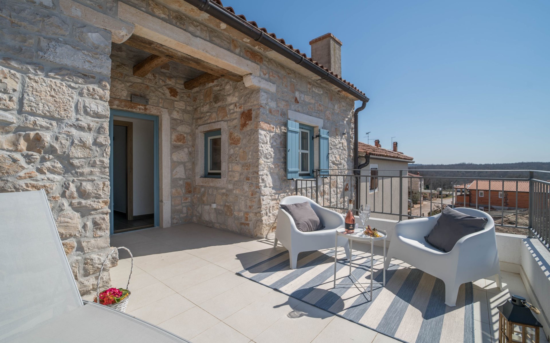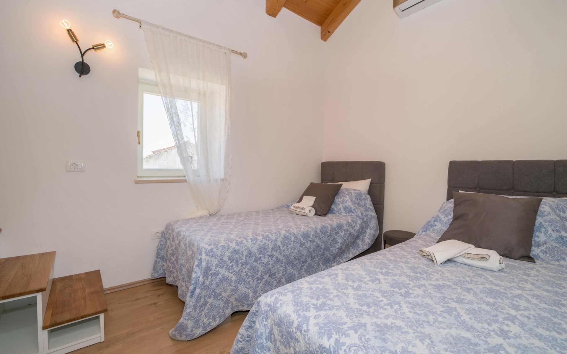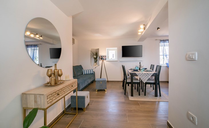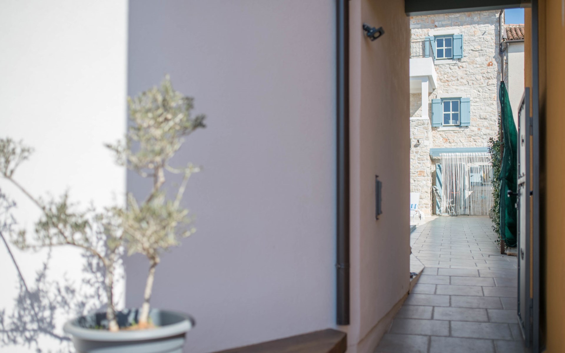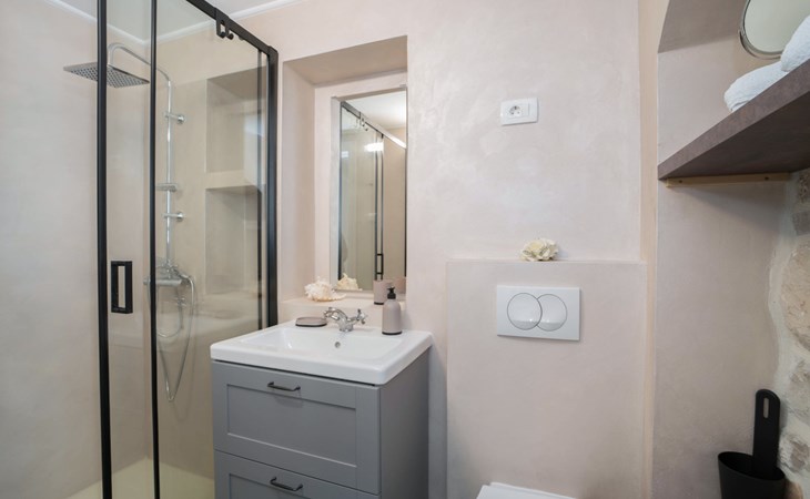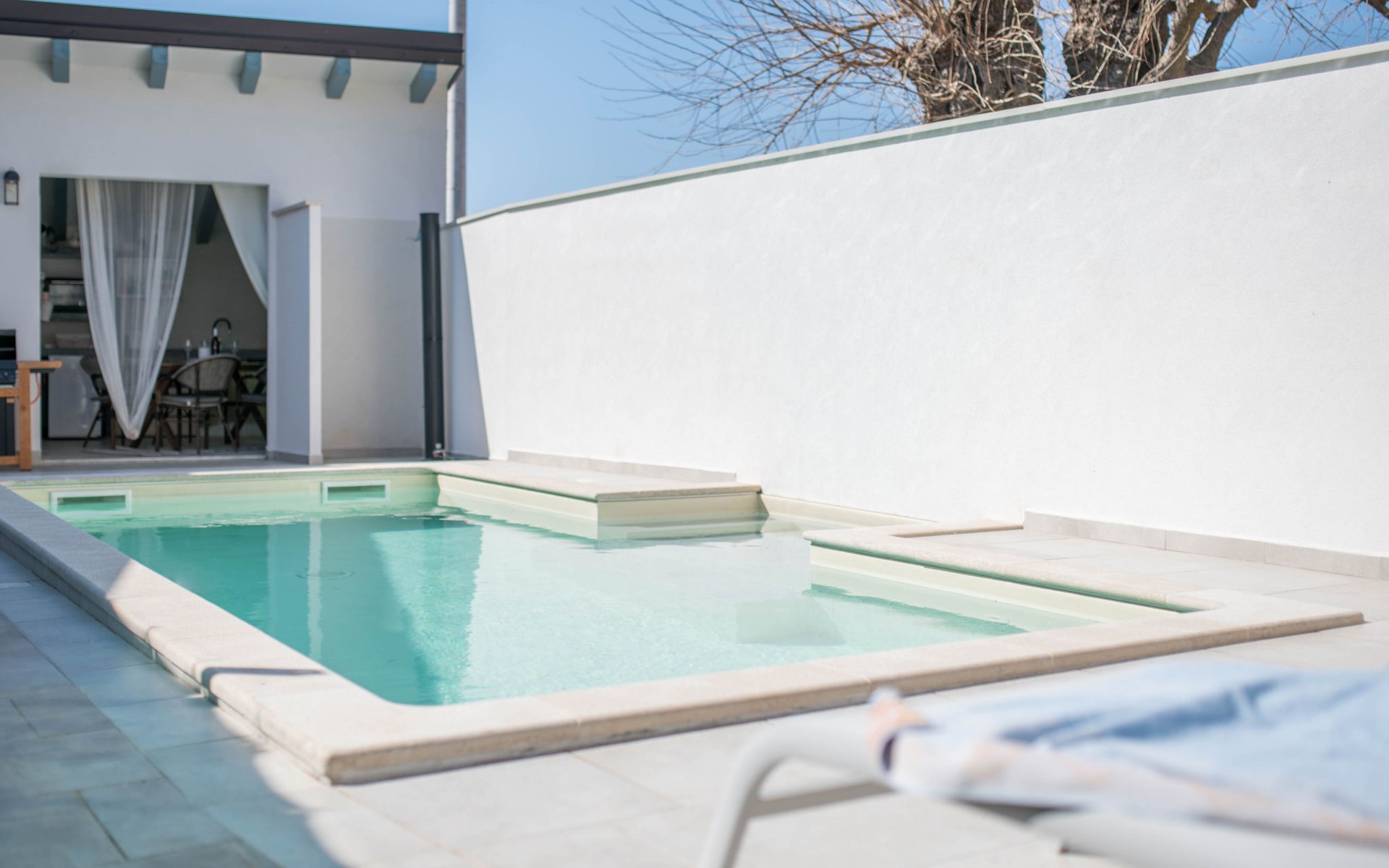 Terraced house "Villa Caterina", 2 storeys, renovated in 2022. In the hamlet Fiorini 8 km from the centre of Novigrad, in a sunny position, 2 km from the sea, 2 km from the beach, in a cul-de-sac. Private: property 200 m2 (fenced), swimming pool angular (15 m2, depth 140 cm, seasonal availability: 01.May. - 30.Sep.). Outdoor shower. In the house: internet access, washing machine. Parking (for 2 cars) at the house on the premises. Shop 6 km, restaurant 50 m, bus stop 2.4 km, pebble beach 2 km, rocky beach 2 km. Walking paths from the house 50 m, cycle lane 100 m, children's playground 200 m. Please note: the owner lives in the same residence. The owner is at guests' disposal for pool cleaning and property maintenance. Private: outdoor kitchen (2 hot plates, oven, microwave, fridge). Organizing a party is not allowed. Swimming pool heated (extra).