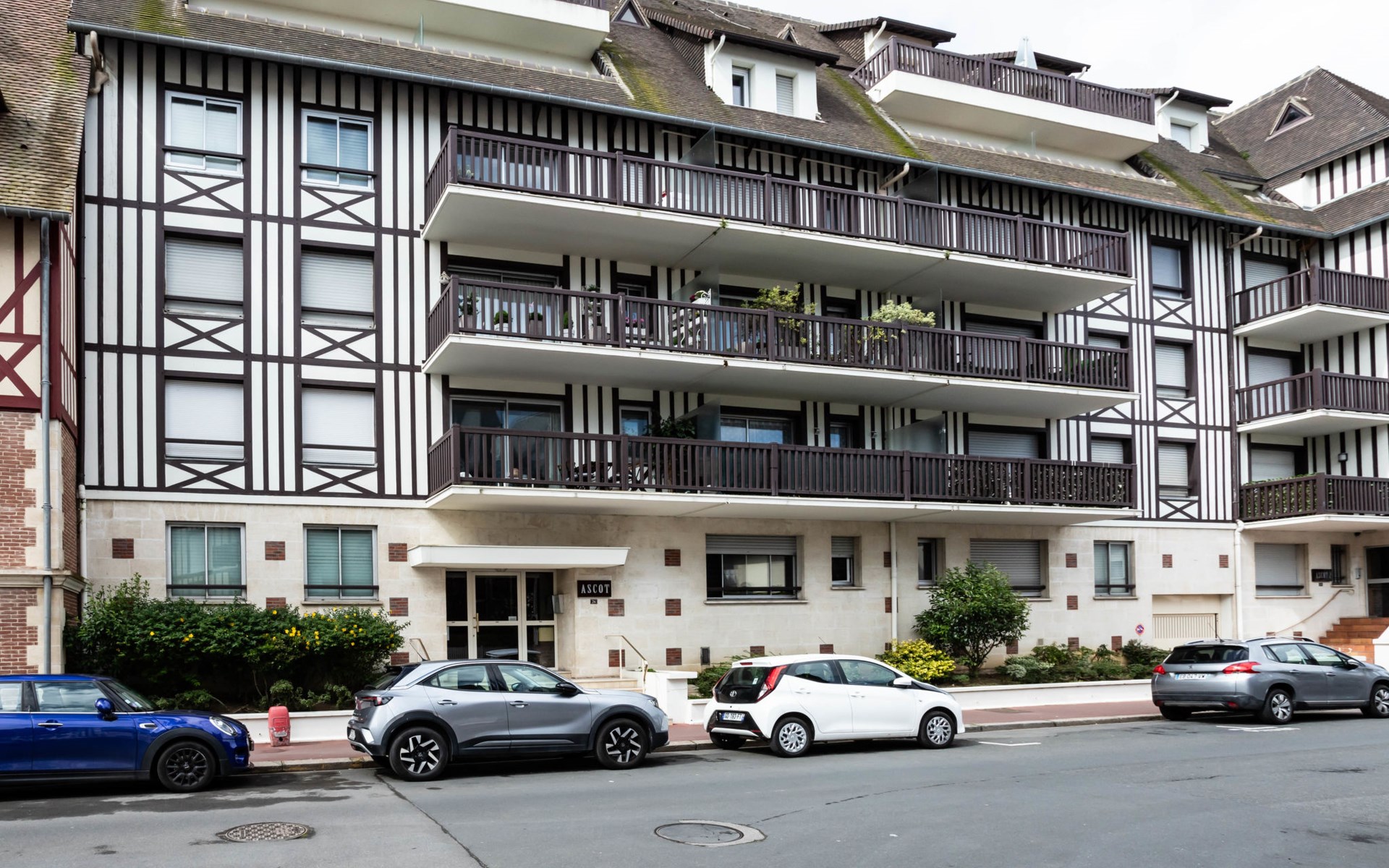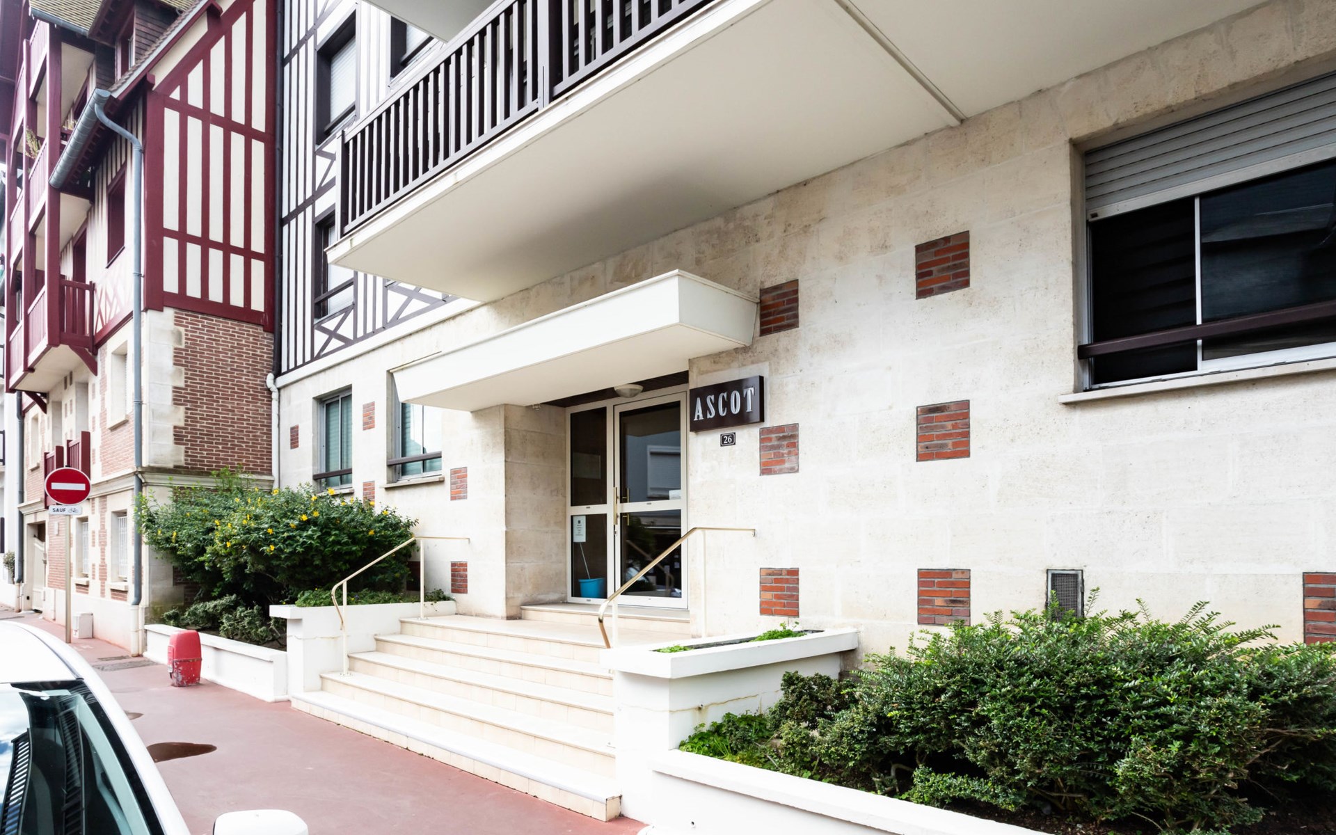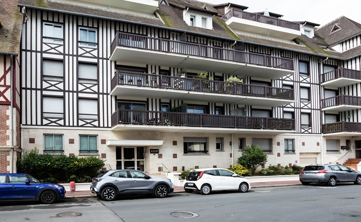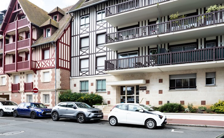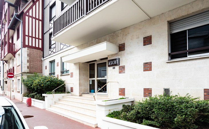 Deauville: Residence "Ascot", 3 storeys, terraced. In the resort, 350 m from the centre, in a quiet position, 1.4 km from the sea, 1.4 km from the beach, east facing position. In the complex: lift. (6 steps). Shop 350 m, supermarket 280 m, restaurant 100 m, bakery 60 m, 4 minute walk to the centre, bus stop "Gare routière" 500 m, railway station "Deauville-Trouville" 500 m, sandy beach "les planches de Deauville" 1.4 km, indoor swimming pool 1.1 km, thermal baths "thalasso de Deauville" 1.1 km. Golf course (18 hole) 3.7 km. Nearby attractions: casino de Deauville 1 km, hippodrome Deauville La Touques 1.2 km, Honfleur village normand 16 km, Mémorial de Caen 54 km, Arromanches plage du débarquement 80 km. The keys‘ handover takes place by the agency Interhome in Deauville.