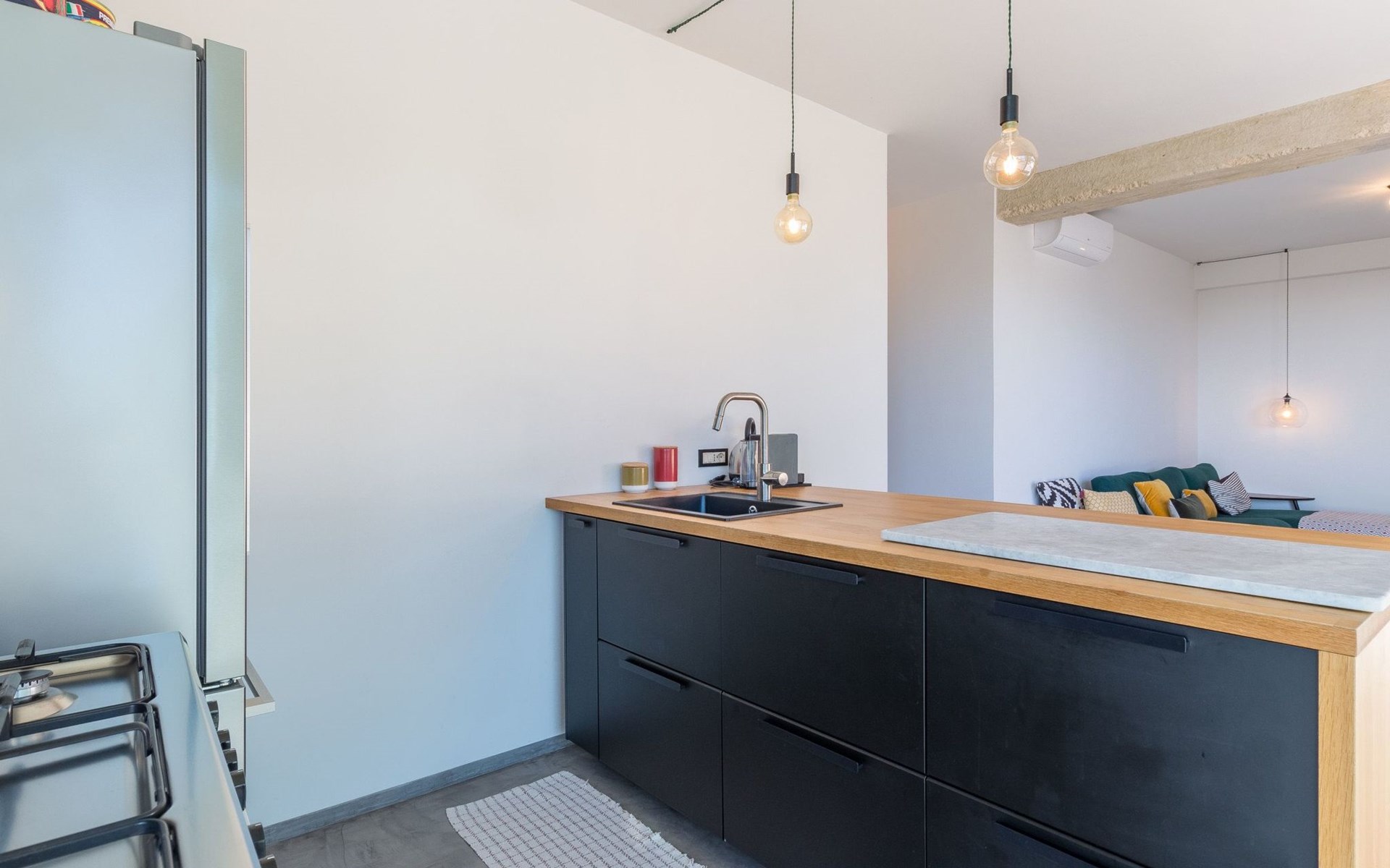 The living room-kitchen enjoys a panoramic view and is furnished with a sofa, TV and Bluetooth stereo speaker.