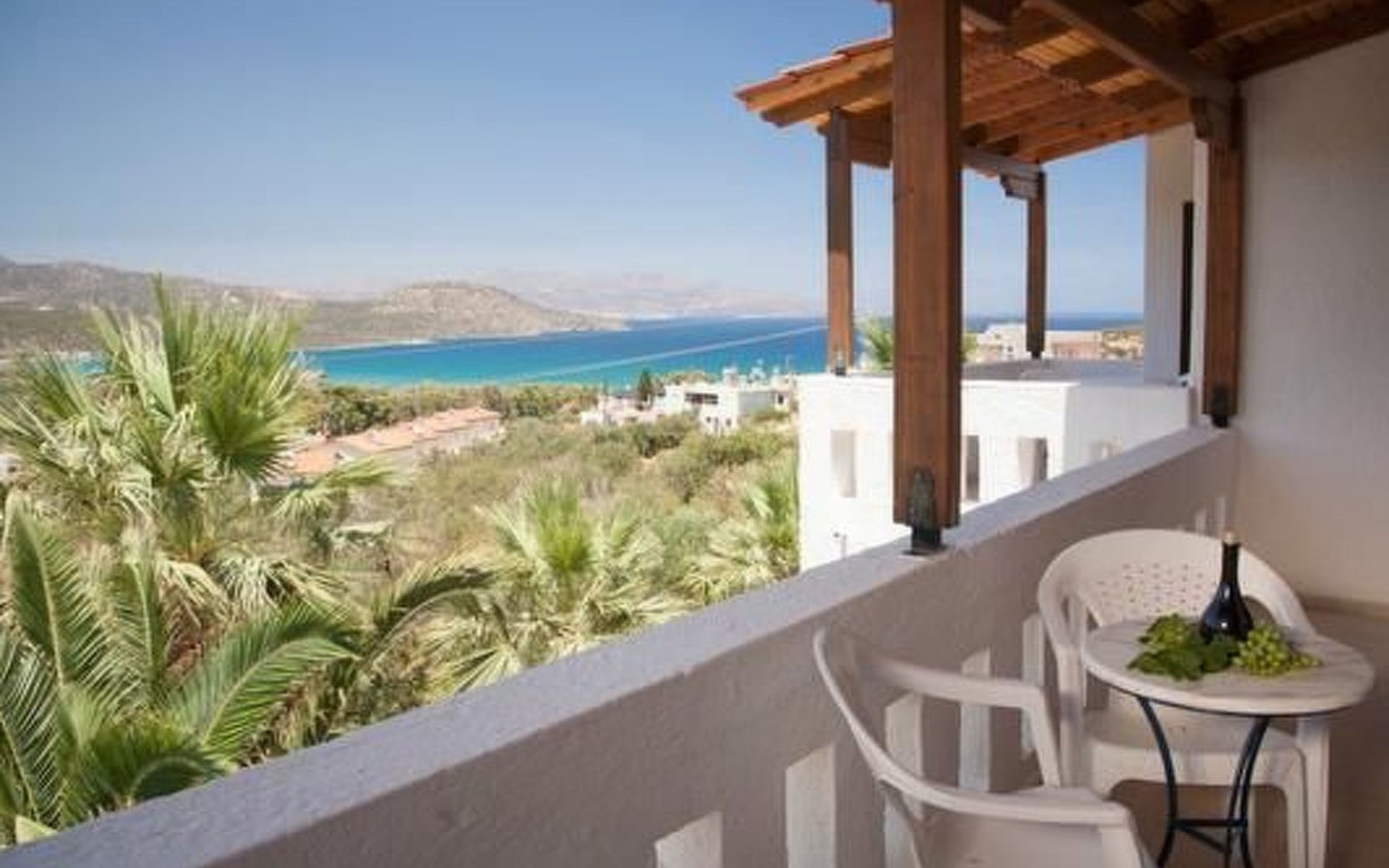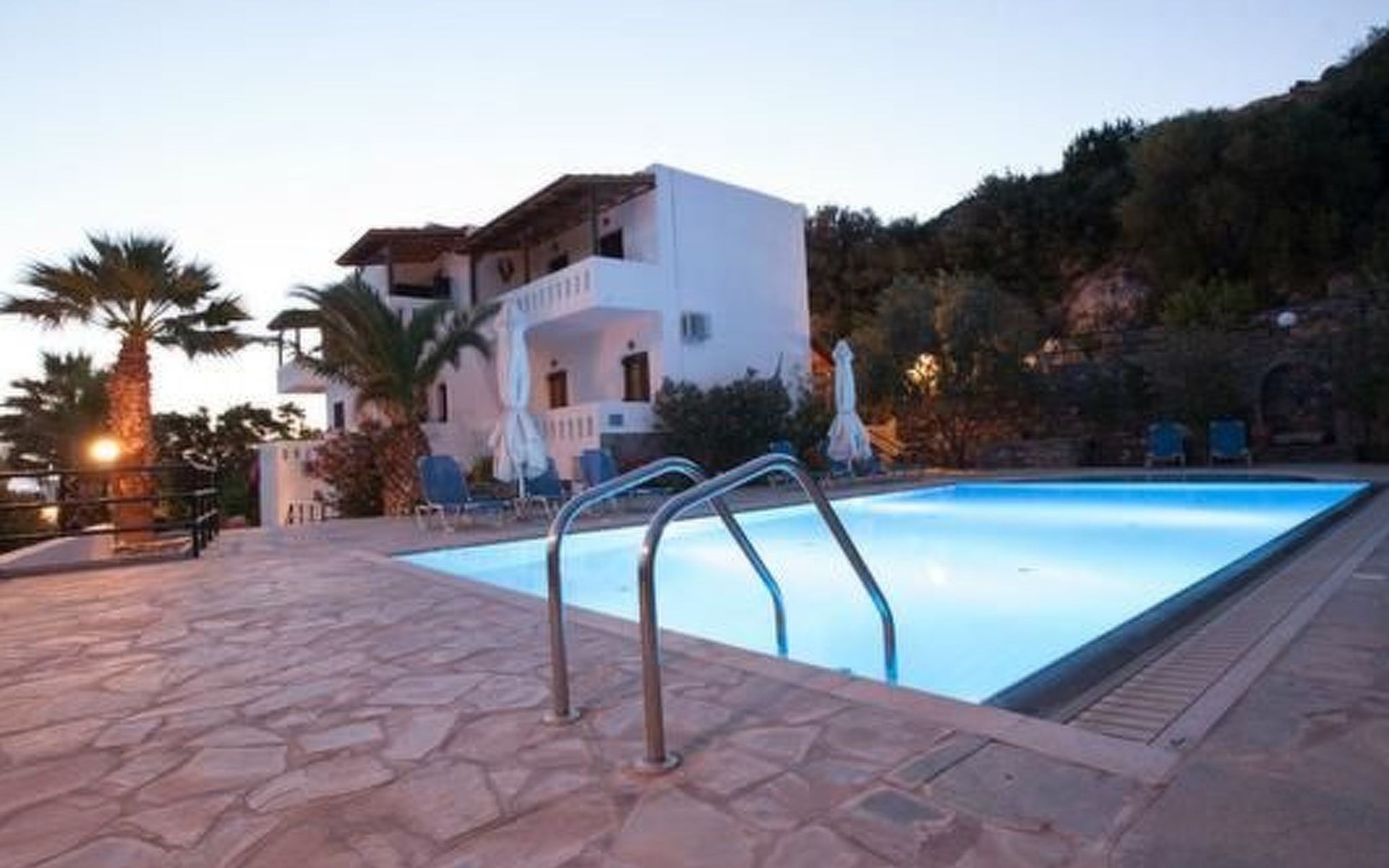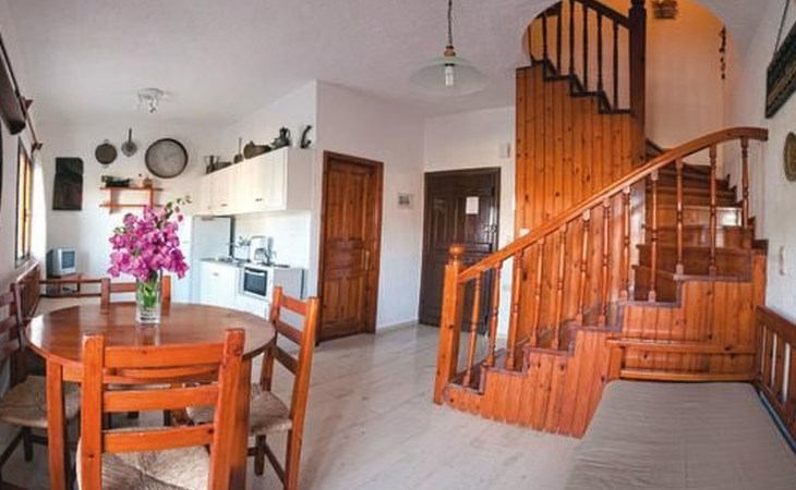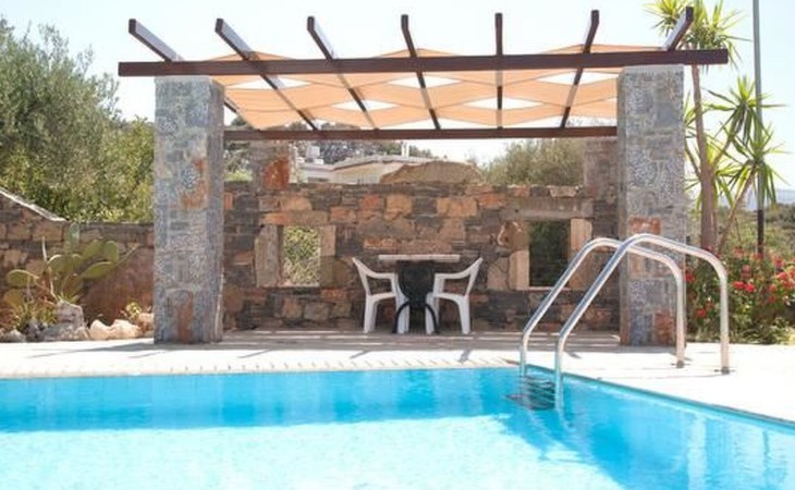 Following the charming and picturesque coastal road from Agios Nikolaos (11 km) parallel to the Mediterranean Sea, passing inviting coves alternating with breathtaking views to small islands and delightful sandy beaches you reach the village of Kalo Chorio and its coastal quarter "Istron". Our house is nestled into an enchanting countryside that invites to extended walks or hiking through the landscape of the rising hills and mountains which are covered mostly with cedar trees. The house was built in the midst of a large property (4.500 m²), quietly located on the side of a hill. The terraced garden, planted with colorful flowers, decorative shrubbery and different fruit trees (Mandarin-, Orange-, Apricot-, Lemon-, Olive- and Banana trees) extends harmoniously into the rocky backdrop of the hill, enhancing the majestic feeling of the house. On an area of 500 m² a swimming pool, including a wading pool for children, was added. Magnificent views and the alluring countryside surprise you over and over and draw you under their spell. Guests on this property are spoiled by unique panoramic views to the countless coves of the Mirabello Bay all the way to Agios Nikolaos. Every apartment has a Safe, W-Lan and an air conditioning unit. Balconies and Patios, all covered by pergolas, are equipped with table and chairs. The furnishings in the house are made of solid wood, bathrooms and kitchen are tiled and all the floors are laid out with white marble. Every apartment includes a TV-set. In the garden you also find a grill area next to a stone built, traditional Greek oven in which bread can be baked as well as other typically Greek food. The adjoining marble table and benches invite you to rest and to enjoy the just prepared food under the shading trees caressed by the fragrant air. Another delight is the splendid view from up here to the Mediterranean Sea that will stay in your memory for a long time. Children can play freely on this enclosed property and romp the garden to their hearts content (a sandbox is also available for their use). Various large and small coves alternate with each other and offer either pebbled or sandy beaches. About 650 m from the house you reach the first beach - half of it is sandy, the other half with pebbles. Everyday you have the opportunity to venture out and discover something new. Because of its location a good starting point to visit Minoan palaces, remote monasteries, Byzantine churches, caves, grottos and many enchanting natural sights. Villa Michalis 3 for 4-5 Pers. This is an attached two-story house. Located on the ground floor is the living room whose extension includes the kitchen. This spacious area is in addition to other furnishings also supplied with a TV and a large Cretan sofa (sleeping for the 5th person). From two sides of the house you have access to the patios - one with view to the mountains, the other with view towards the Mediterranean. The bathroom is also to be found on this level. A staircase leads from the living room to the upper floor of the house with 2 bedrooms (one with double bed, the other with 2 single beds). Both bedrooms extend to a large balcony with exhilarating views.Short description 1Number of kitchens : 1SurroundingNearby sports facilities : Canoeing, Diving, Fishing, Rowing, Sailing, Surfing, Water skiingRental Facilities : Bicycle rental service, car rentalGarden and outdoorGarden facilities : Garden furniture provided, Grill, PavilionOn-site leisure facilities : Outdoor swimming pool shared use, Swimming pool