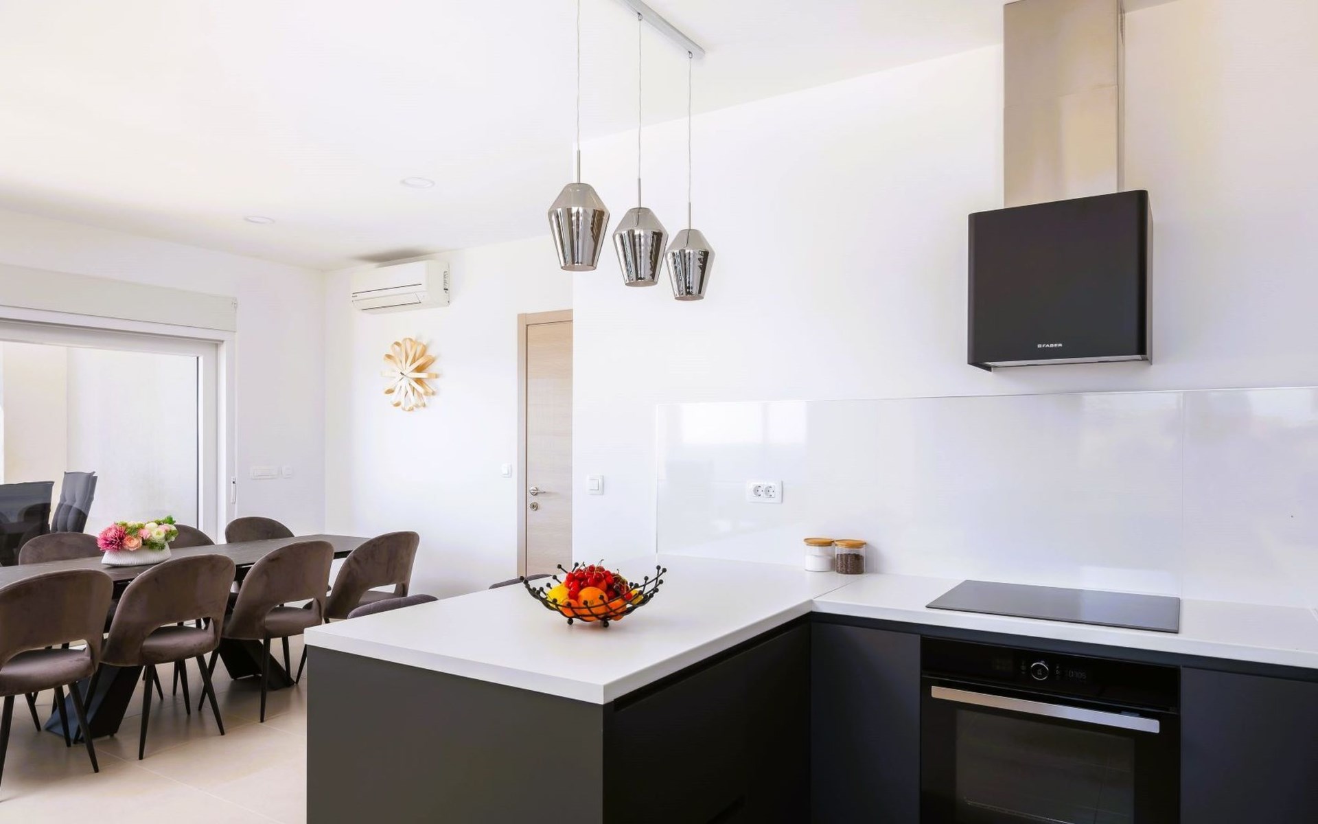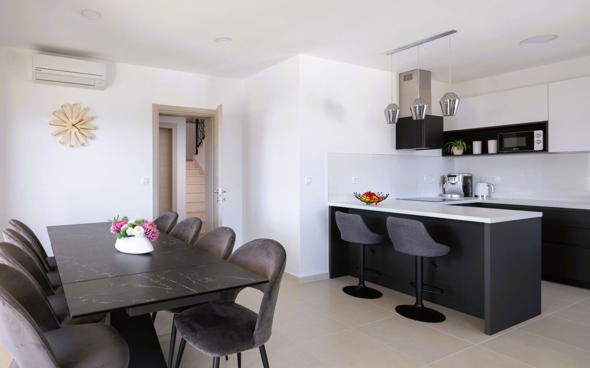 Inside, the villa is fully equipped to meet your needs, featuring air conditioning throughout to provide a cool retreat from the warm Mediterranean climate. With four well-appointed bedrooms and five bathrooms, each guest is assured privacy and convenience. The house features a washing machine for your sole use, ensuring that all the comforts of home are at your fingertips. The kitchen is equipped with modern appliances including a dishwasher, a coffee machine compatible with capsules/pods, and an electric kettle, all designed to make your stay as comfortable and hassle-free as possible.