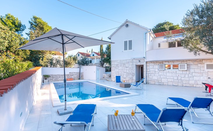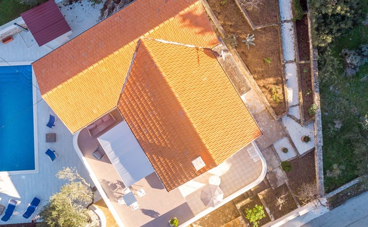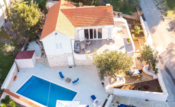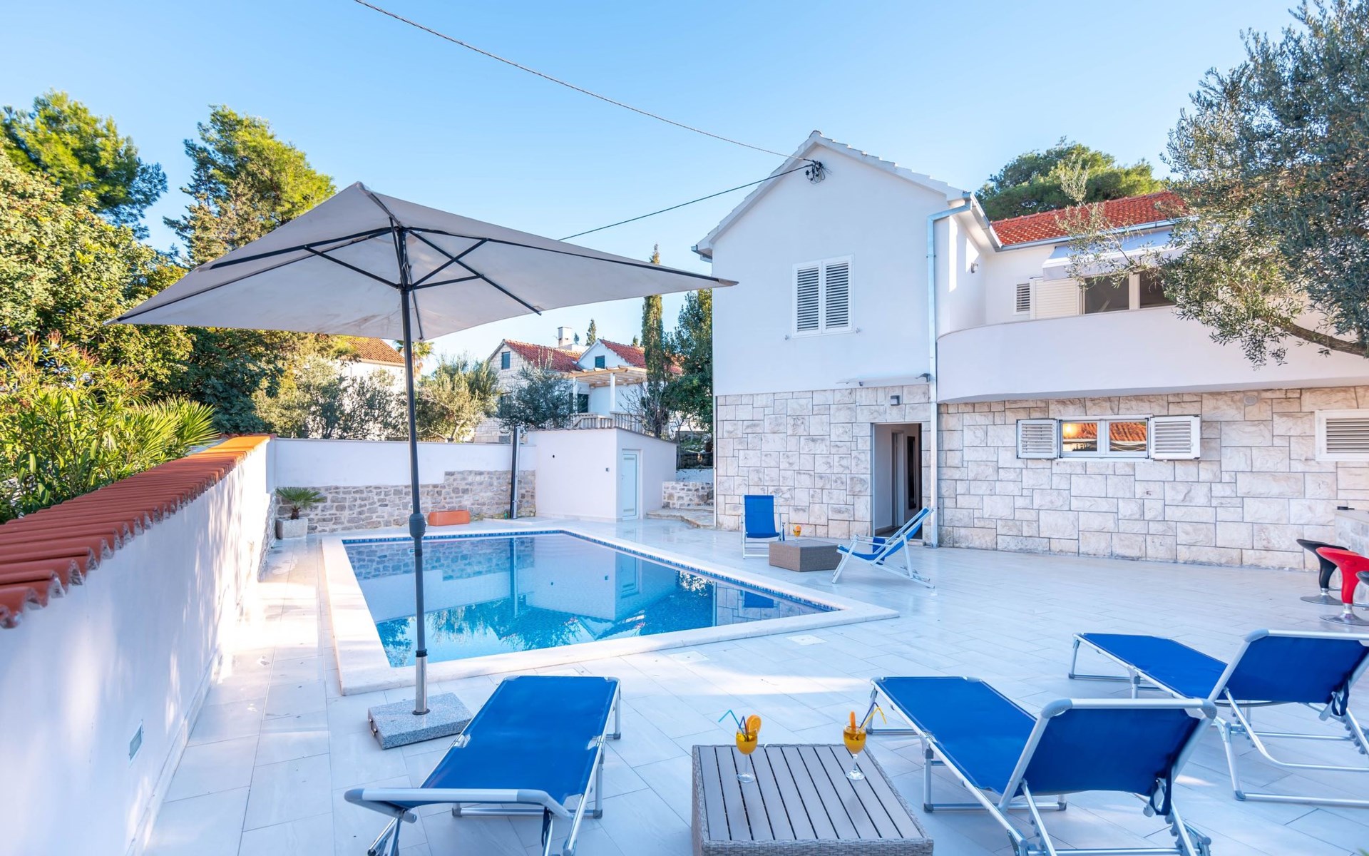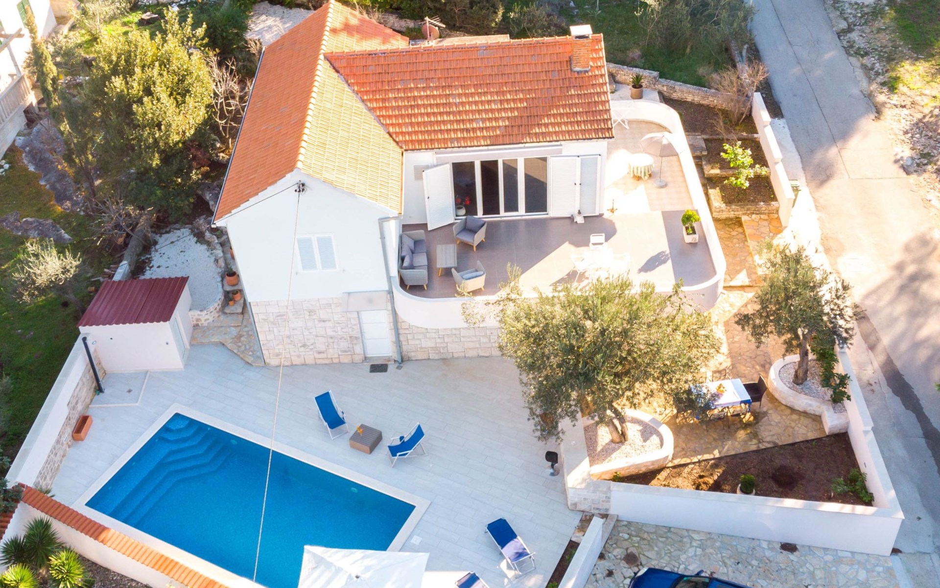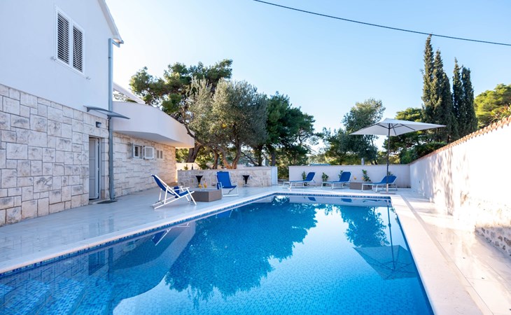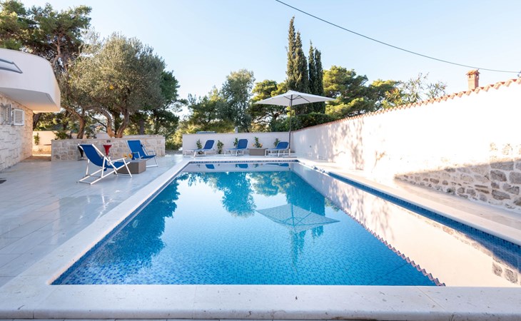 Villa is located on the right side of the bay, in a pine forest and is only 50 meters from the sea. Villa has a large pool & which is surrounded with stone paved yard on which there is a fireplace, table with chairs under the olive tree, an outdoor shower and sunbeds.