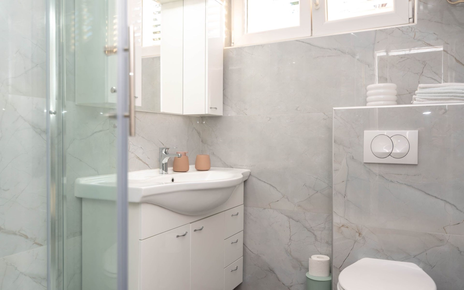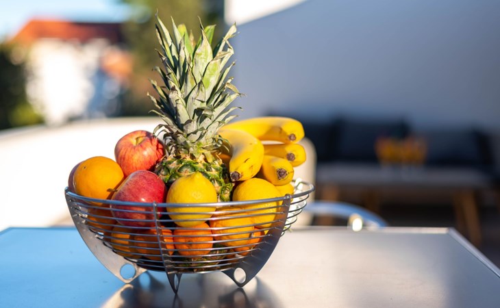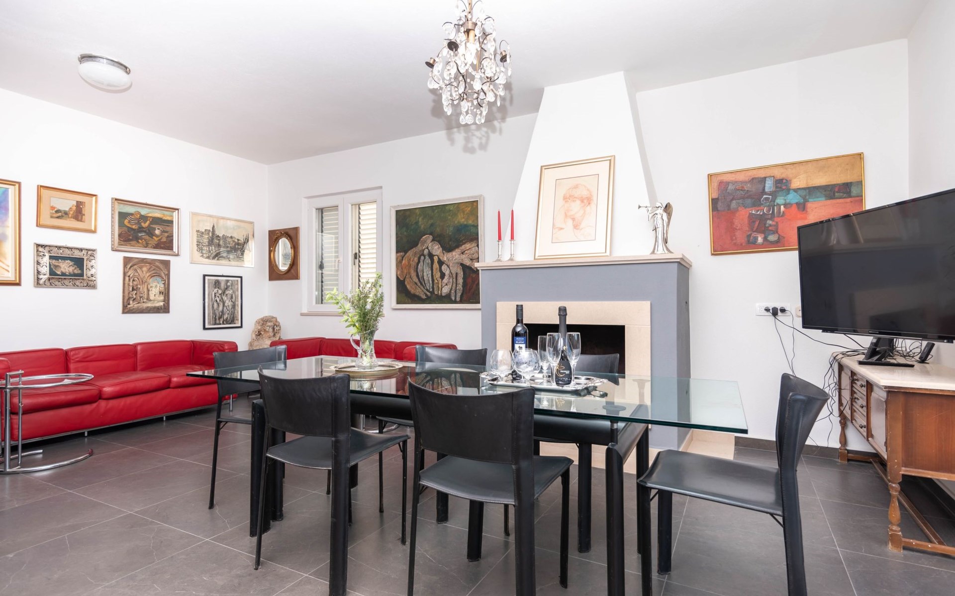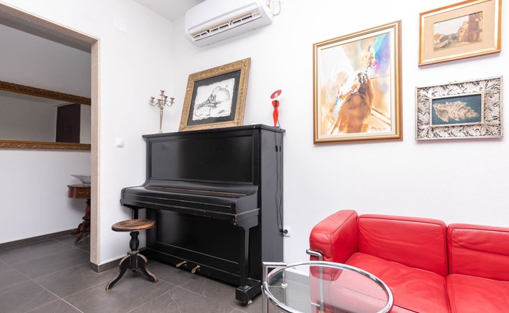 On first floor there are 3 bedrooms, all with double beds. There is fully equipped kitchen with big living room and amazing piano which exits to sunny terrace.