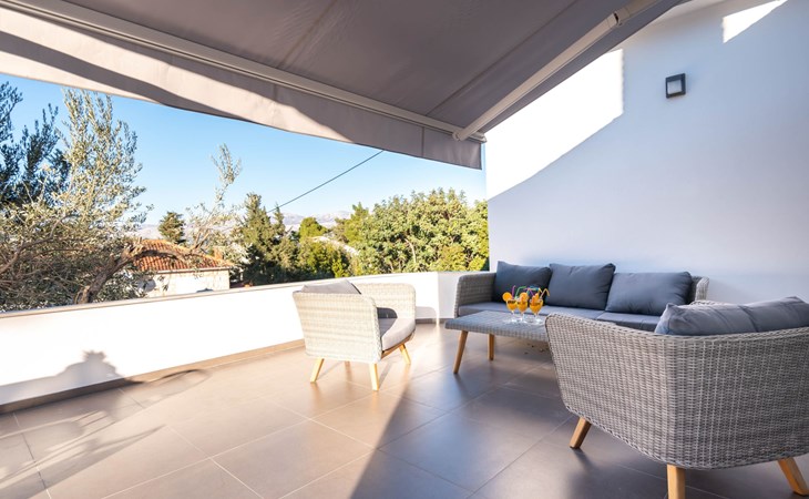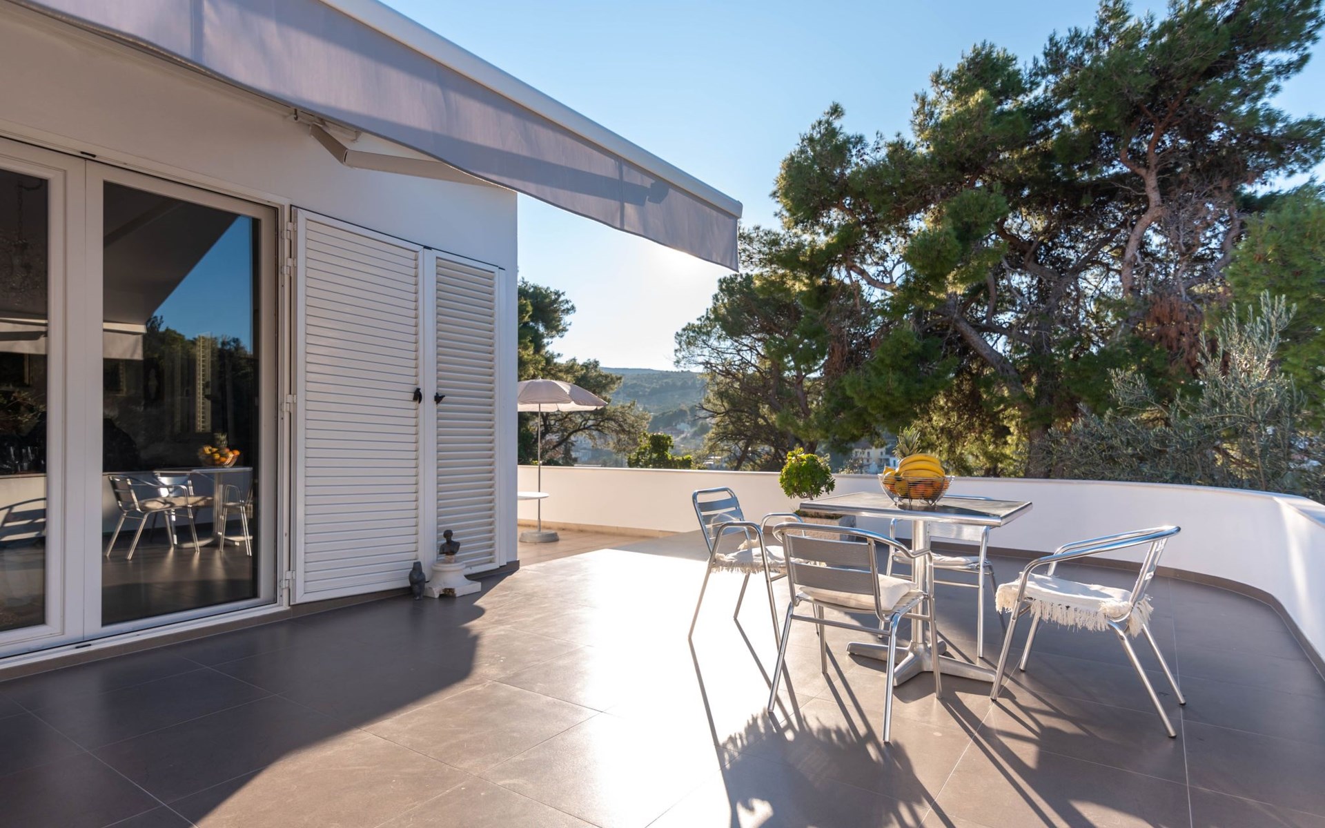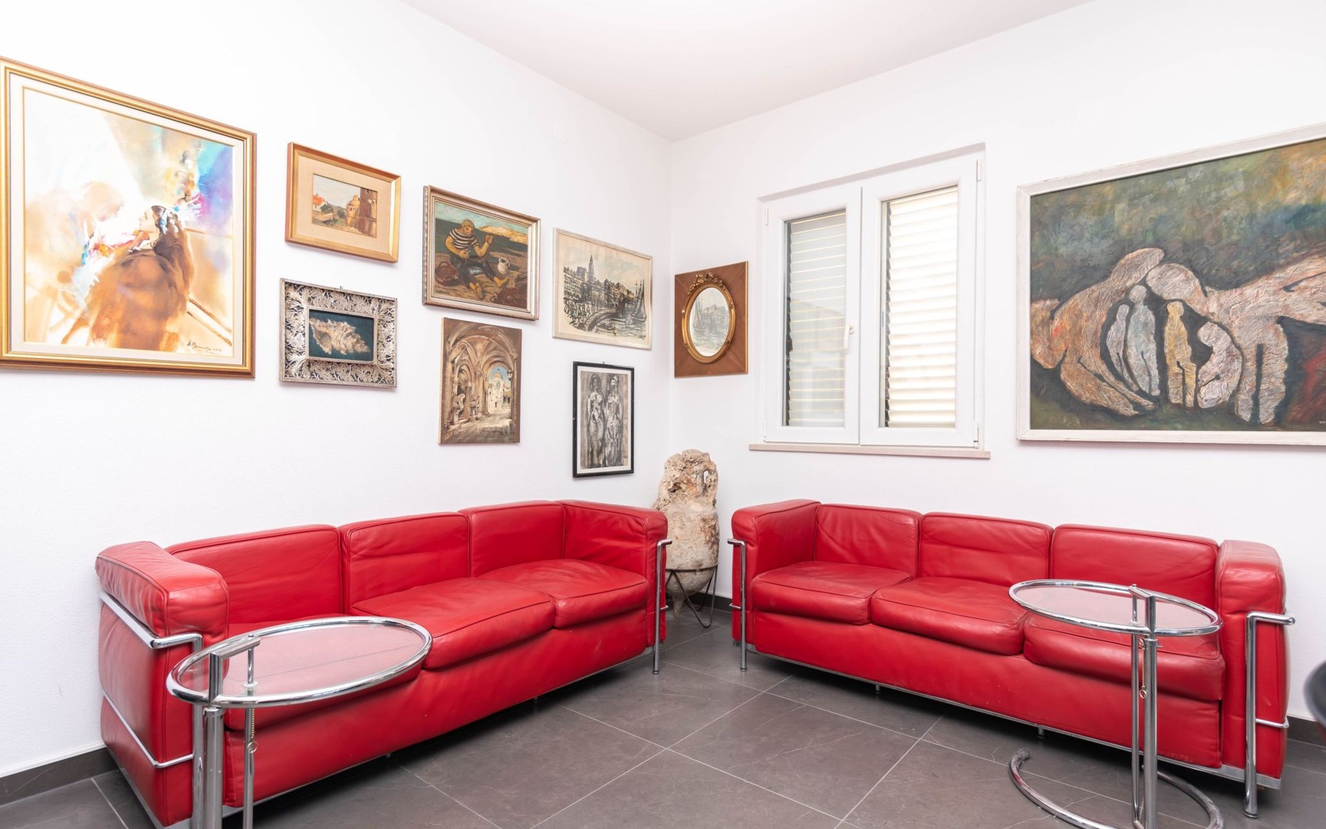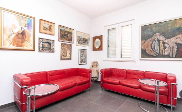 On first floor there are 3 bedrooms, all with double beds. There is fully equipped kitchen with big living room. In living room there is amazing artistic sofa, dining table with 6 chairs and amazing piano on which you can play, if you have the will and knowledge :). From living room you can exit to big sunny terrace of some 80^m on which there are two seating sets and from booth of the you can observe sea, pool, pine tress and totally relax.