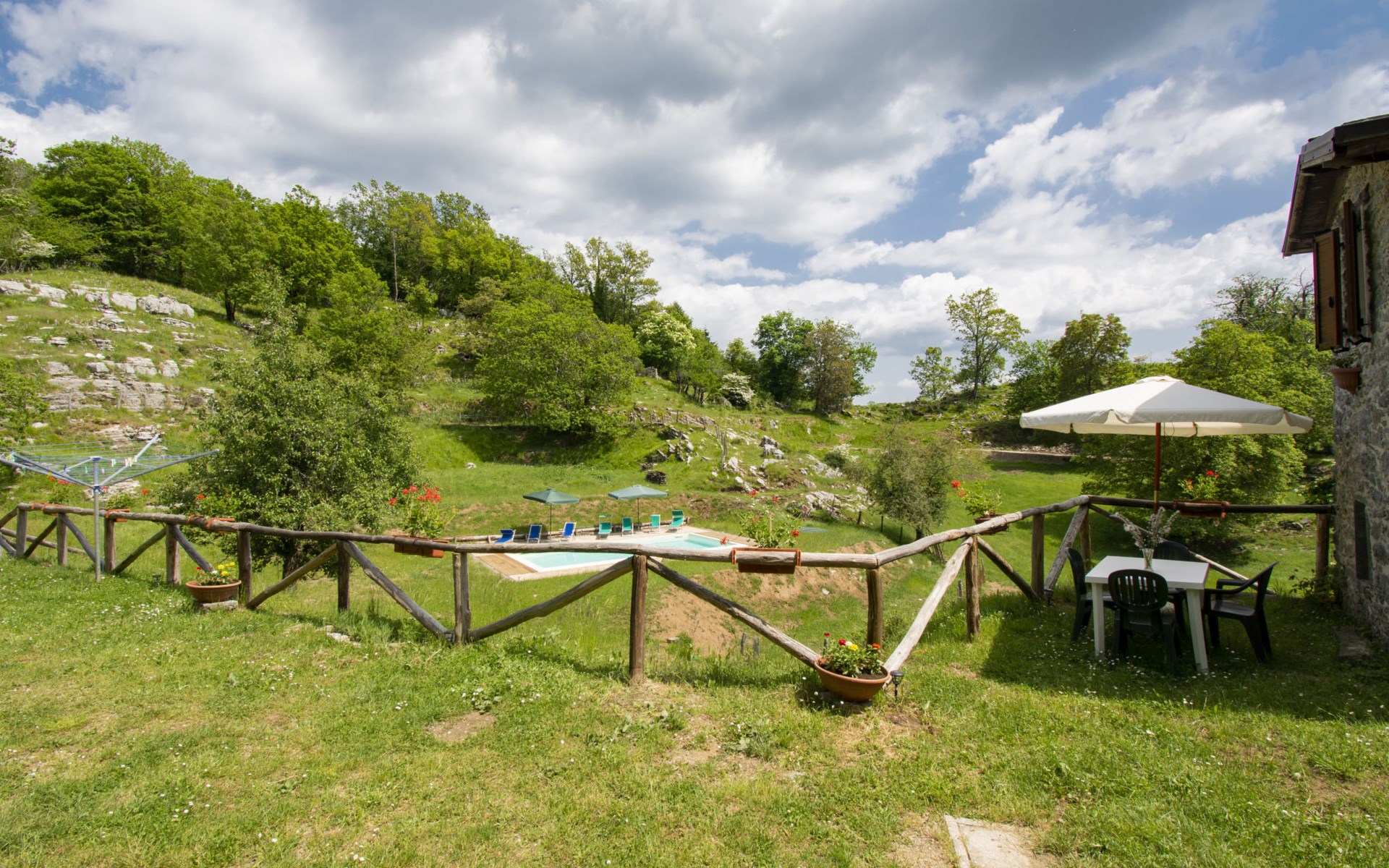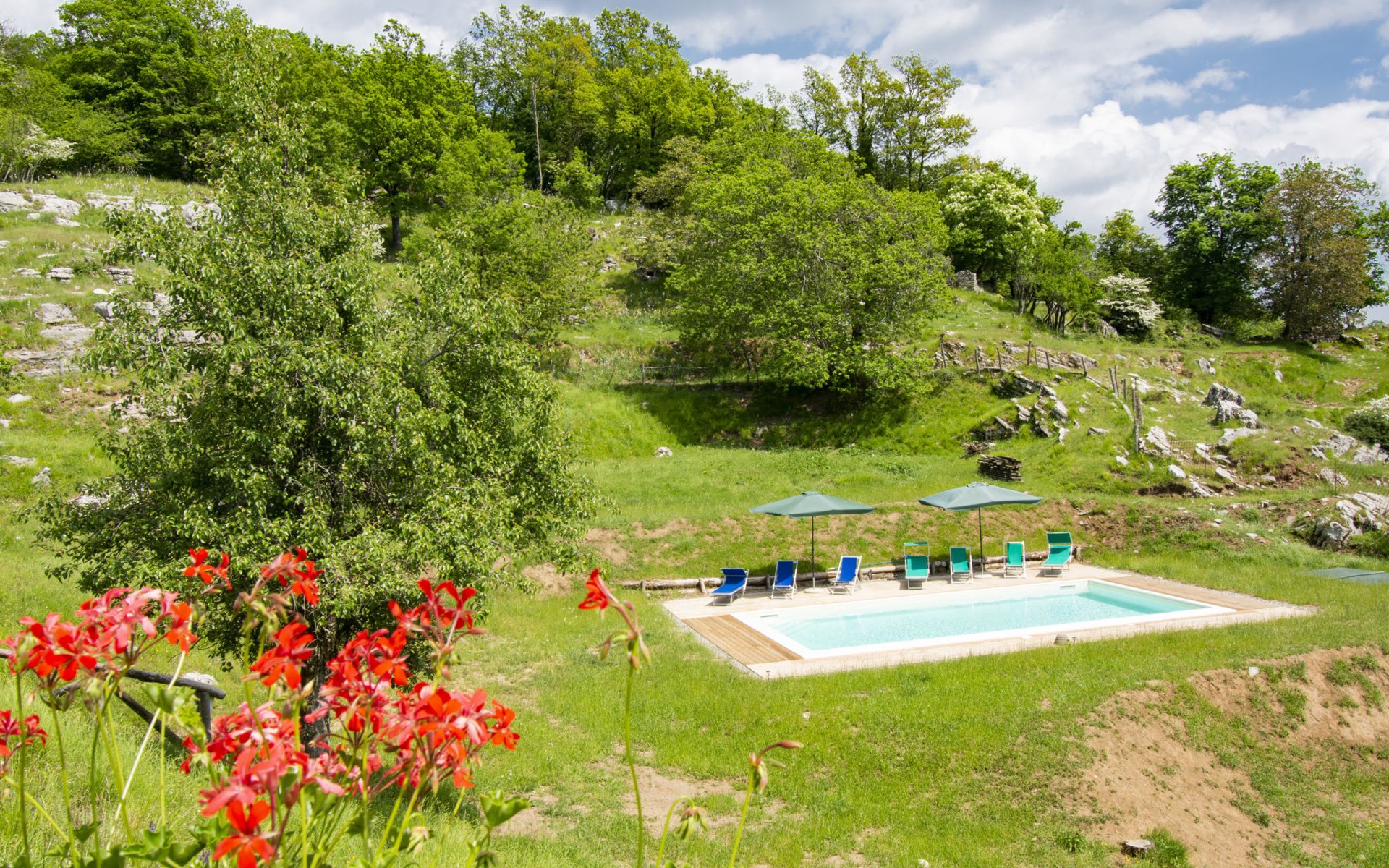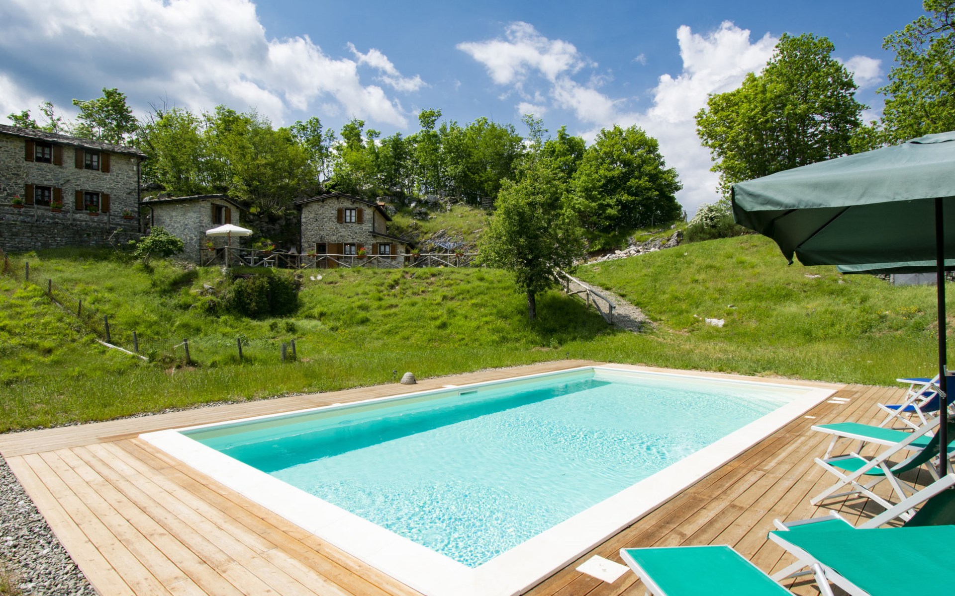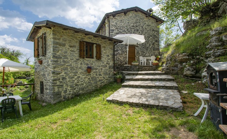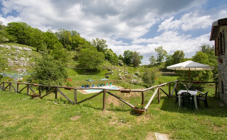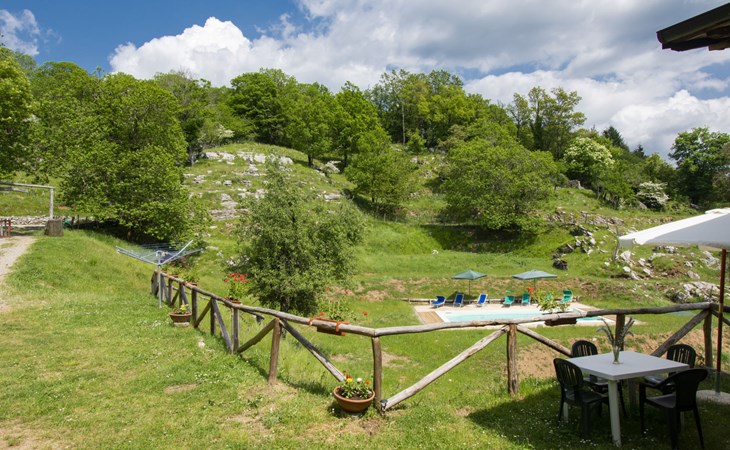 Rustic country house "Paradiso", 950 m a.s.l., detached, surrounded by trees and meadows. 2 houses in the resort. 8 km from the centre of Fabbriche di Vallico, 45 km from the centre of Lucca, 63 km from the centre of Pisa, in a secluded, elevated position, 73 km from the sea, in the countryside, in the woods. For shared use: property 10'000 m2, terraced garden (not fenced) with trees, natural garden, meadow, swimming pool (10 x 5 m, depth 140 cm, seasonal availability: 29.Apr. - 15.Oct.). Terrace, barbecue. In the house: washing machine (for shared use). 600 m long bumpy, narrow motor access to 20 m from the house (mountain road). Stepped path to the house. Parking on the premises. Shop 8 km, supermarket 20 km, restaurant 3.5 km, bus stop 3 km, sandy beach "Lido di Camaiore" 73 km, outdoor swimming pool 20 km, indoor swimming pool 20 km. Walking paths from the house 50 m.