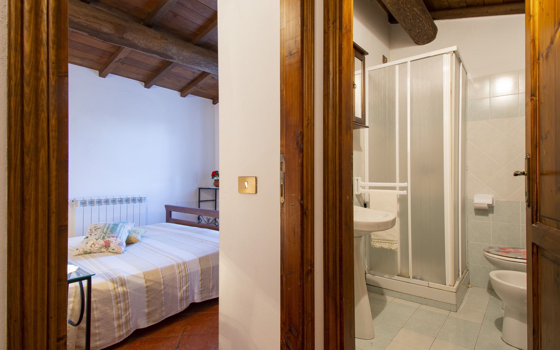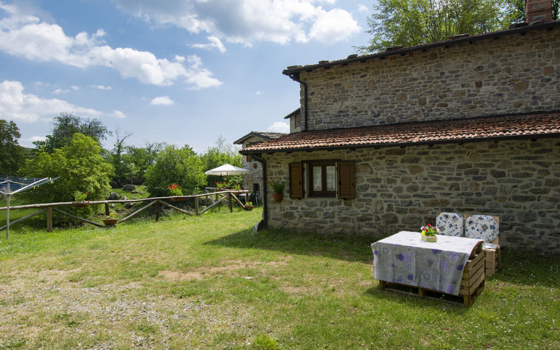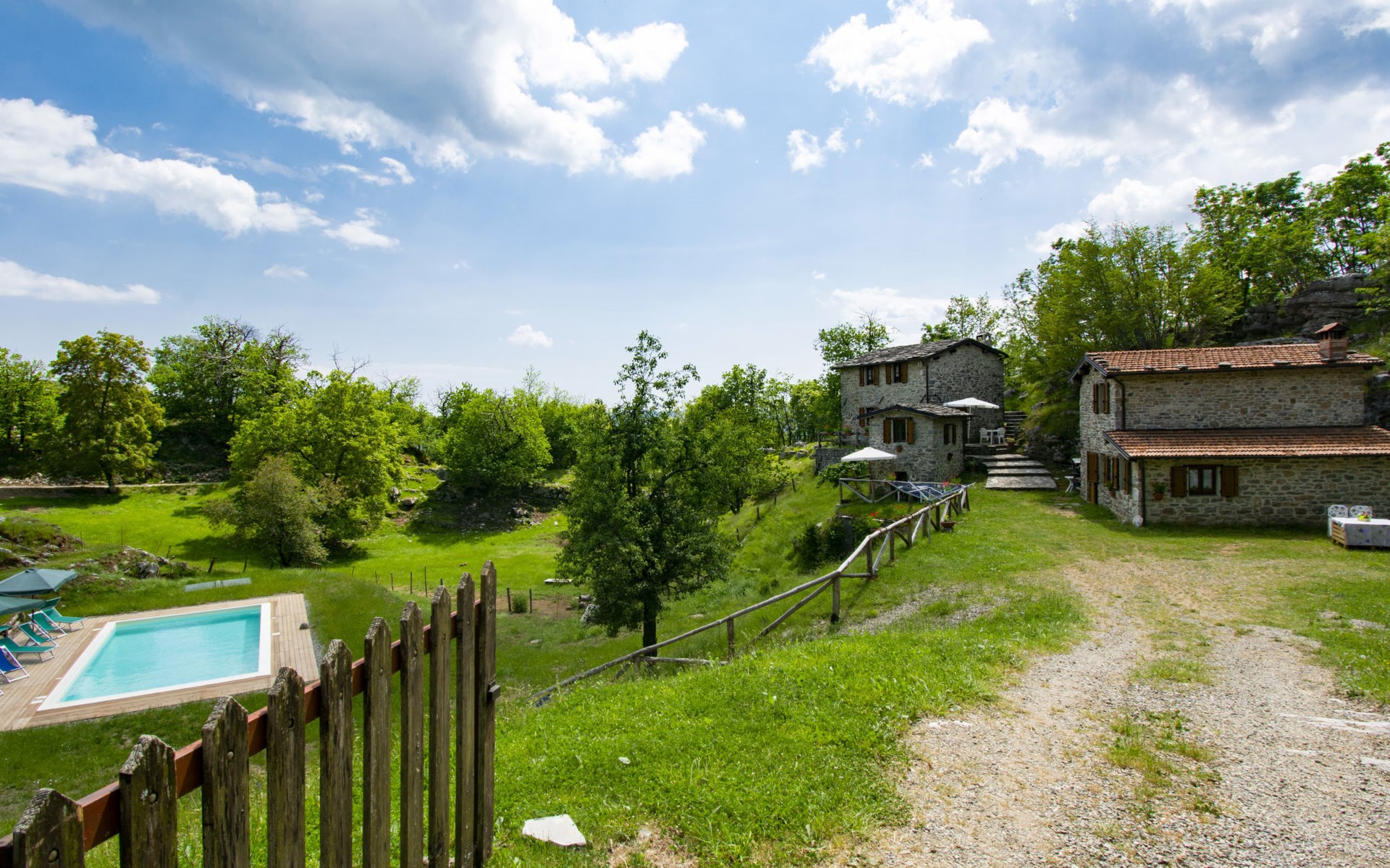 Rustic country house "Paradiso", 950 m a.s.l., detached, surrounded by trees and meadows. 2 houses in the resort. 8 km from the centre of Fabbriche di Vallico, 45 km from the centre of Lucca, 63 km from the centre of Pisa, in a secluded, elevated position, 73 km from the sea, in the countryside, in the woods. For shared use: property 10'000 m2, terraced garden (not fenced) with trees, natural garden, meadow, swimming pool (10 x 5 m, depth 140 cm, seasonal availability: 29.Apr. - 15.Oct.). Terrace, barbecue. In the house: washing machine (for shared use). 600 m long bumpy, narrow motor access to 20 m from the house (mountain road). Stepped path to the house. Parking on the premises. Shop 8 km, supermarket 20 km, restaurant 3.5 km, bus stop 3 km, sandy beach "Lido di Camaiore" 73 km, outdoor swimming pool 20 km, indoor swimming pool 20 km. Walking paths from the house 50 m.