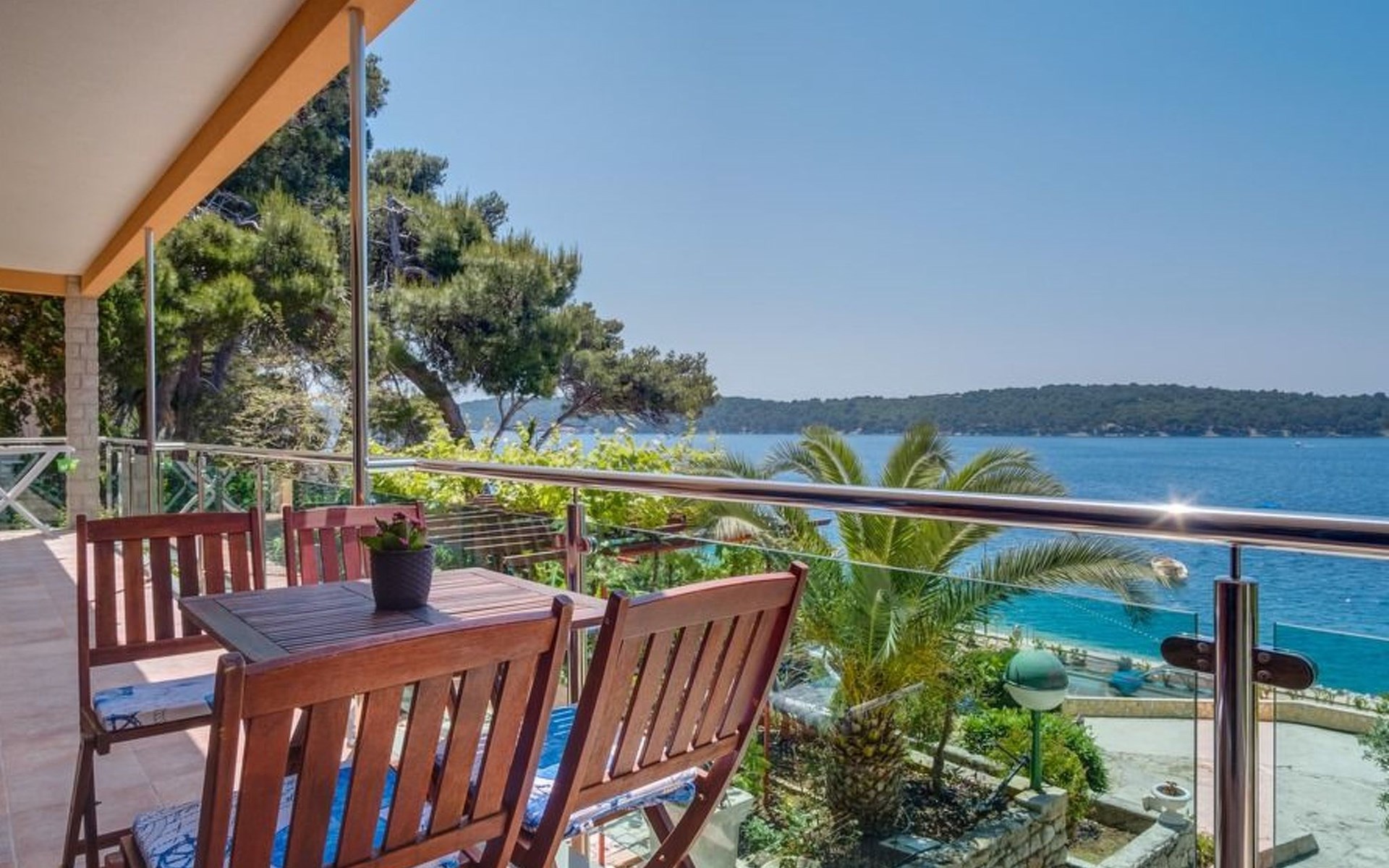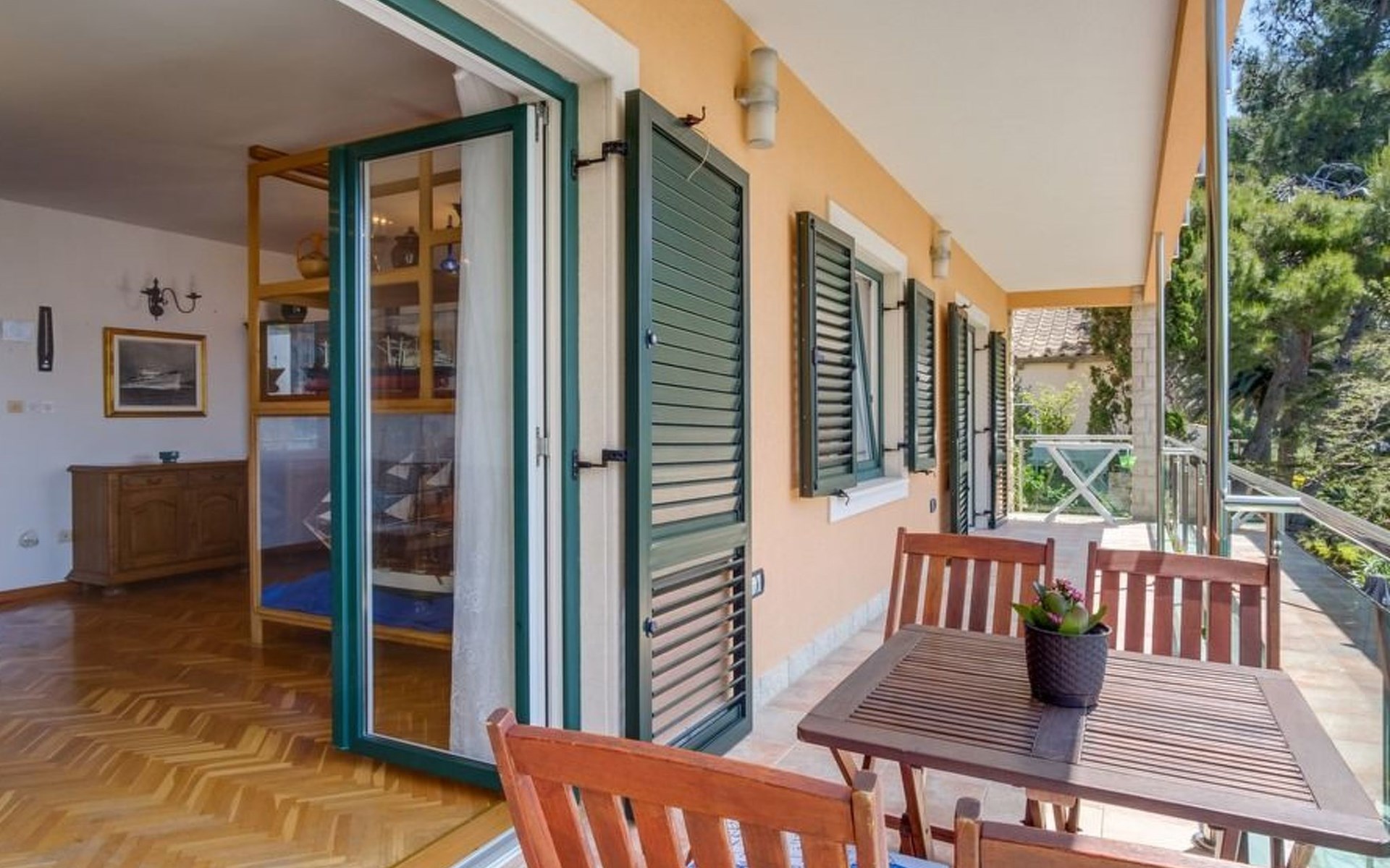 The apartments for 3 people Kamelia, Lavanda and Magnolia consist of a bedroom with a double bed, a kitchenette with all appliances, and a large living room with a dining room from which there is a view of the sea and an exit to the balcony. The living room also has two single beds. The apartment also has a bathroom with a shower.