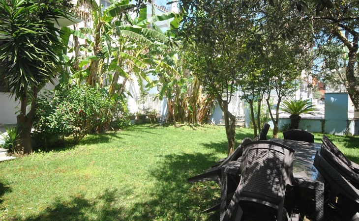 4 ½ room holiday flat 126m2, for up to 10 people, ground floor, 3.50m high rooms, with large garden and barbecue area. freshly renovated in 2011 Description: 3 bedrooms (1×2, 1×3 and 1×5), 2 bathrooms with shower/WC, 35m2 large dining room with two sofas, separate large kitchen. direct access to large communal garden. Ideal as a holiday flat for a large family, two families together or groups of up to 10 people. Air conditioning in all rooms. Fully equipped kitchen, dishwasher, fridge, freezer, gas hob, oven, washing machine (for a fee), tastefully furnished rooms (see photos, subject to change), barbecue. INCLUDED IN THE PRICE: air conditioning/heating, car park in the courtyard, WIFI, TV and towels.