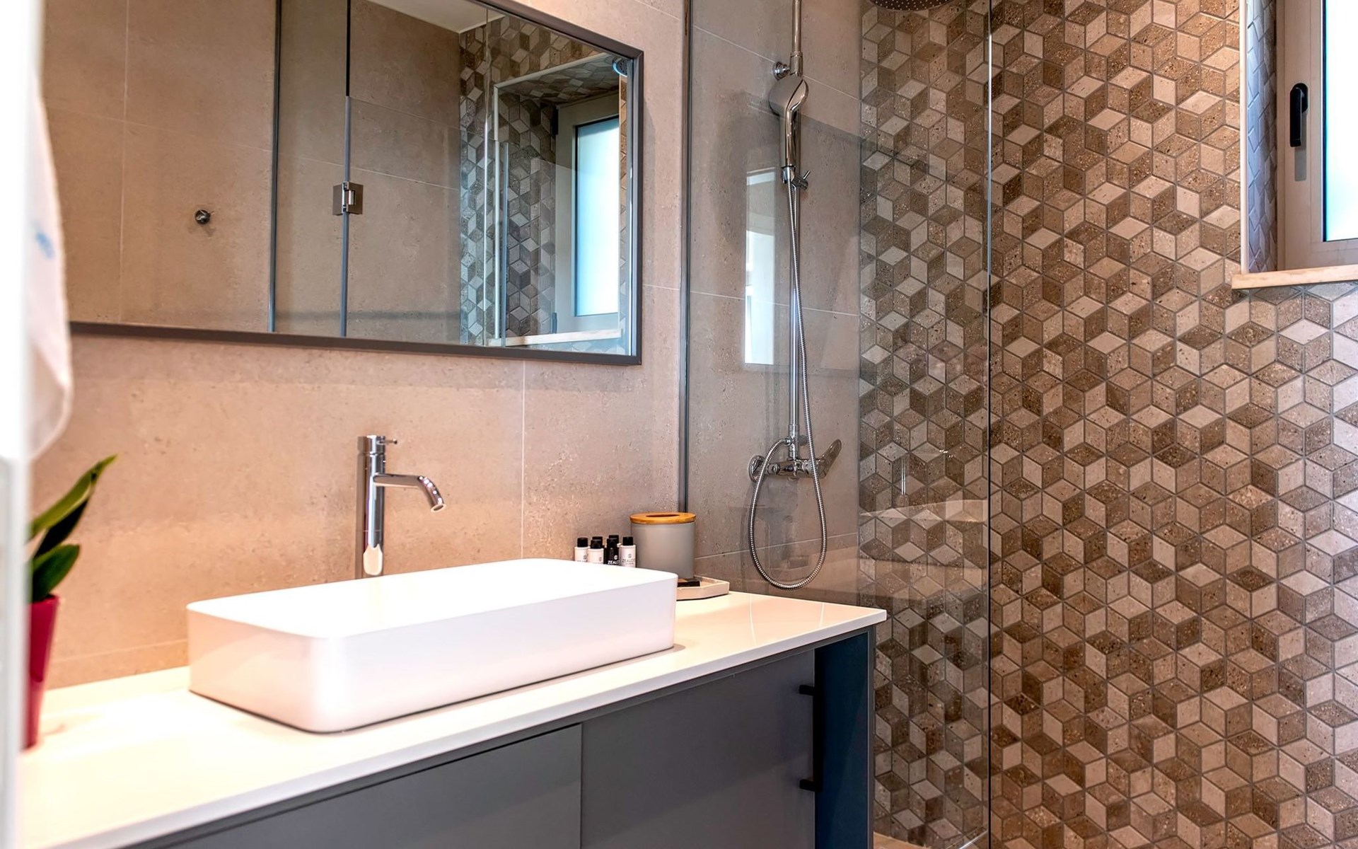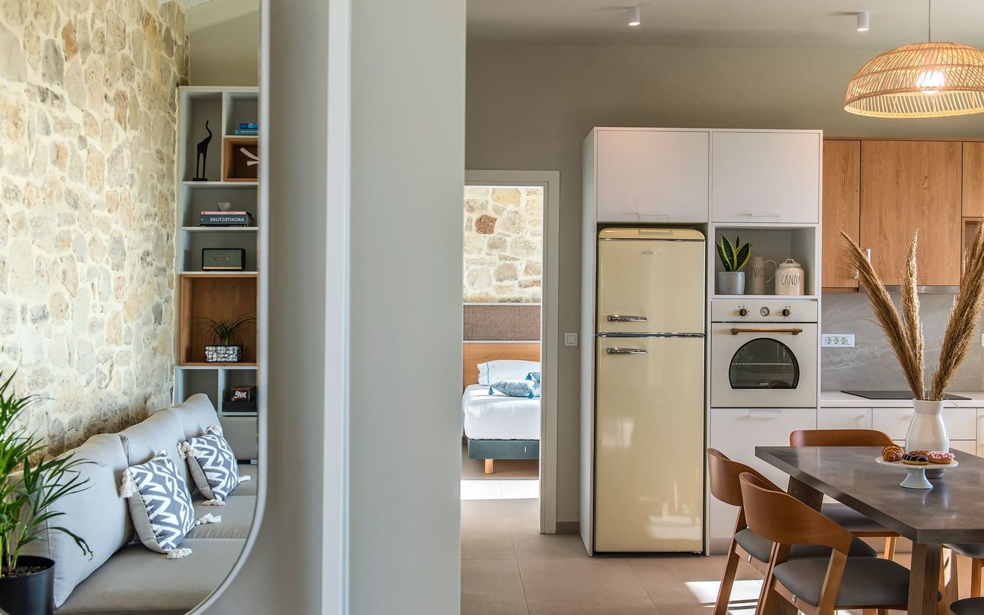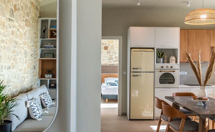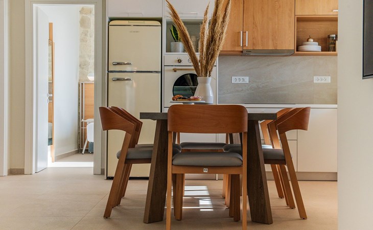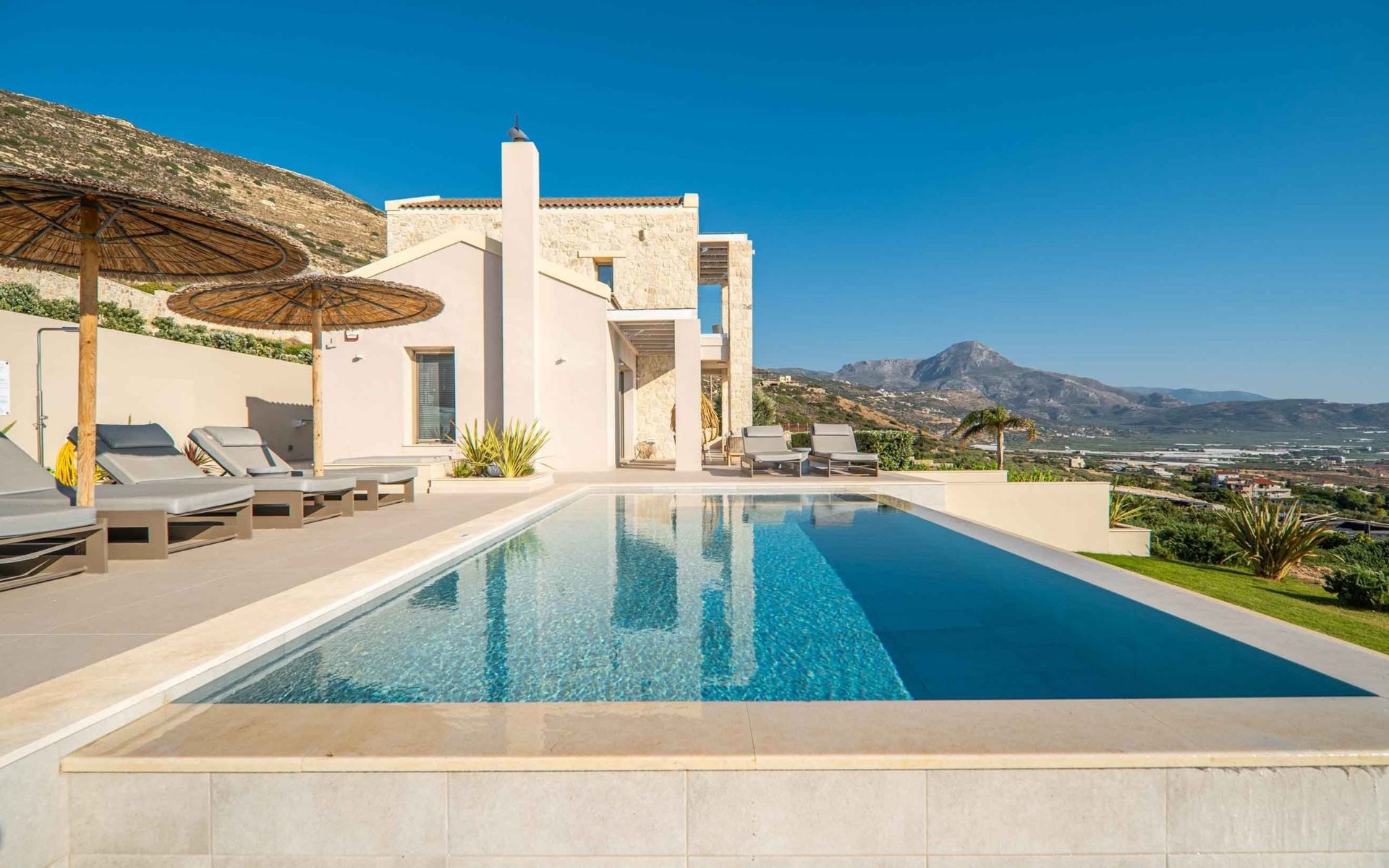 The most dominant feature of the exterior area is a swimming pool and a lounge area with sofas making it the ideal spot to relax while gazing at the gorgeous sunset. Pretty close to the pool area exists a dining table for moments of relaxation for you and your family, a BBQ, and sunbeds to enjoy the Cretan sun. Don’t forget that a secure parking area is provided outside of the villa.