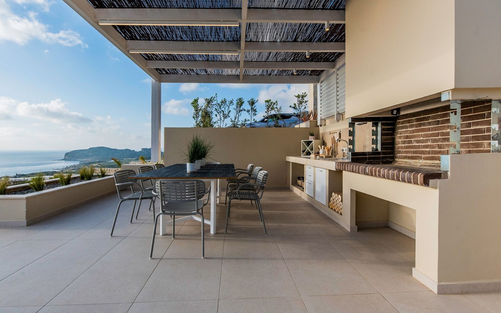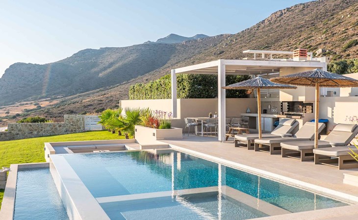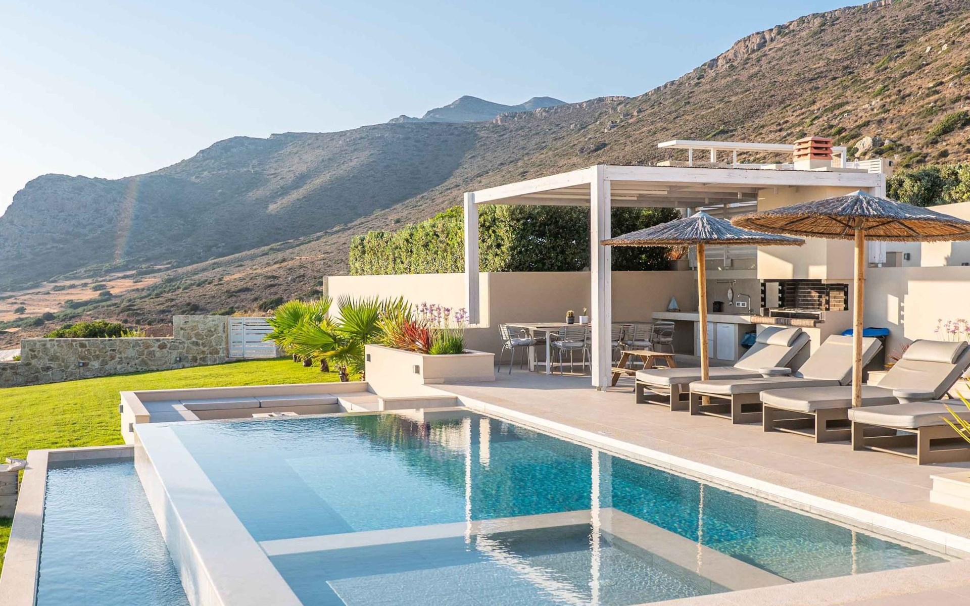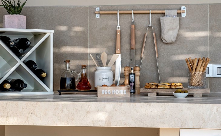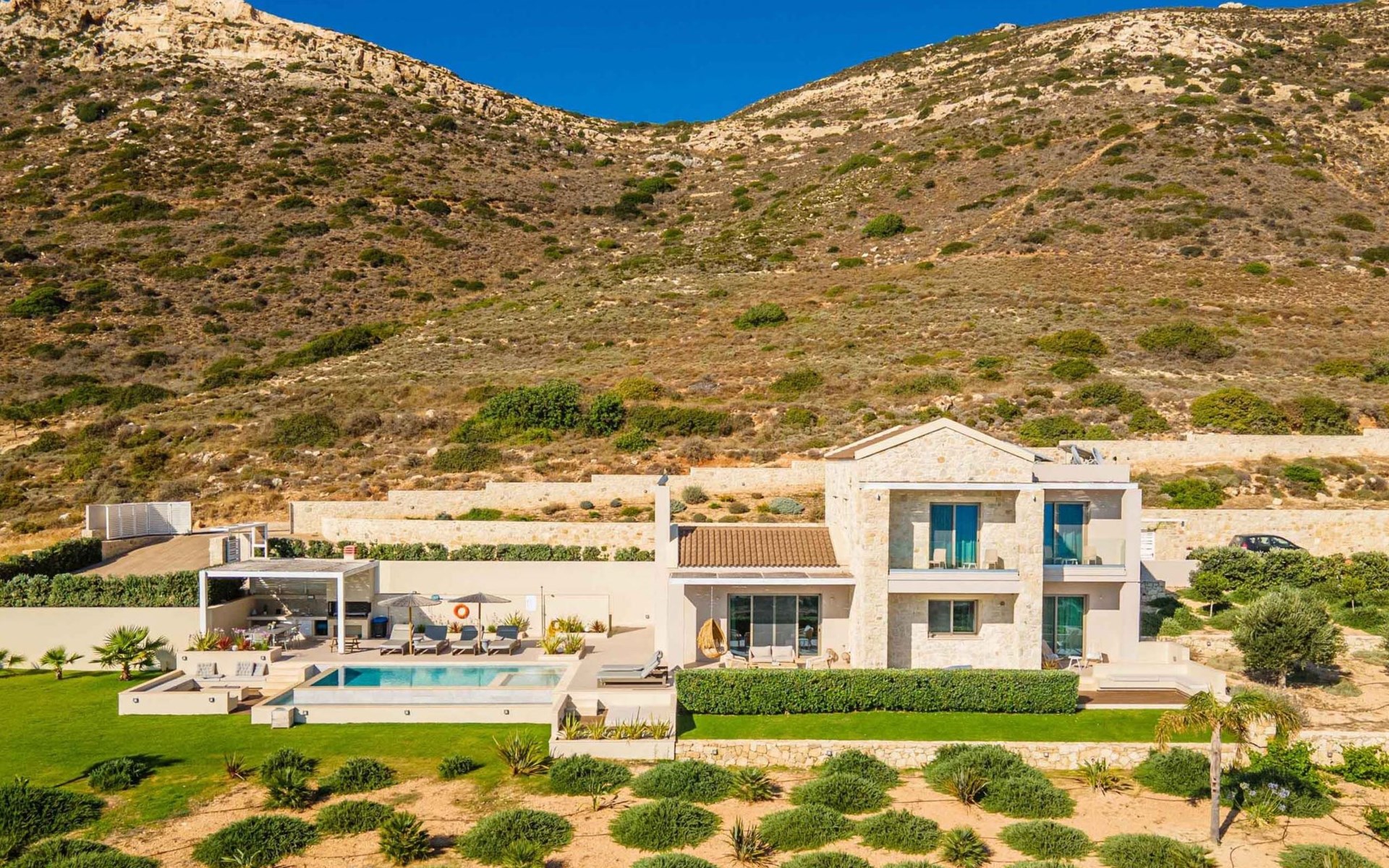 The most dominant feature of the exterior area is a swimming pool and a lounge area with sofas making it the ideal spot to relax while gazing at the gorgeous sunset. Pretty close to the pool area exists a dining table for moments of relaxation for you and your family, a BBQ, and sunbeds to enjoy the Cretan sun. Don’t forget that a secure parking area is provided outside of the villa with a charger for the electric cars.