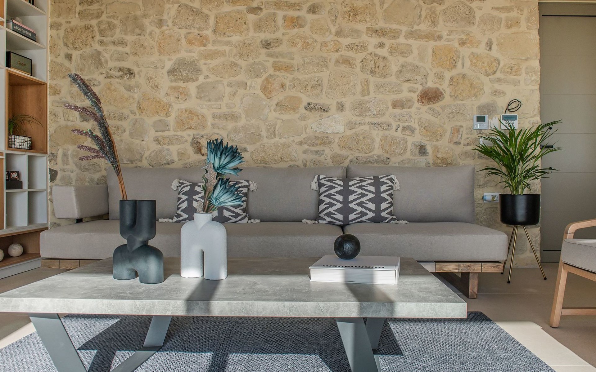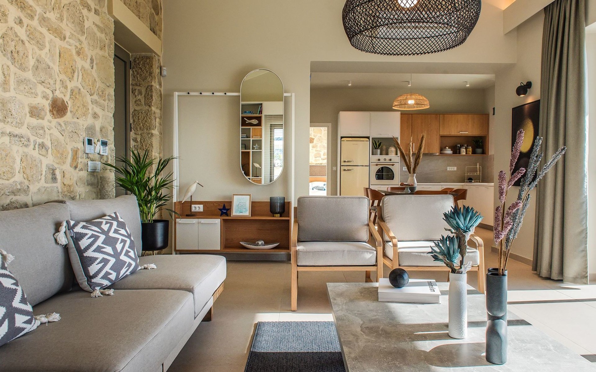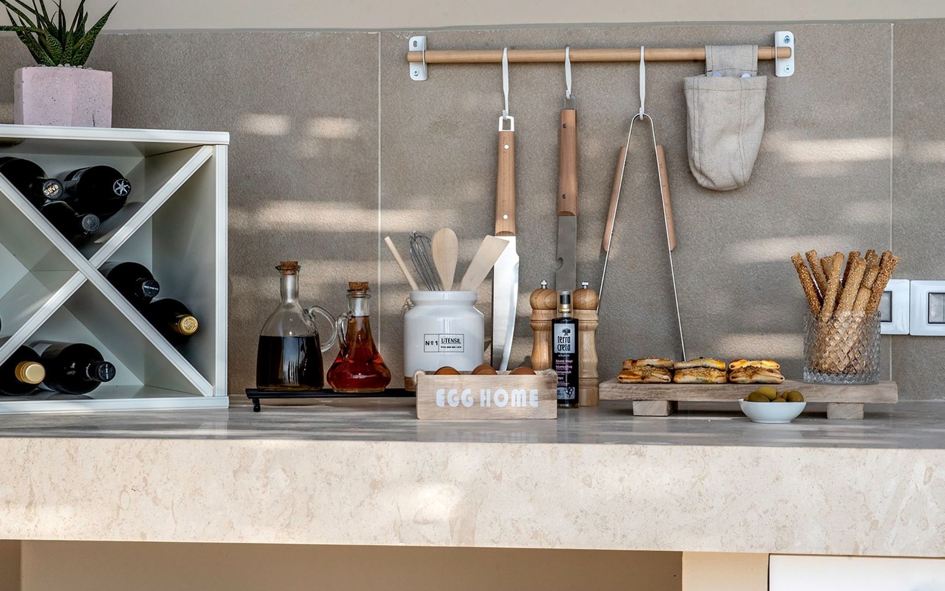 The most dominant feature of the exterior area is a swimming pool and a lounge area with sofas making it the ideal spot to relax while gazing at the gorgeous sunset. Pretty close to the pool area exists a dining table for moments of relaxation for you and your family, a BBQ, and sunbeds to enjoy the Cretan sun. Don’t forget that a secure parking area is provided outside of the villa with a charger for the electric cars.