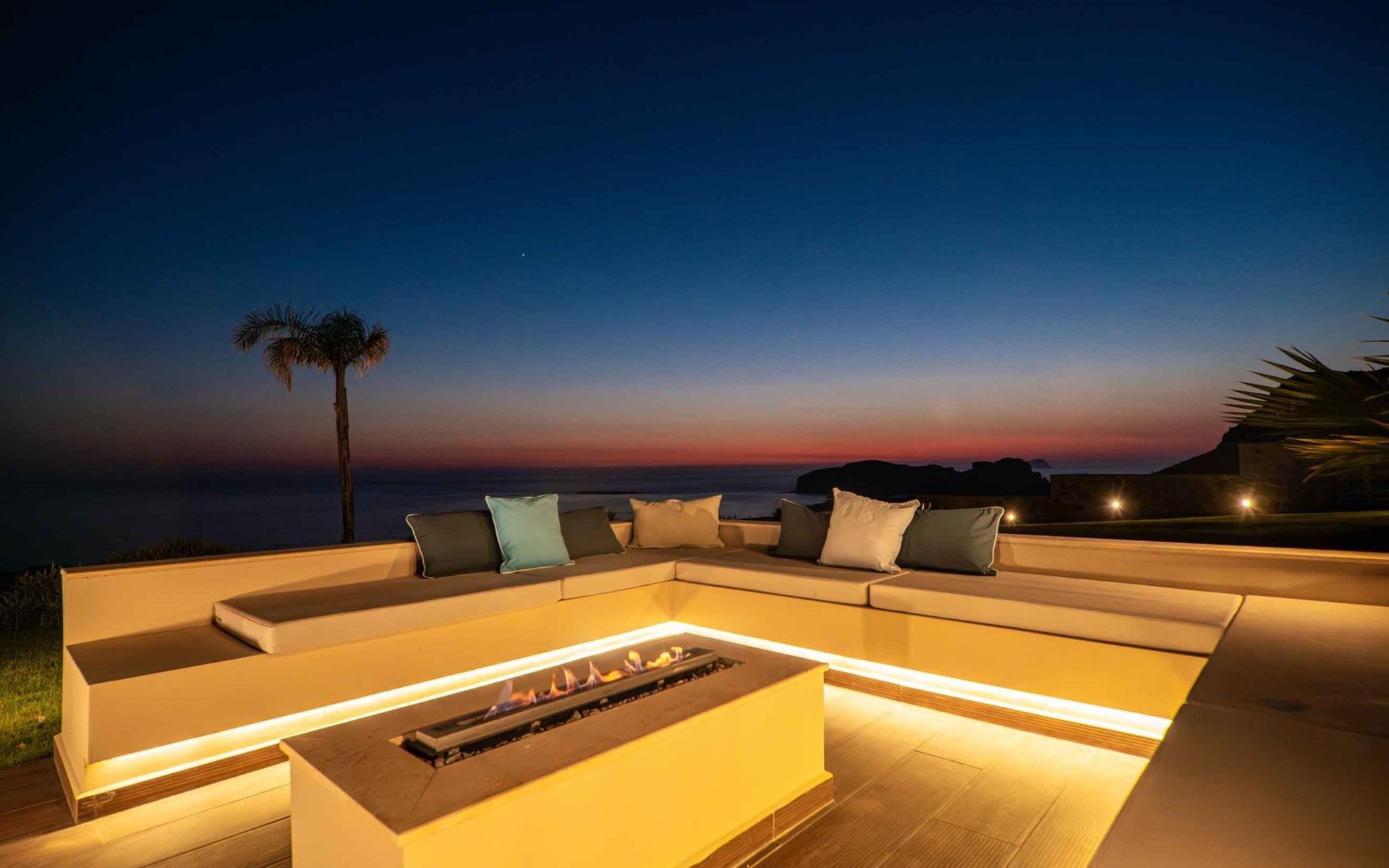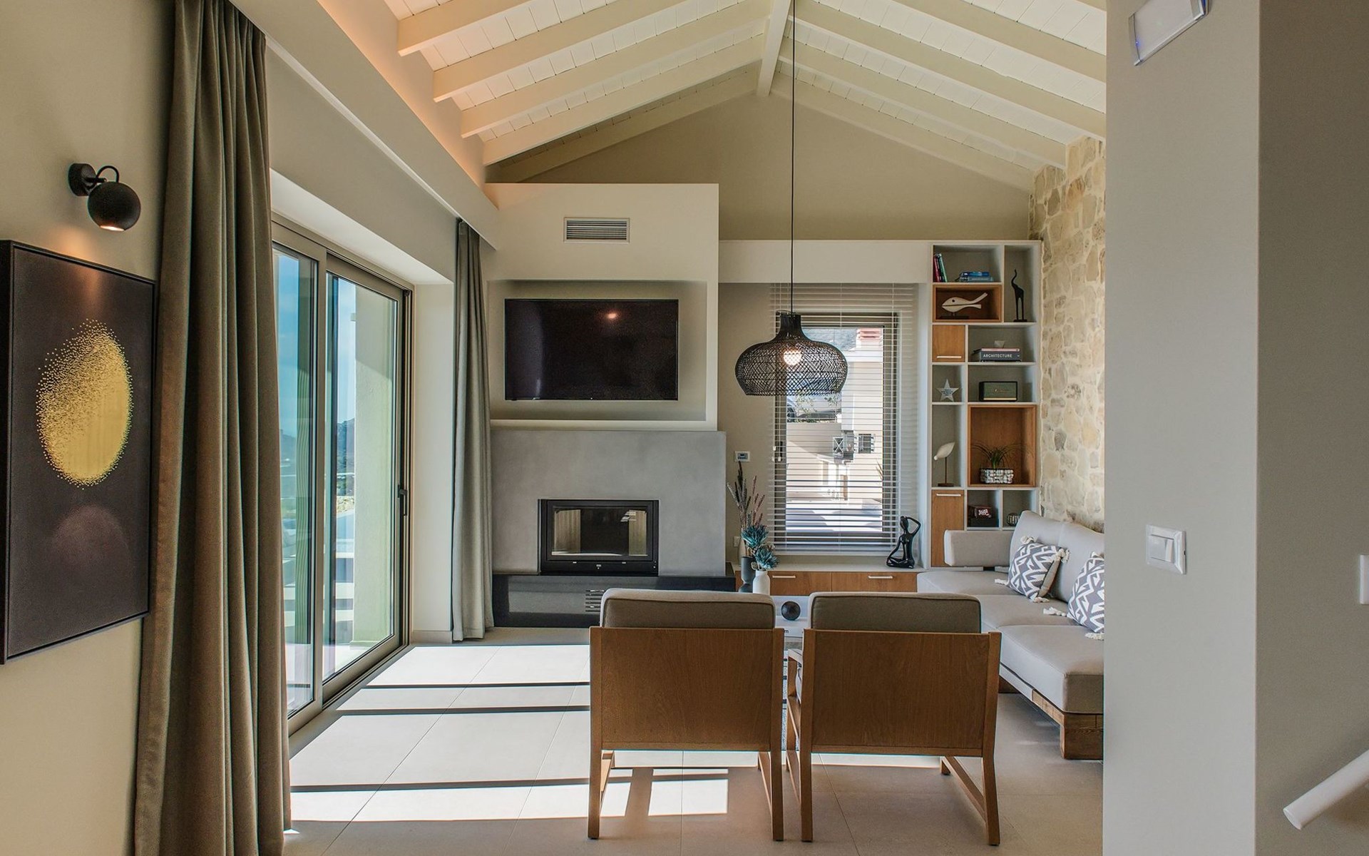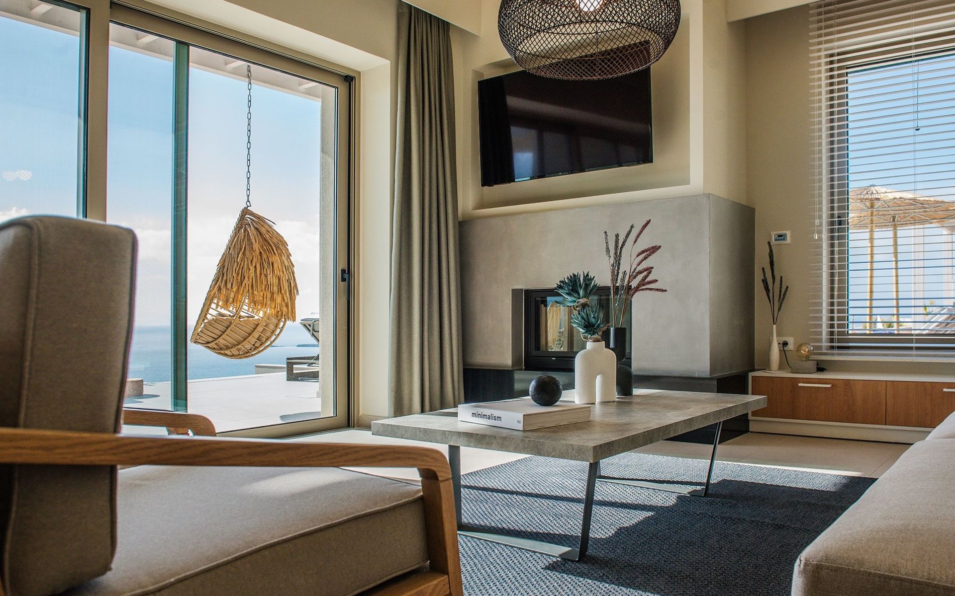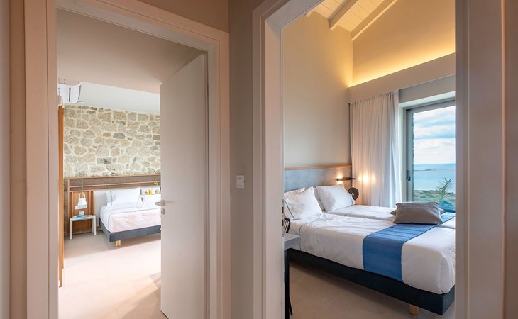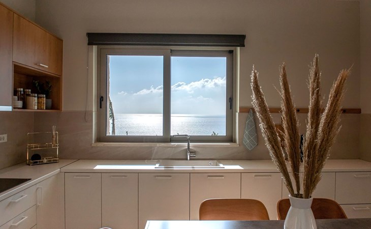 Villa Cielo is a two-story villa consisting of three bedrooms, two of them on the first floor one with twin beds with a sea view, and another double bed. The third bedroom on the ground floor has a king-size bed with a sea view. On the ground floor, there is a shared WC with a shower suitable for all the guests, and on the first floor 2 ensuite bathrooms with a shower. Luxury and modern design complete the scenery of contemporary architecture and high-quality products. Entering the villa on the ground floor you will find a spacious open area with a fully equipped contemporary kitchen that has branded appliances and facilities, making holiday cooking a most pleasurable experience. The area is completed with a dining room and a living room with a big flat-screen smart TV with satellite channels and an energy fireplace. The large windows create the illusion of transparency and provide a seamless transition between the indoor and outdoor areas.