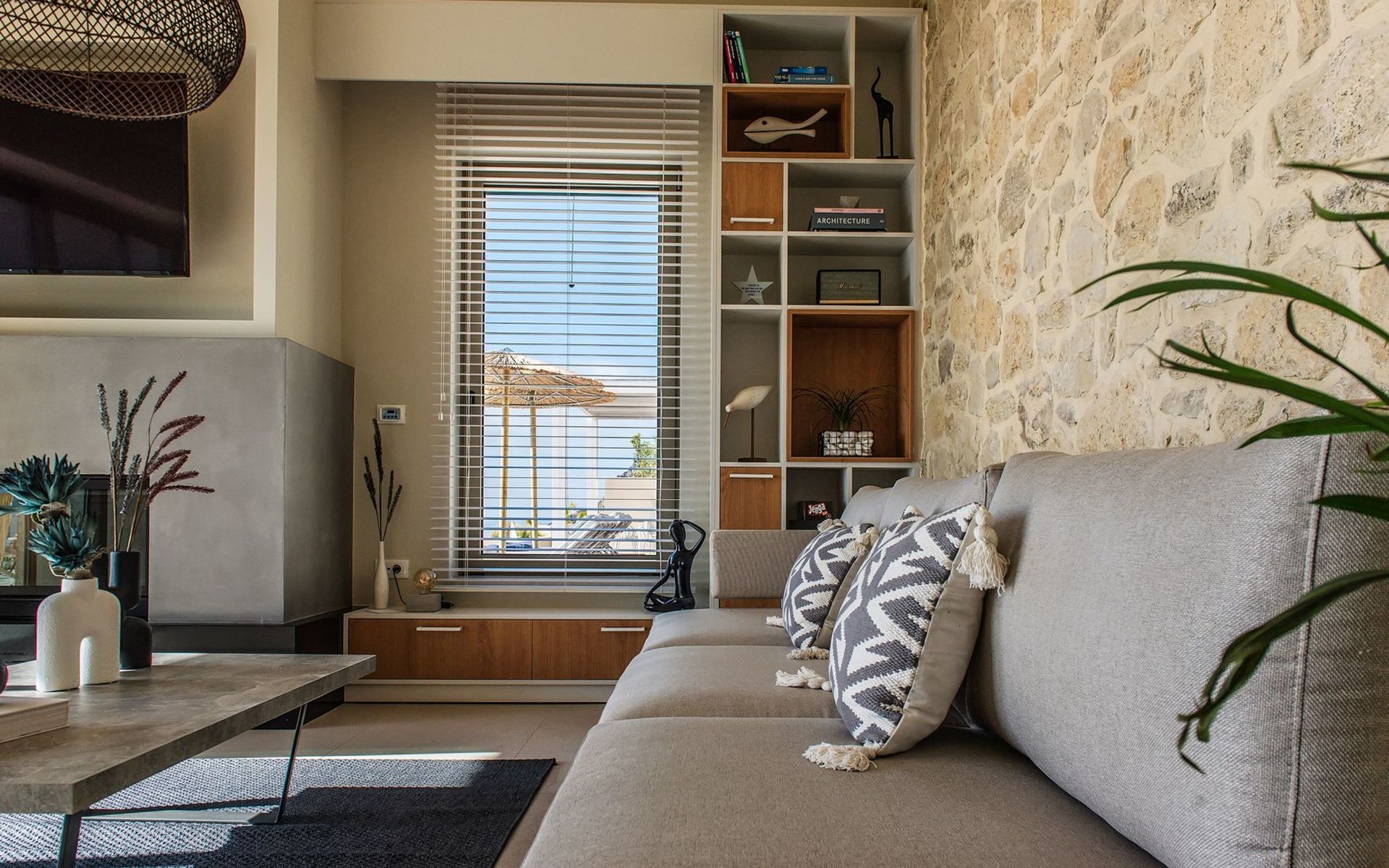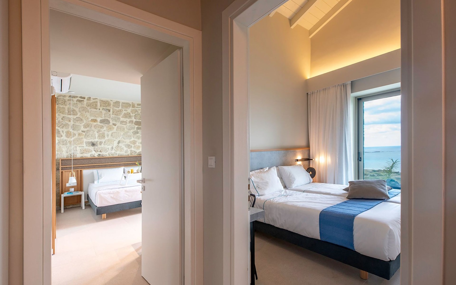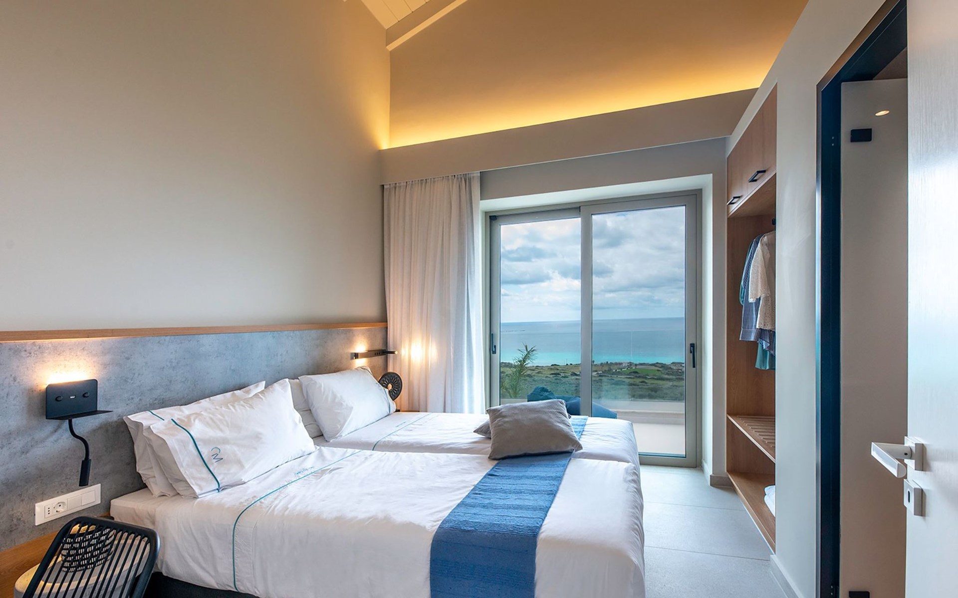 Villa Cielo is a two-story villa consisting of three bedrooms, two of them on the first floor one with twin beds with a sea view, and another double bed. The third bedroom on the ground floor has a king-size bed with a sea view. On the ground floor, there is a shared WC with a shower suitable for all the guests, and on the first floor 2 ensuite bathrooms with a shower. Luxury and modern design complete the scenery of contemporary architecture and high-quality products. Entering the villa on the ground floor you will find a spacious open area with a fully equipped contemporary kitchen that has branded appliances and facilities, making holiday cooking a most pleasurable experience. The area is completed with a dining room and a living room with a big flat-screen smart TV with satellite channels and an energy fireplace. The large windows create the illusion of transparency and provide a seamless transition between the indoor and outdoor areas.