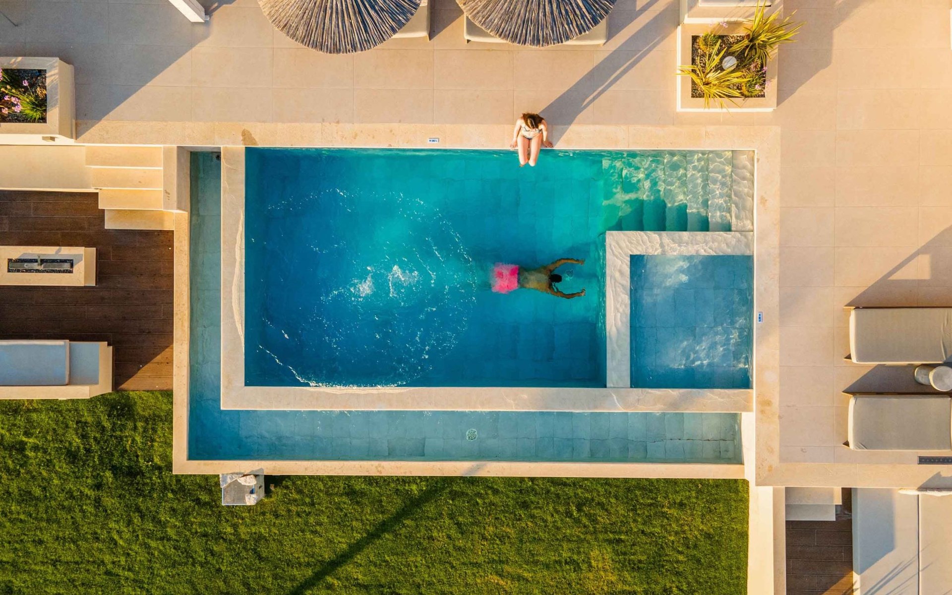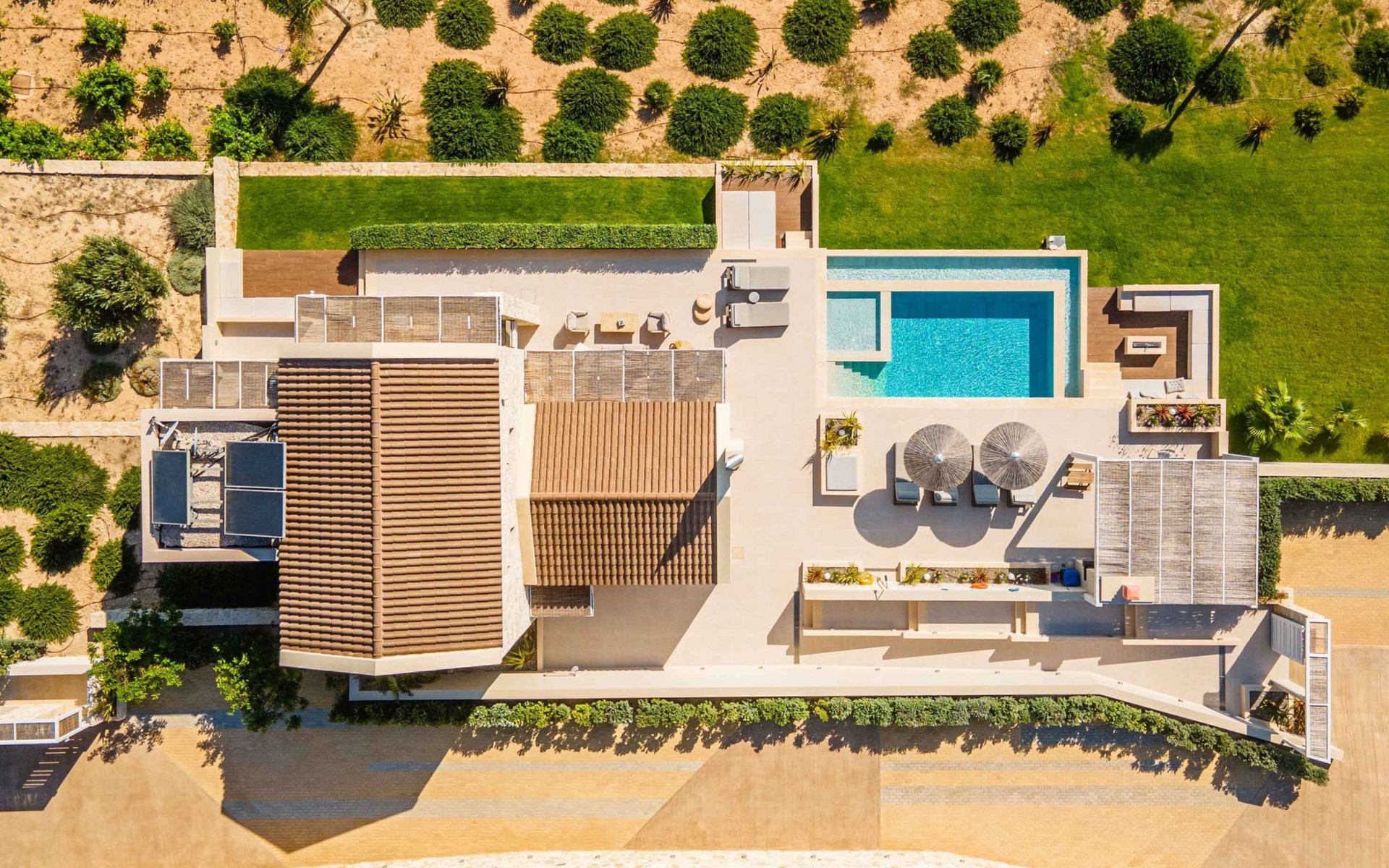 Pergola-protected lounge and dining areas