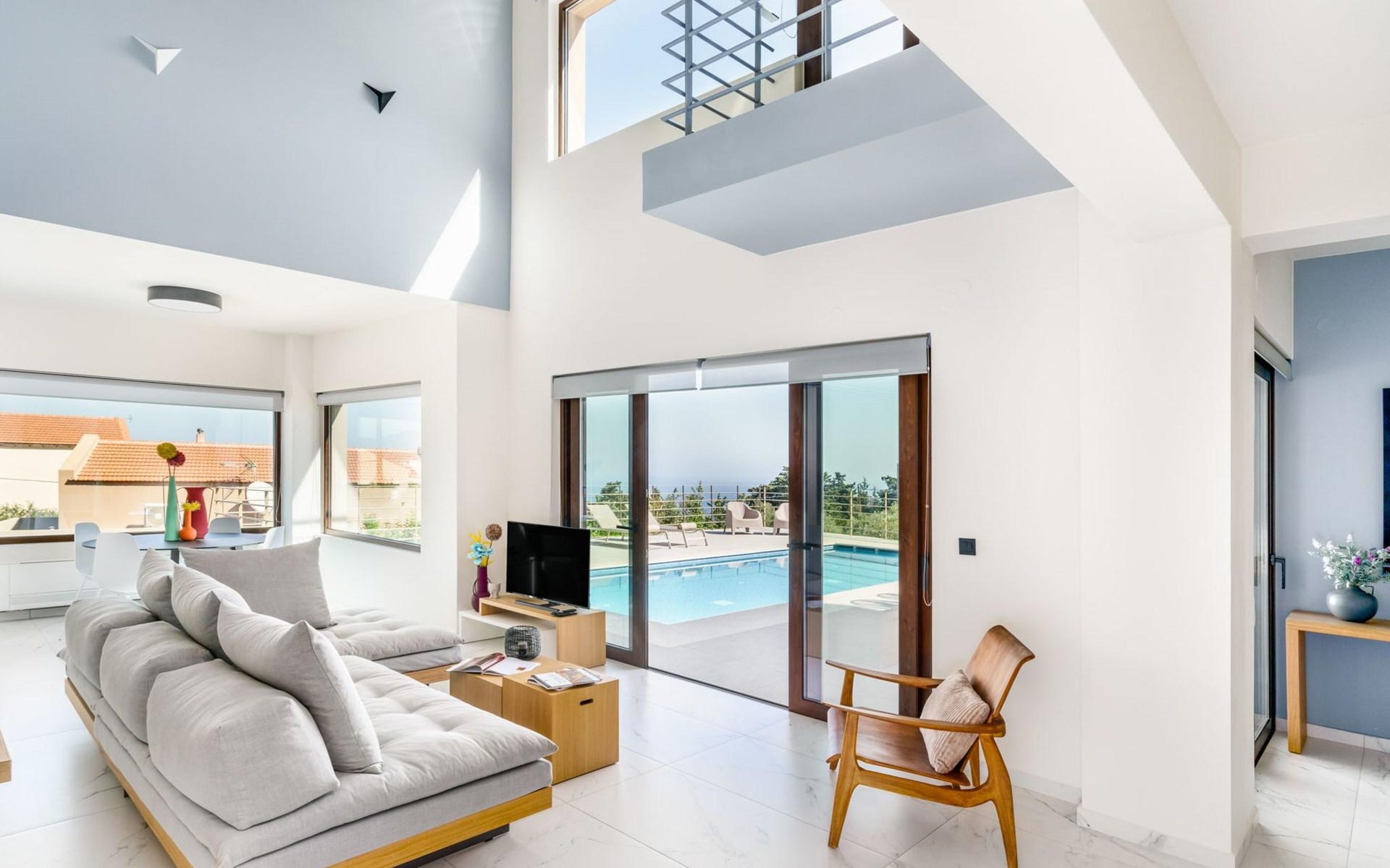 Living area with sofa, 40’’ satellite Smart TV, access to the pool terrace, sea view