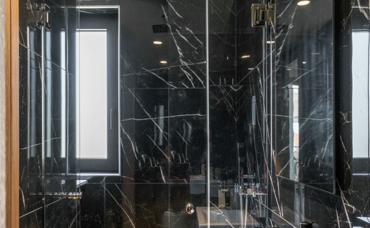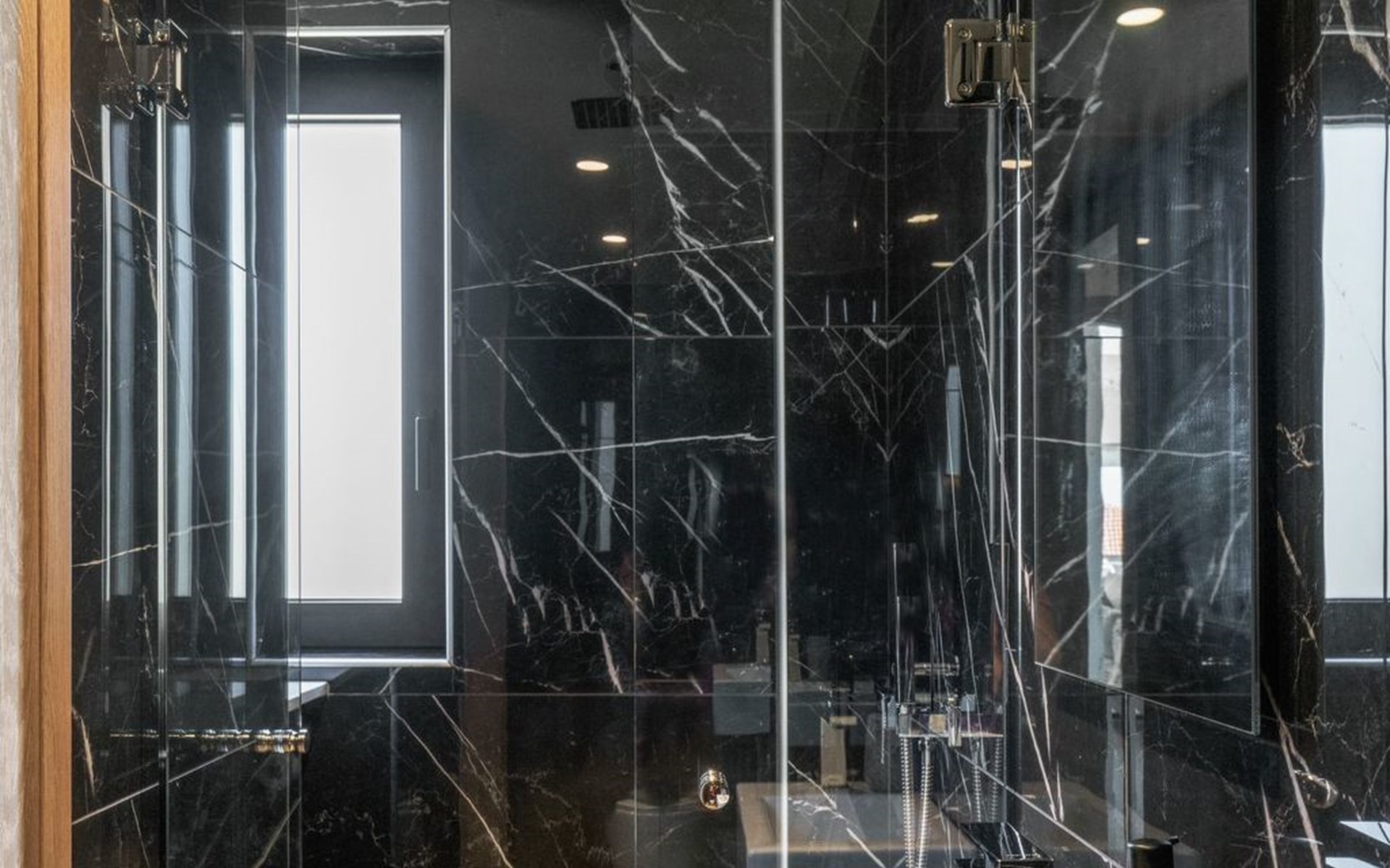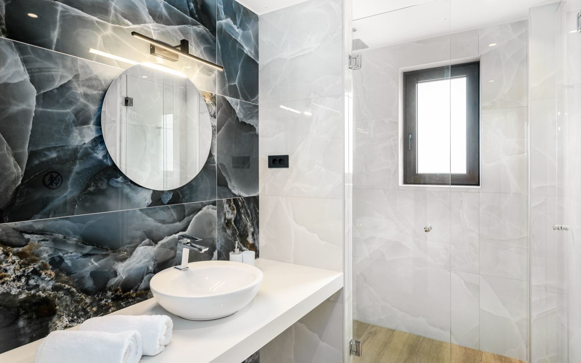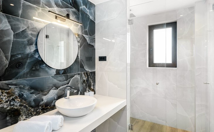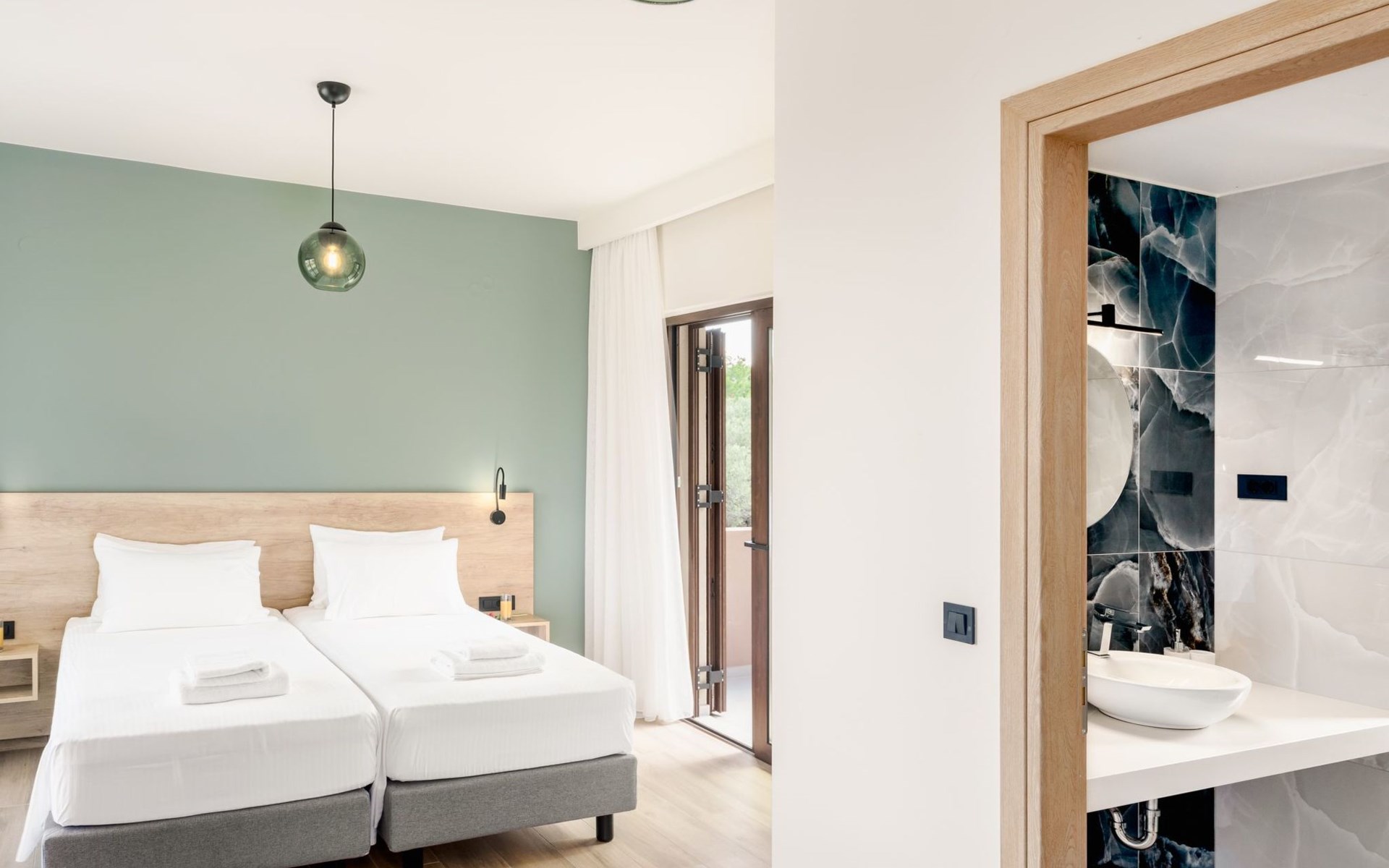 The lower level of Villa Alya features a fourth bedroom with twin-size beds, air conditioning, and an ensuite bathroom with a shower and hairdryer, ensuring guests enjoy a restful stay in complete comfort.