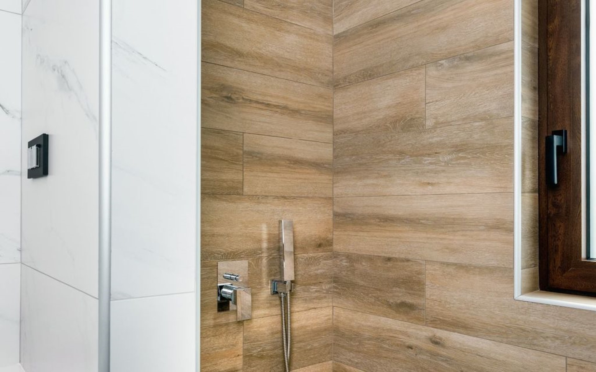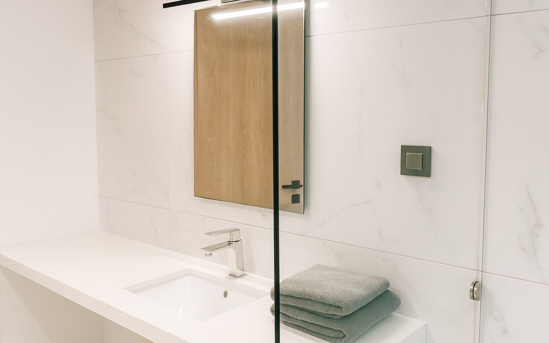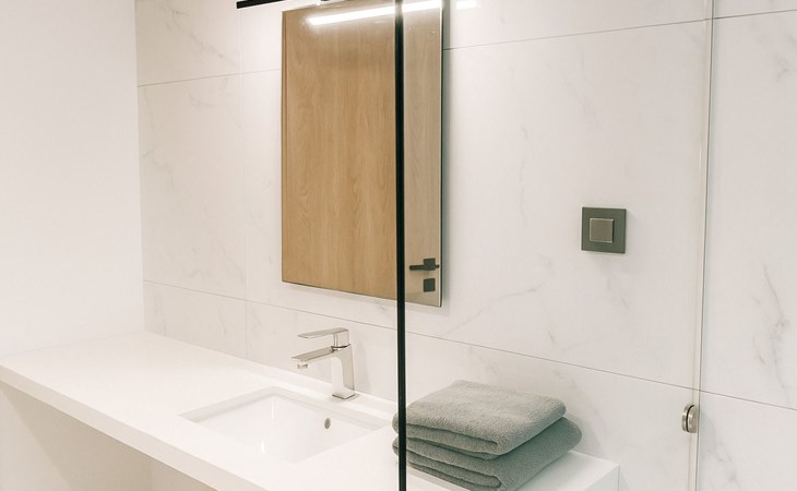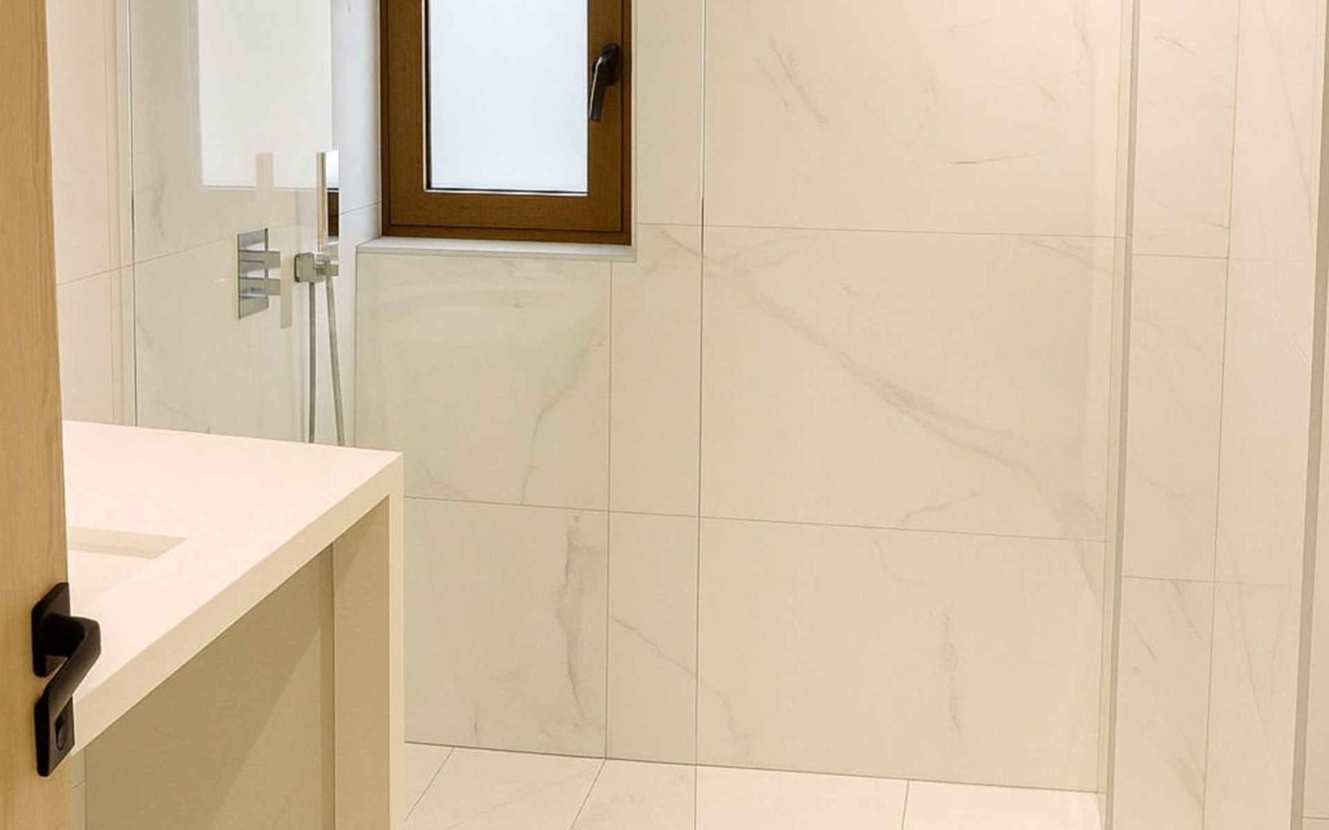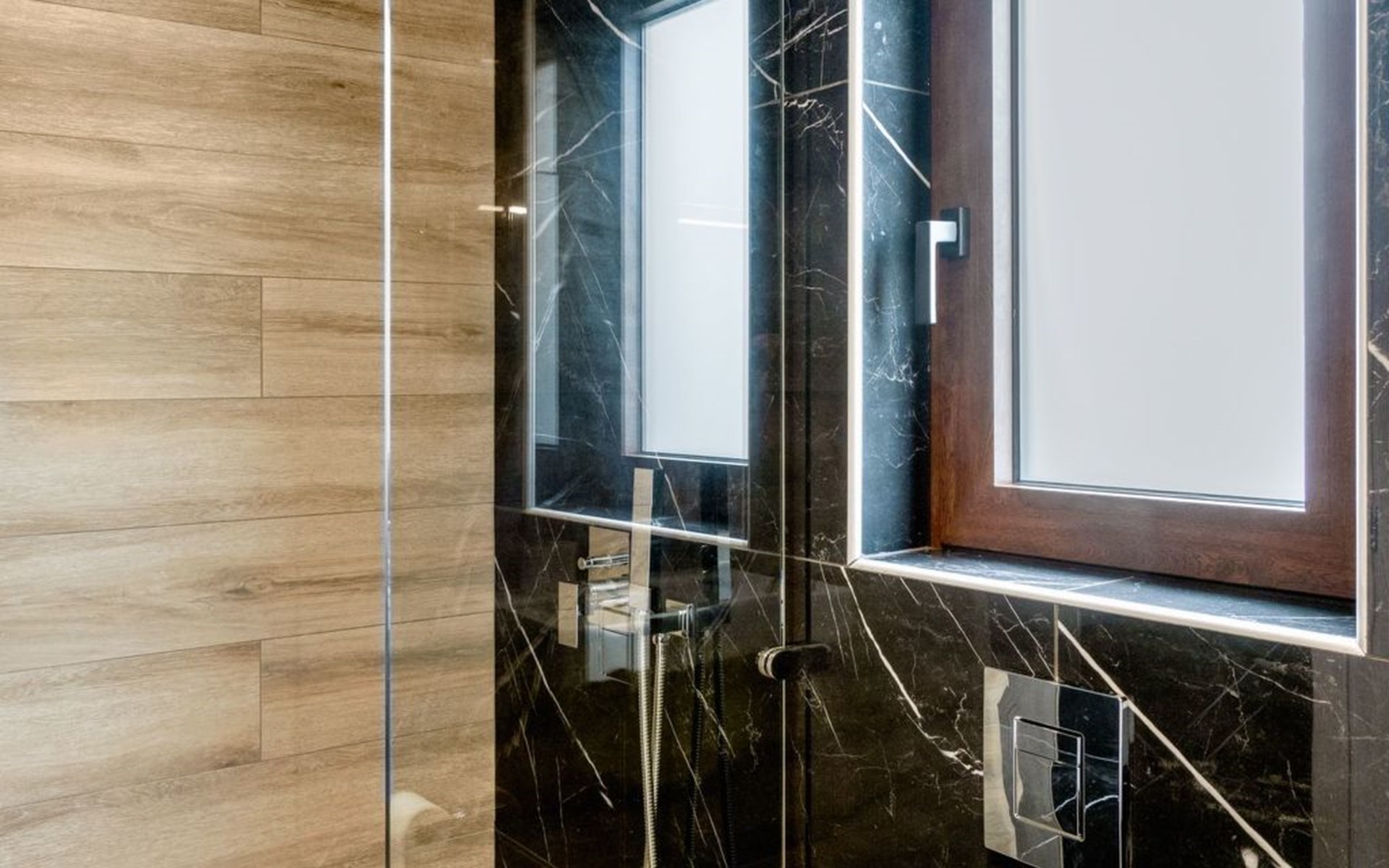 The lower level of Villa Alya features a fourth bedroom with twin-size beds, air conditioning, and an ensuite bathroom with a shower and hairdryer, ensuring guests enjoy a restful stay in complete comfort.