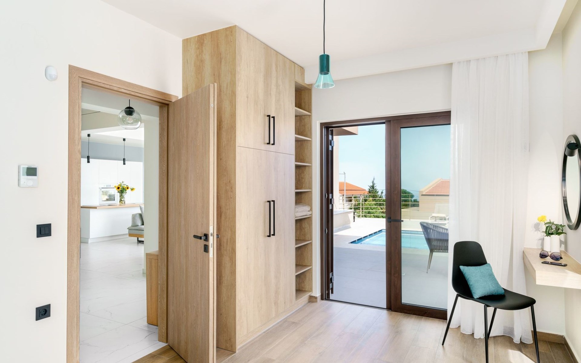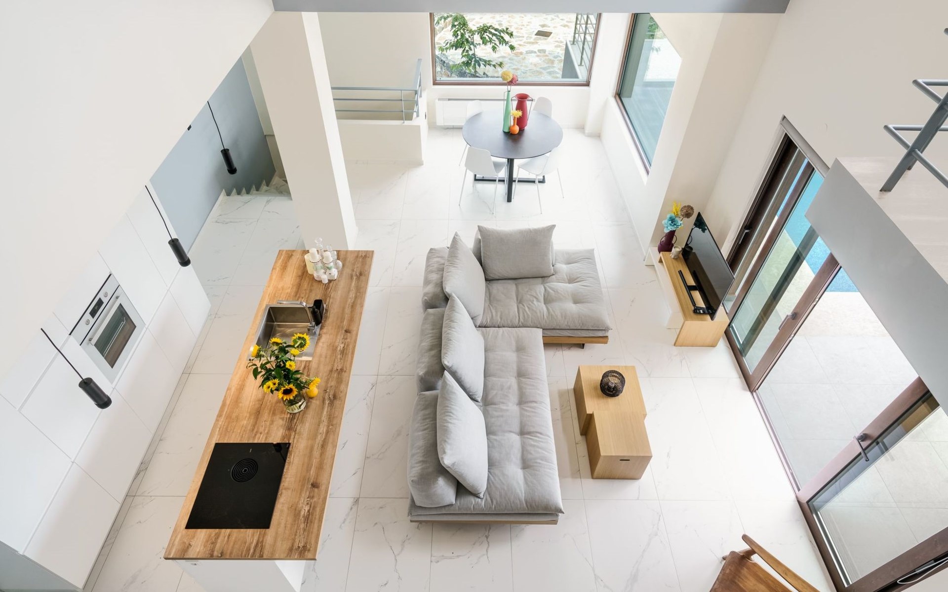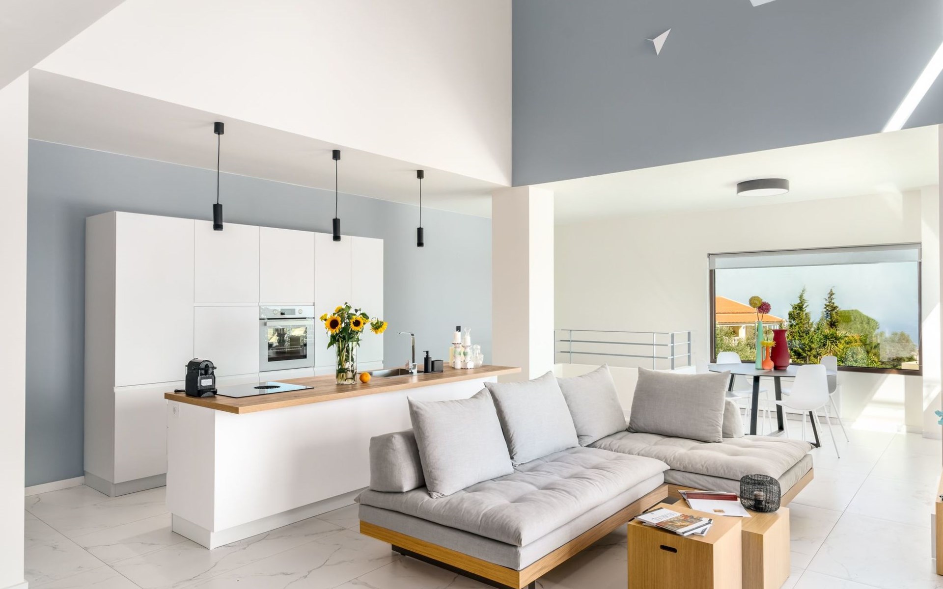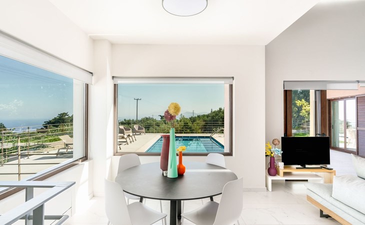The ground level of Villa Alya features an open-plan living area, where guests can relax on a comfortable sofa while enjoying the 40’’ Smart TV with satellite channels or soaking in the sea view. Large sliding doors provide direct access to the pool terrace, making it easy to transition between indoor and outdoor living. The fully equipped kitchen is perfect for preparing meals, while the dining area for four offers an intimate setting for enjoying your creations.