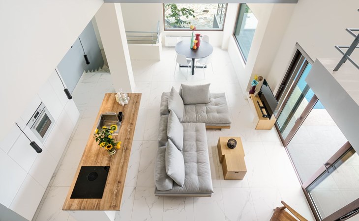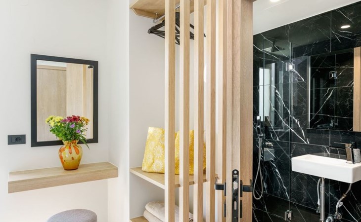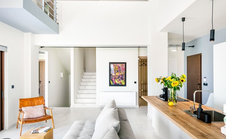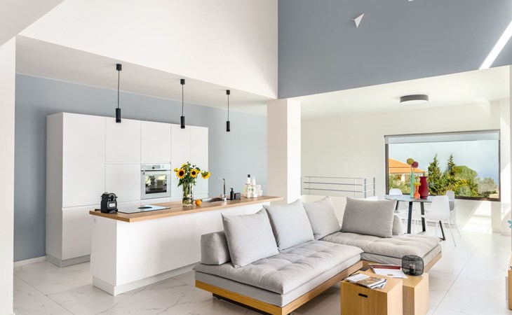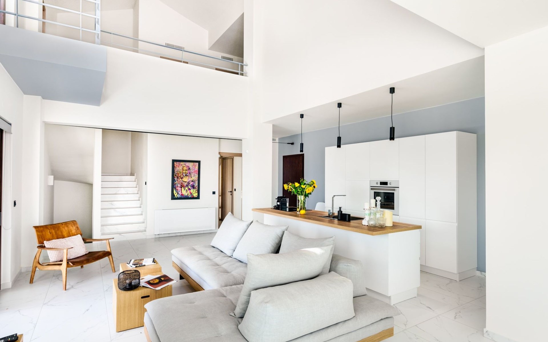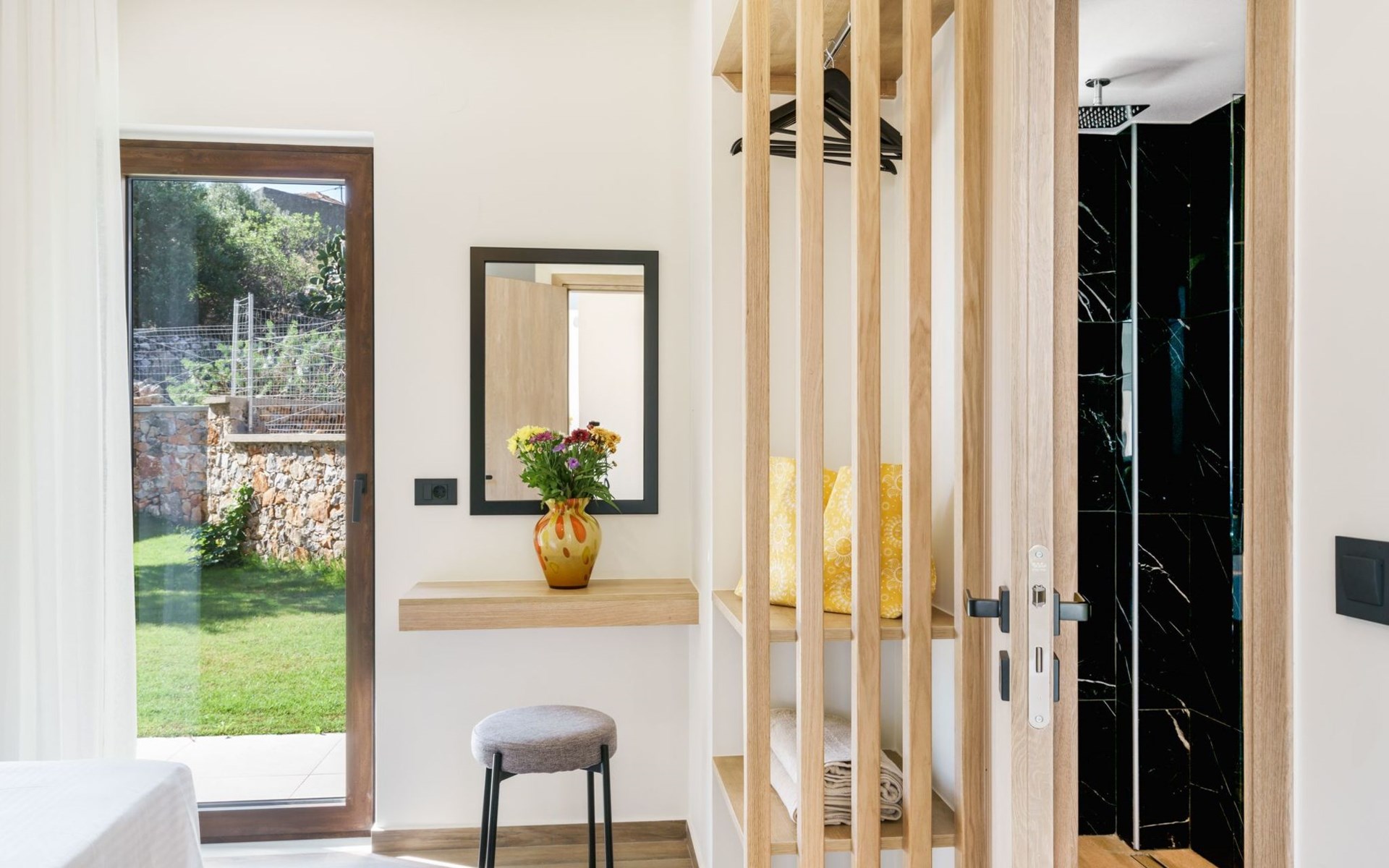 The ground level of Villa Alya features an open-plan living area, where guests can relax on a comfortable sofa while enjoying the 40’’ Smart TV with satellite channels or soaking in the sea view. Large sliding doors provide direct access to the pool terrace, making it easy to transition between indoor and outdoor living. The fully equipped kitchen is perfect for preparing meals, while the dining area for four offers an intimate setting for enjoying your creations.