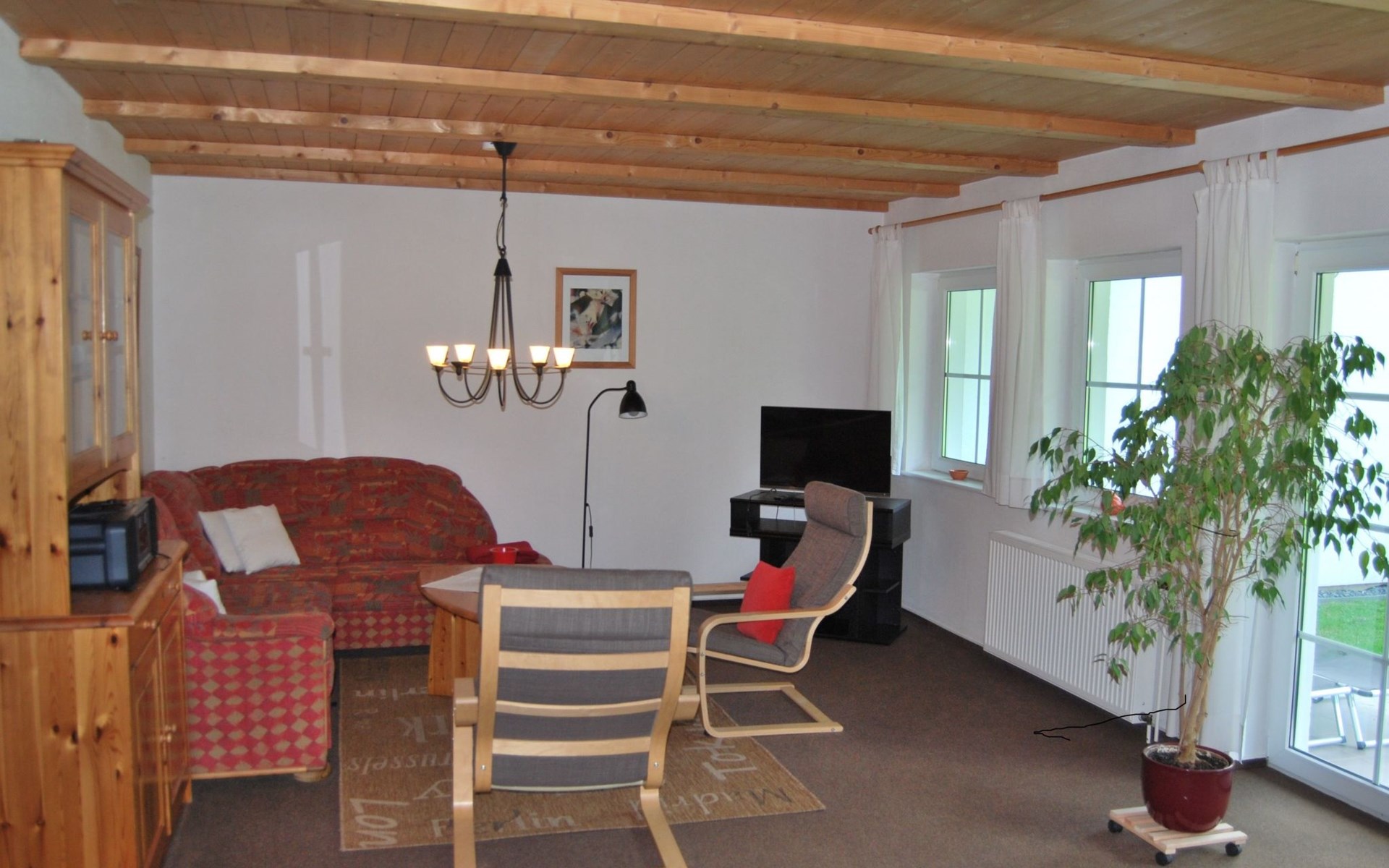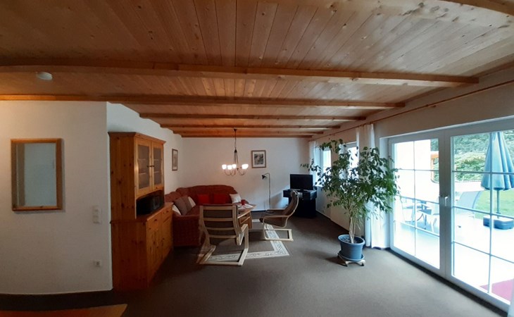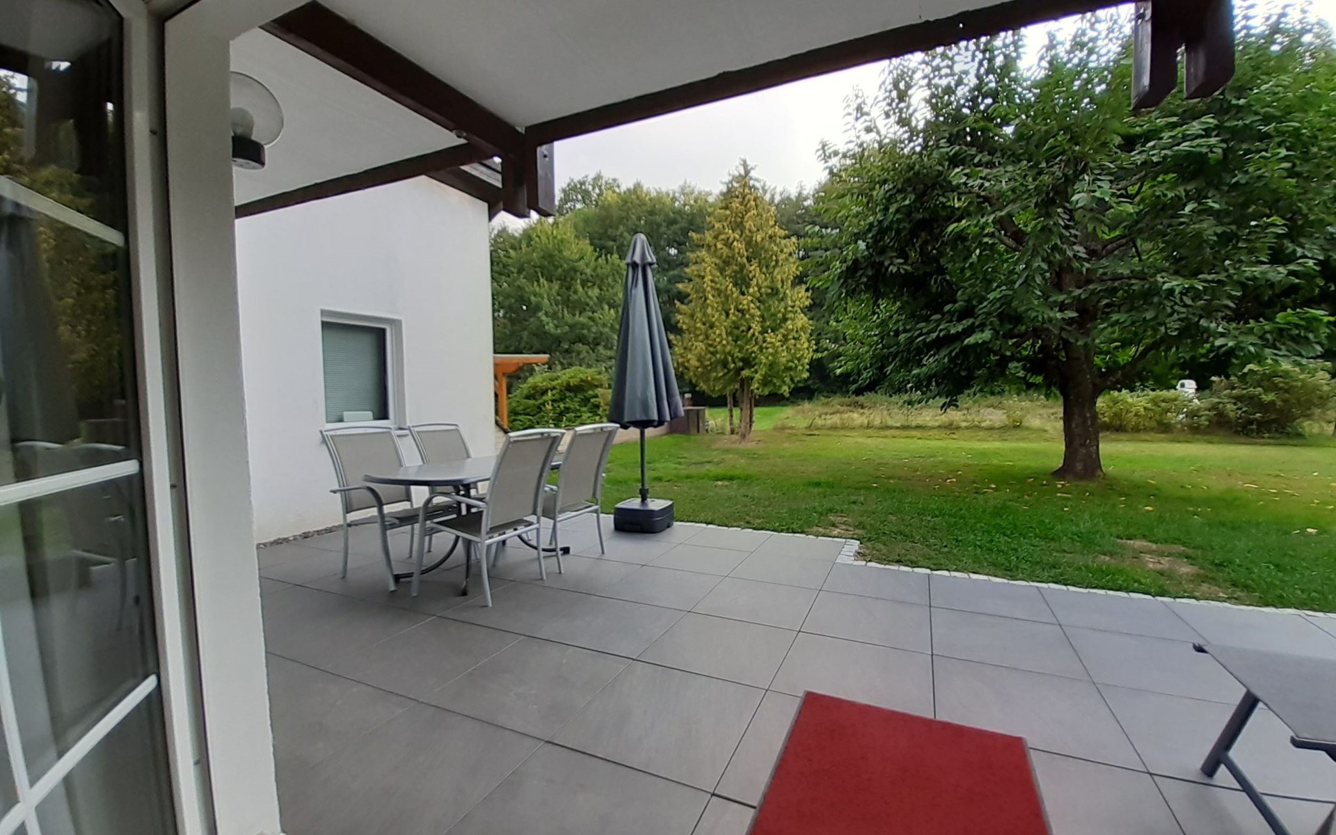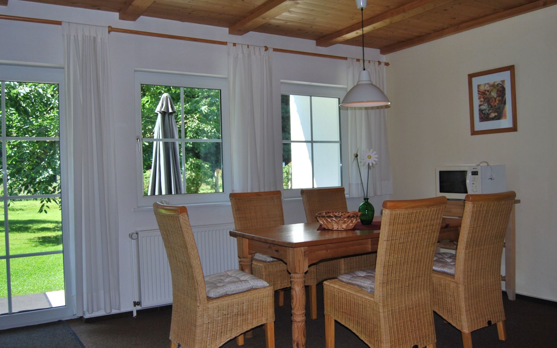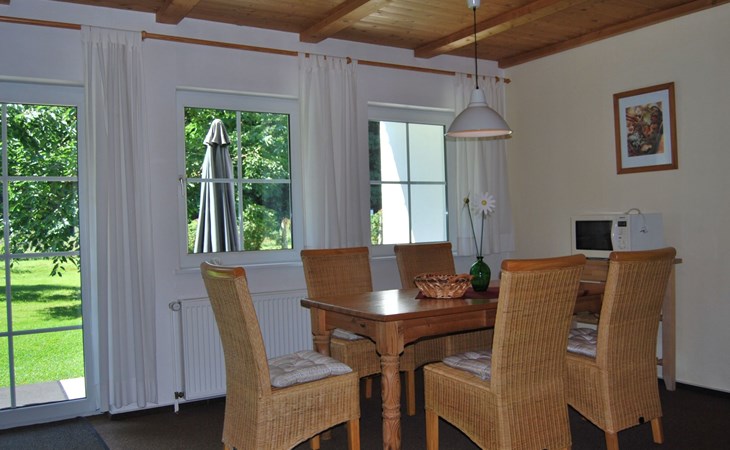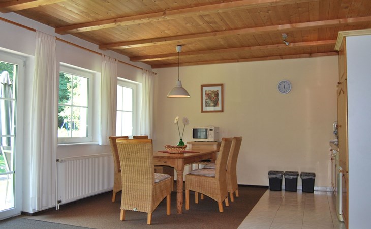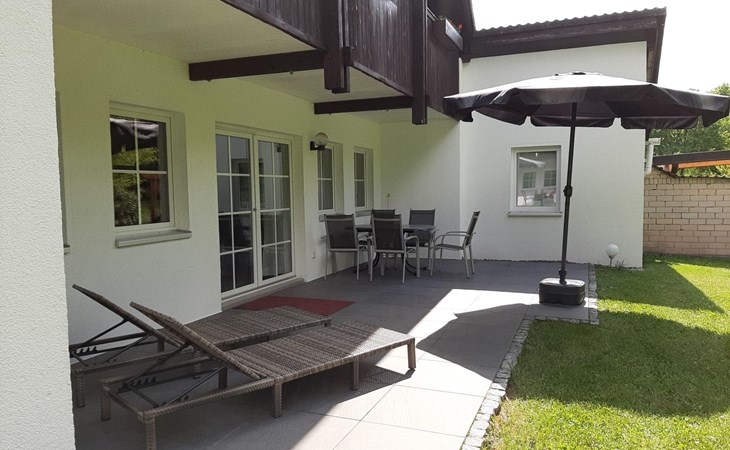 Inside you will find a fully equipped, comfortable flat with two bedrooms, a complete kitchen including dishwasher, washing machine and tumble dryer. A separate dining area, which can comfortably seat up to 6 people, as well as a shower and WC complete the offer. For cosy evenings or relaxing mornings, there is a spacious terrace with direct access to the garden, including patio furniture, where you can relax and unwind.