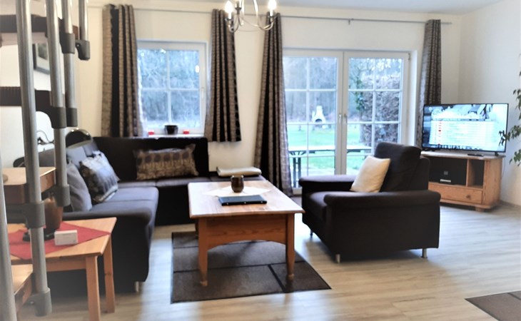 The flat, a top-rated four-star holiday flat with 75sqm on 2 levels, offers space for 2 - 4 people. It has 2 bedrooms, a spacious kitchen, guest WC, dishwasher, washing machine and tumble dryer (in a separate room), as well as a furnished terrace with direct access to the garden. The open-plan design and complete furnishings guarantee a comfortable and carefree stay. The living experience is completed by the provision of bed linen, towels, cots and highchairs at no extra cost.