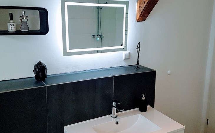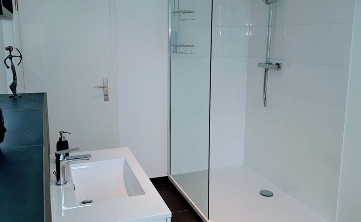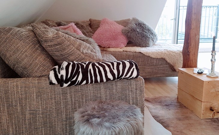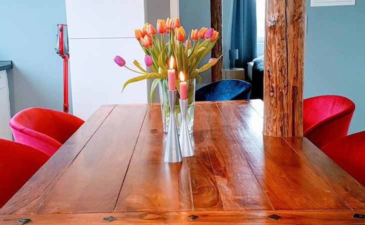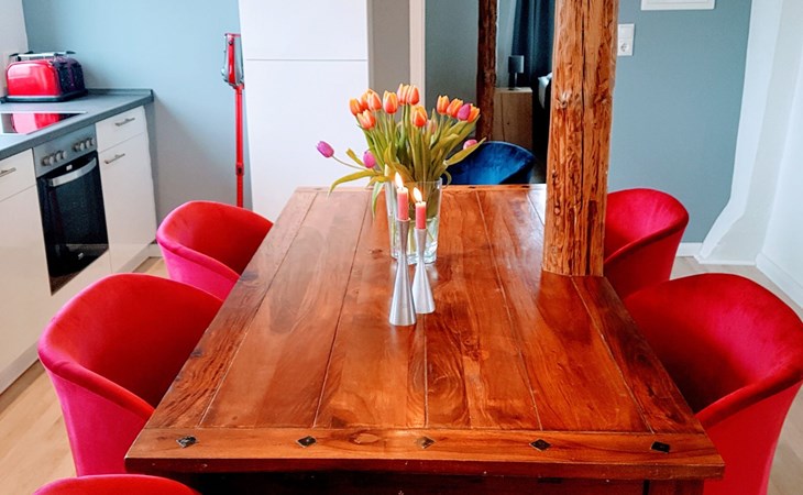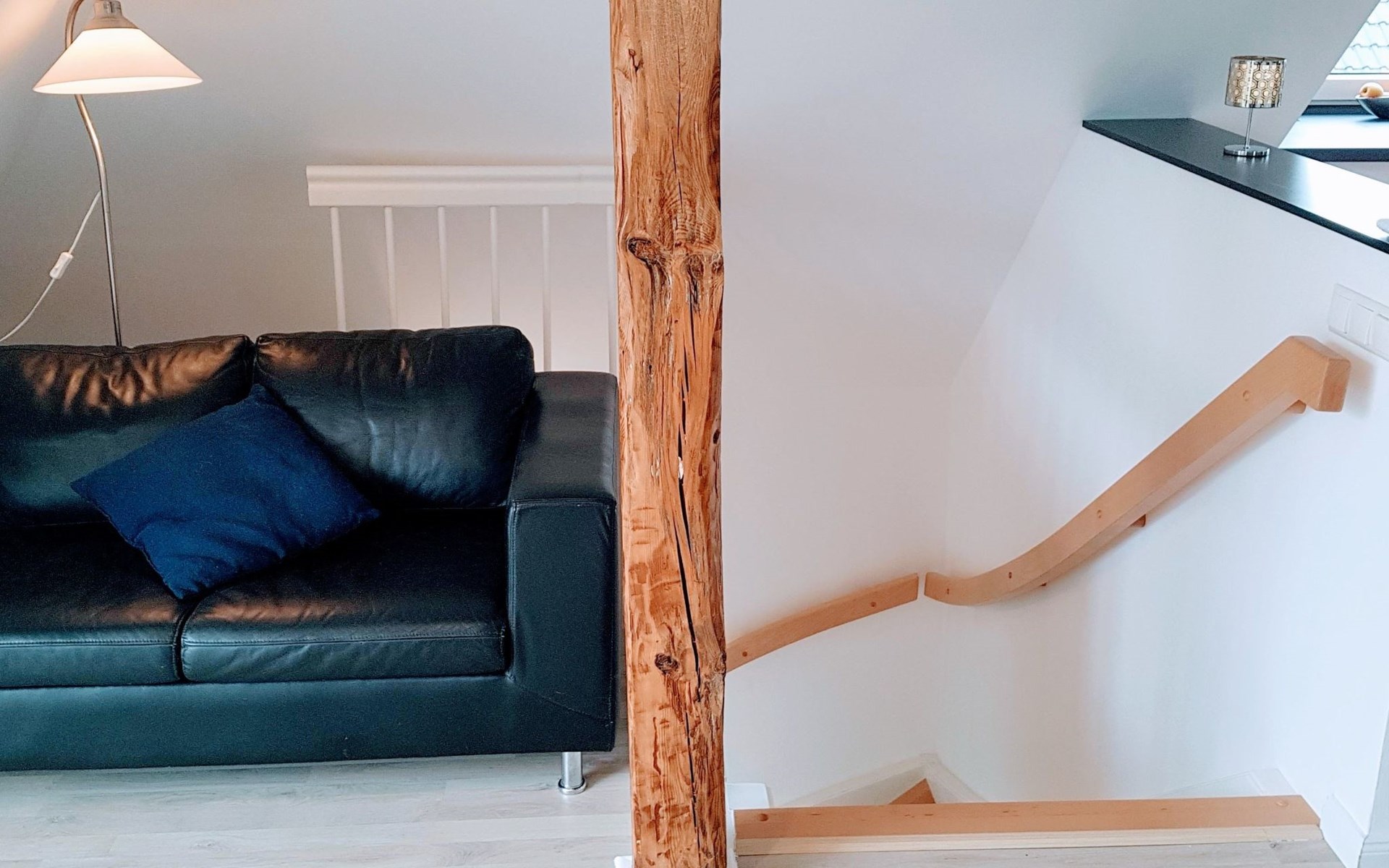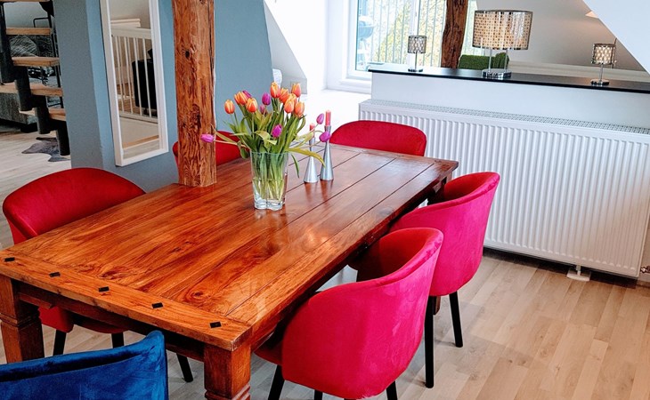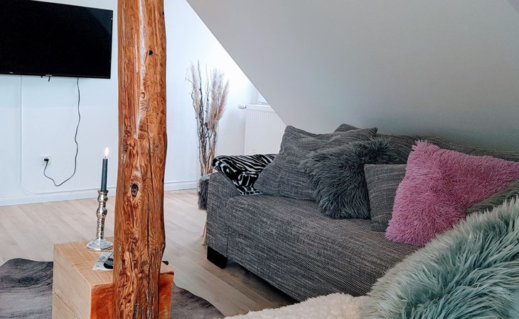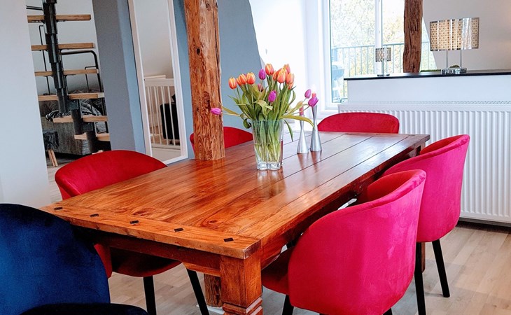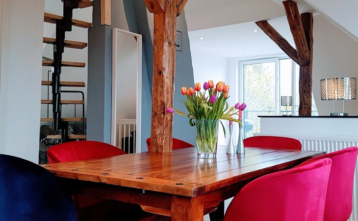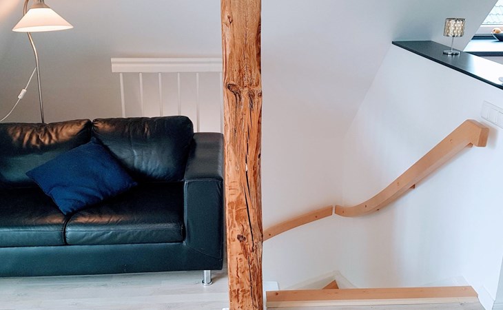 View over Sykeopen beams with modern elements and the latest technologycomfortable box-spring bed, futon in the loft's atticopen kitchen with high-quality dining area and cosy living arealarge, bright bathroom with open shower