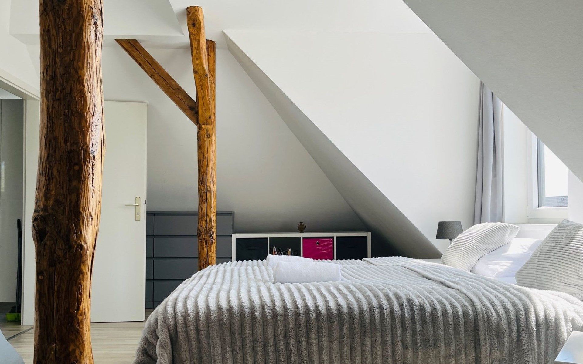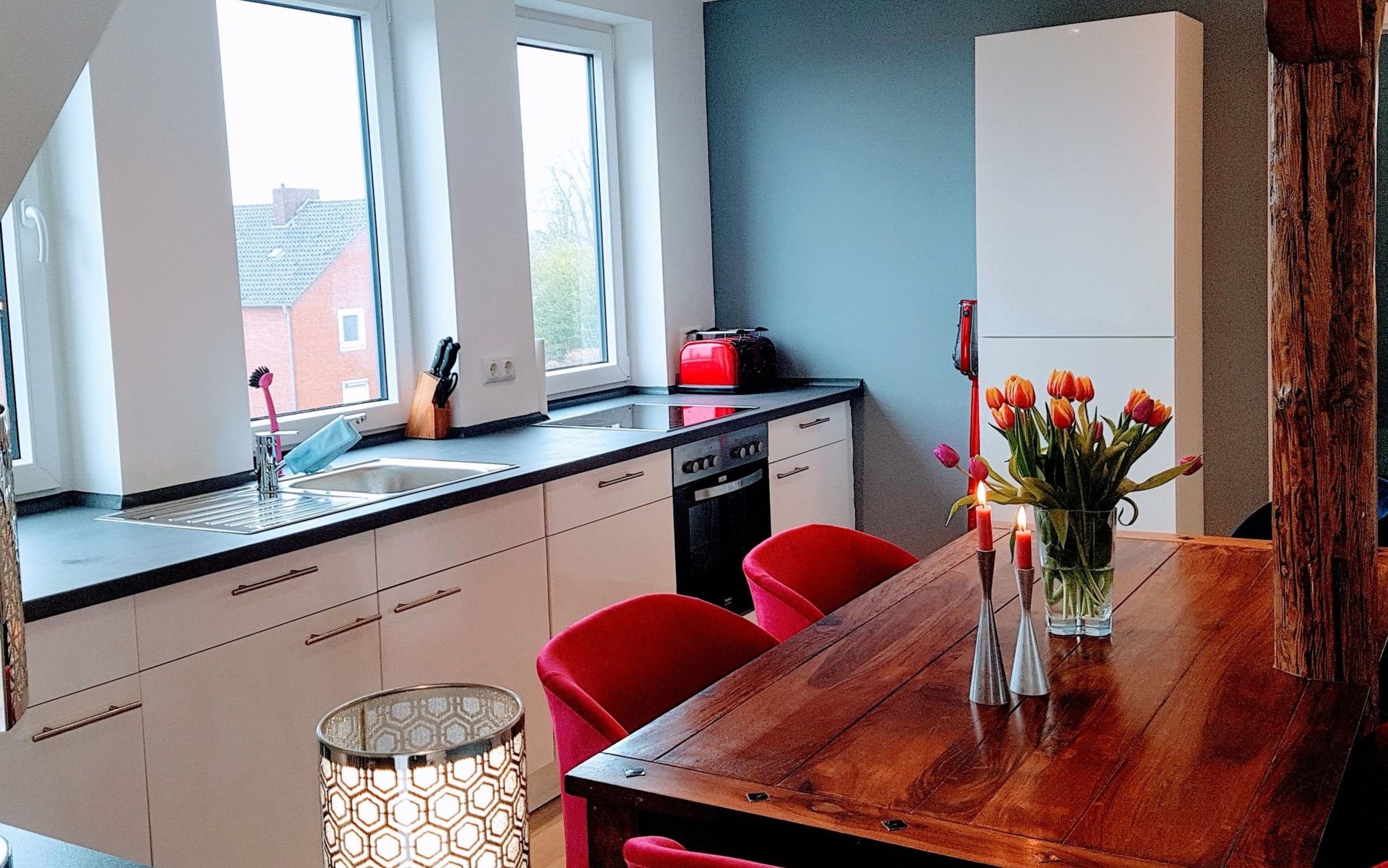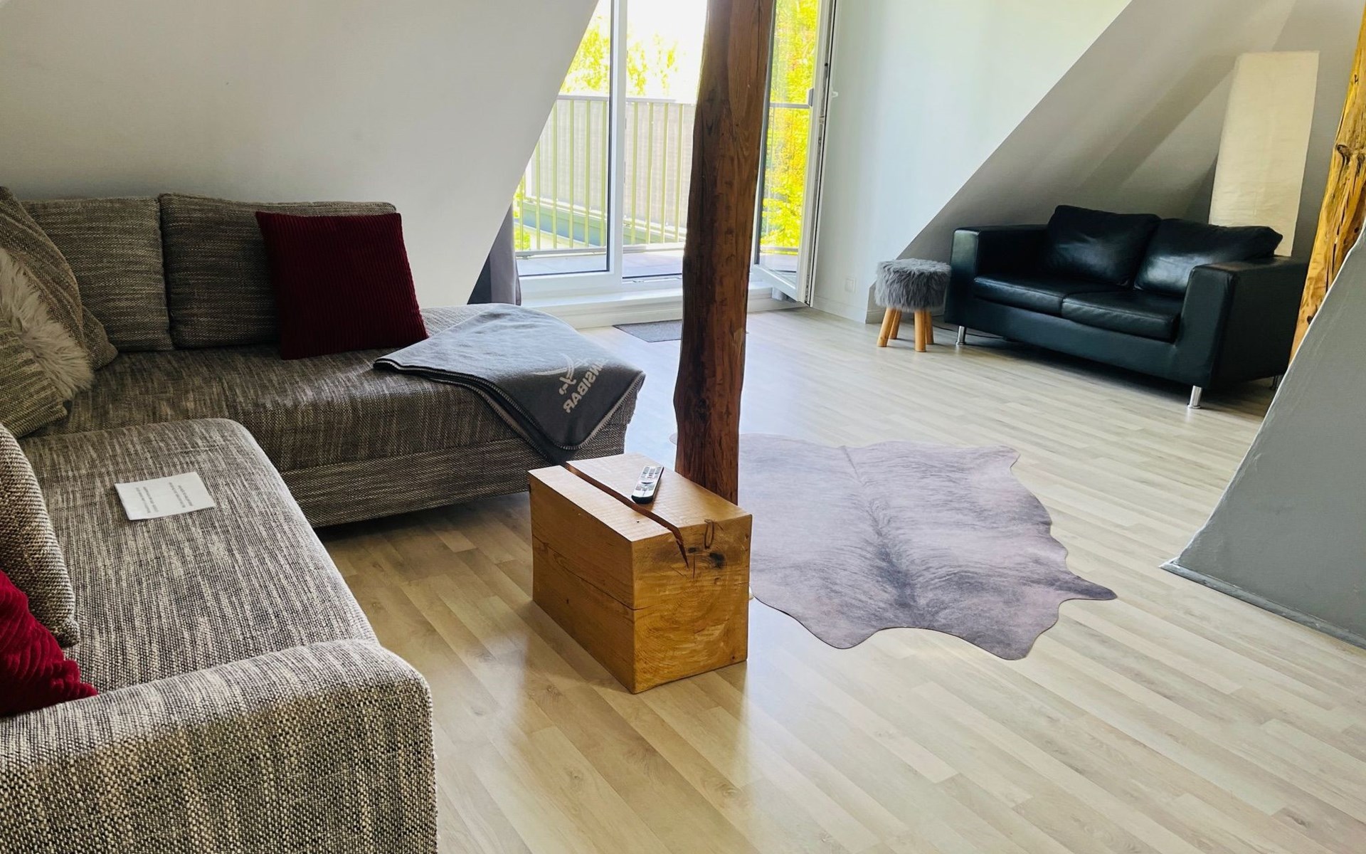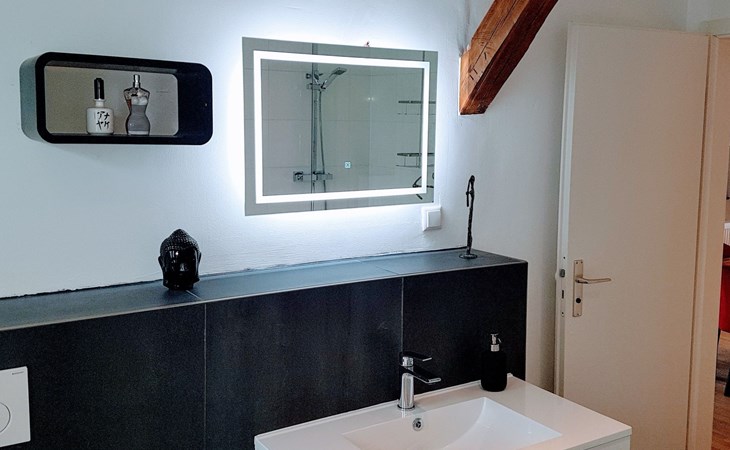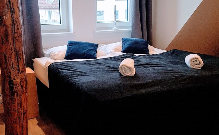 View over Sykeopen beams with modern elements and the latest technologycomfortable box-spring bed, futon in the loft's atticopen kitchen with high-quality dining area and cosy living arealarge, bright bathroom with open shower