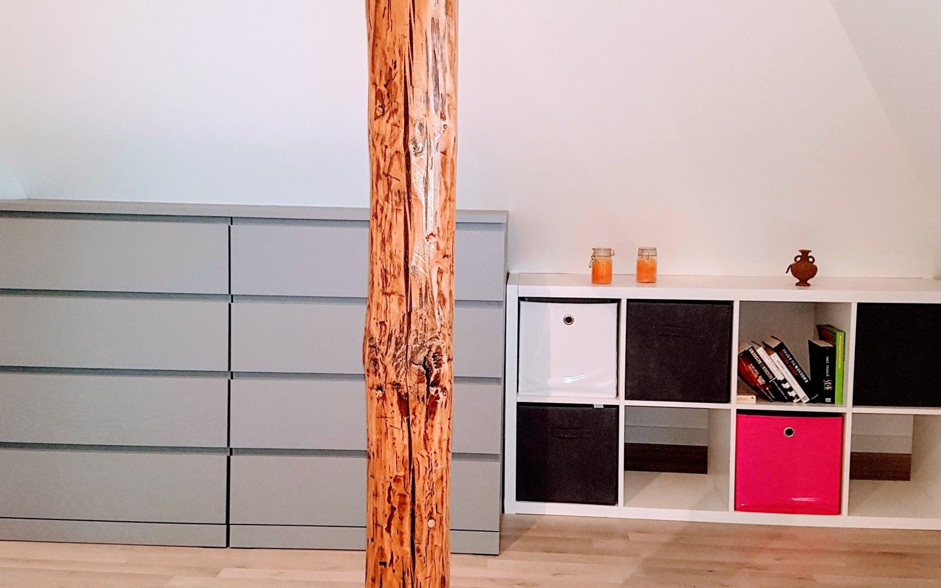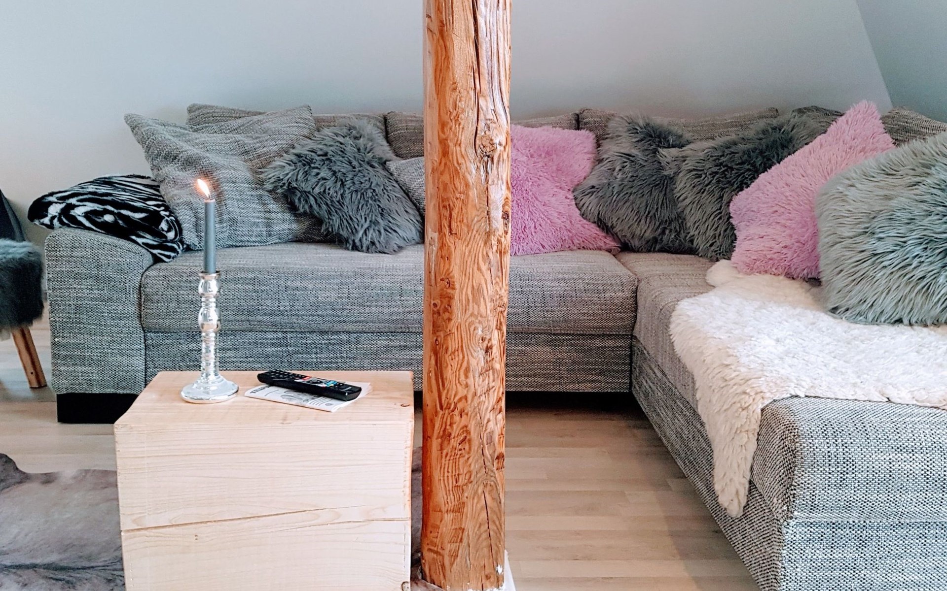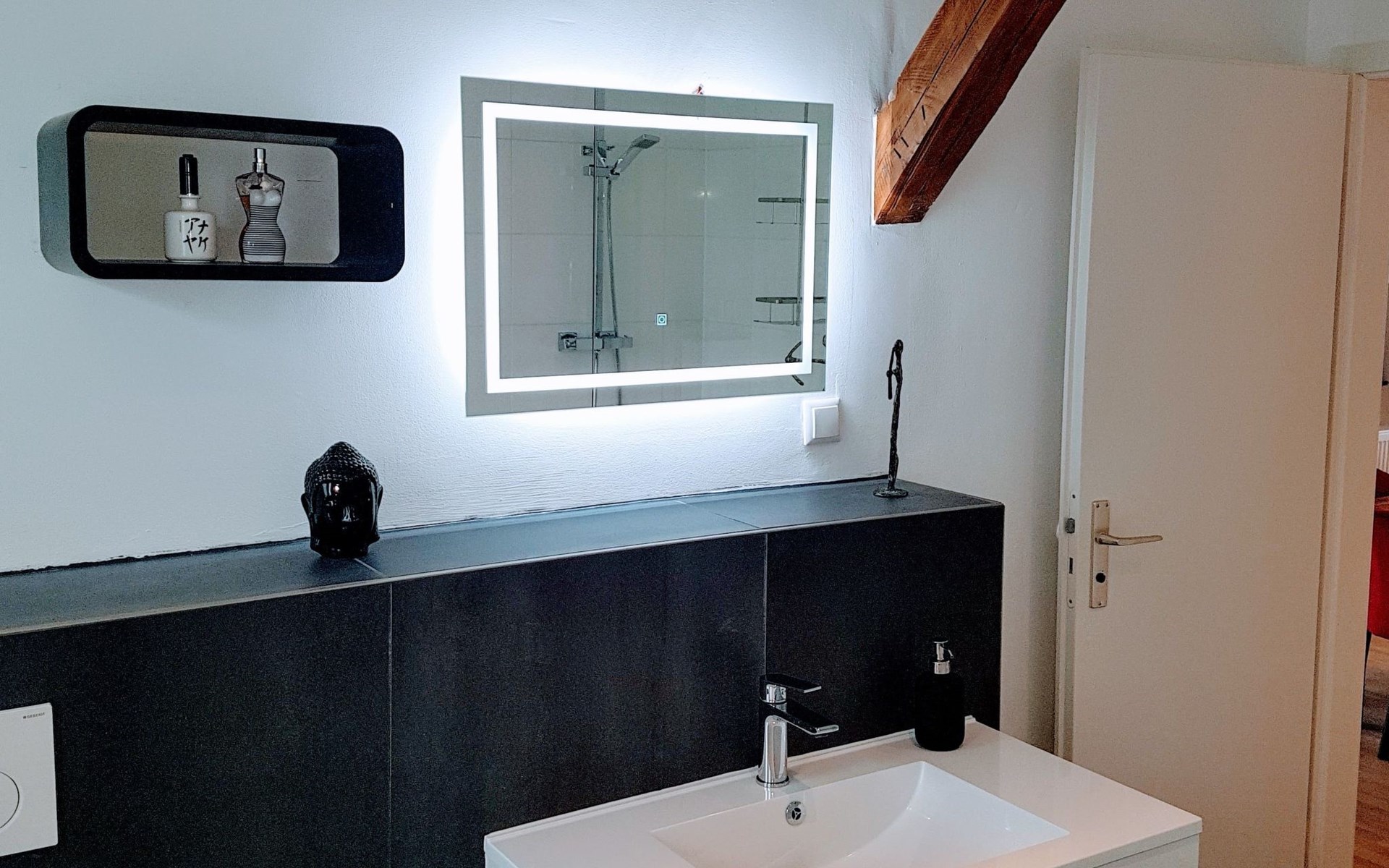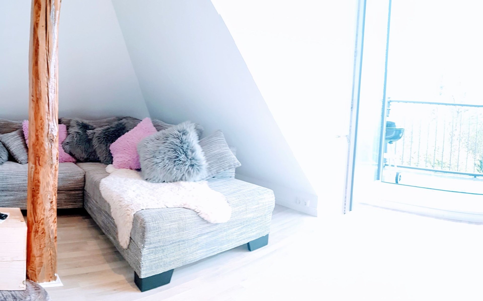 View over Sykeopen beams with modern elements and the latest technologycomfortable box-spring bed, futon in the loft's atticopen kitchen with high-quality dining area and cosy living arealarge, bright bathroom with open shower