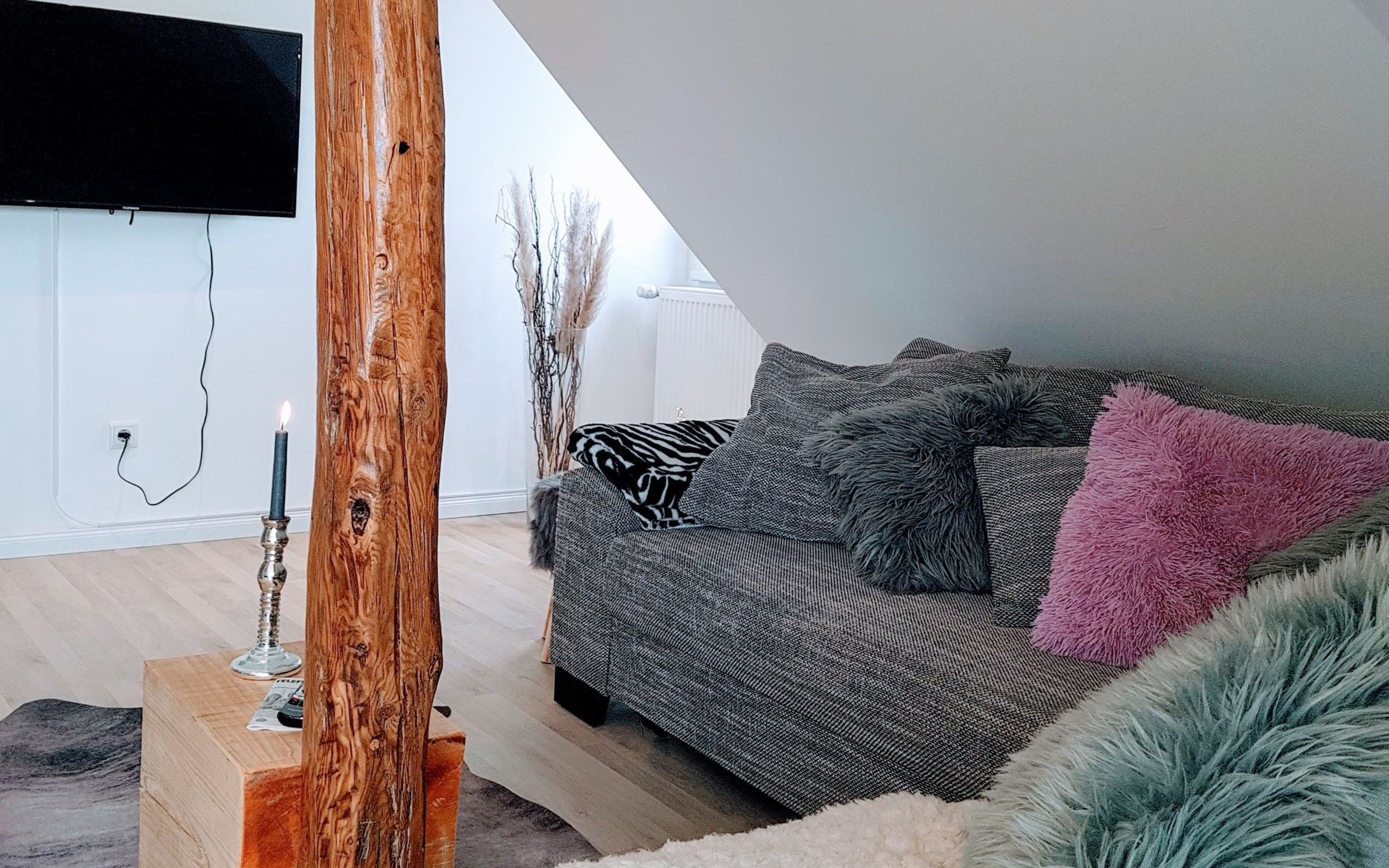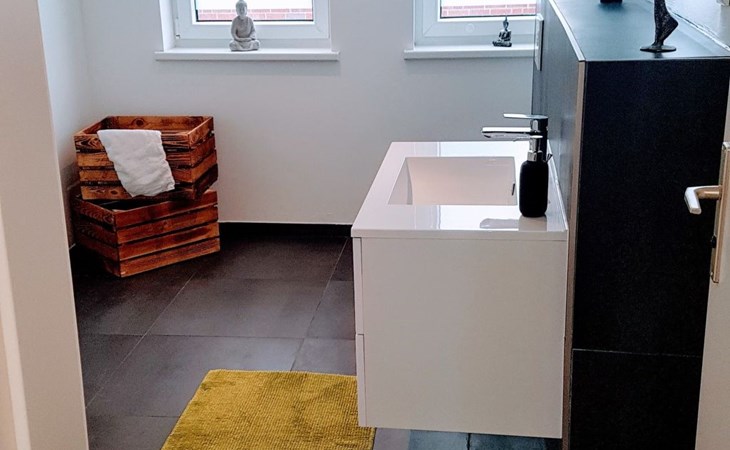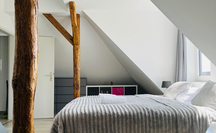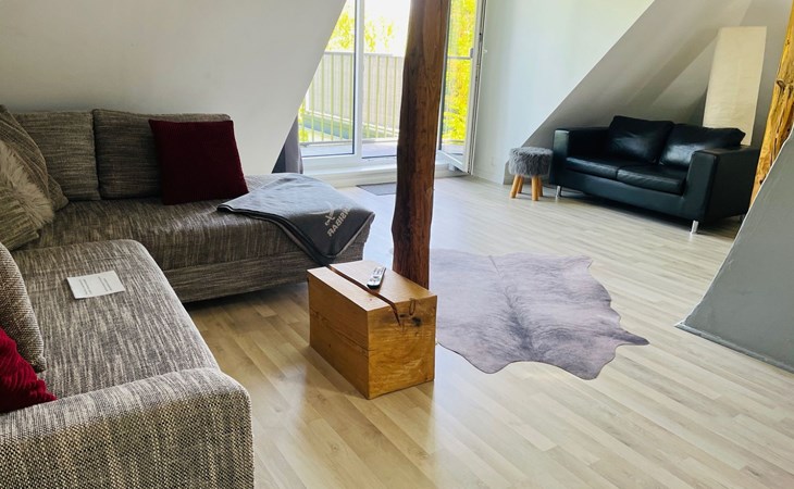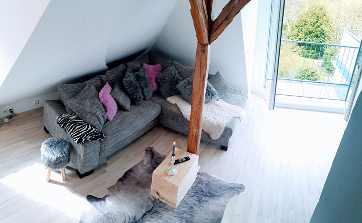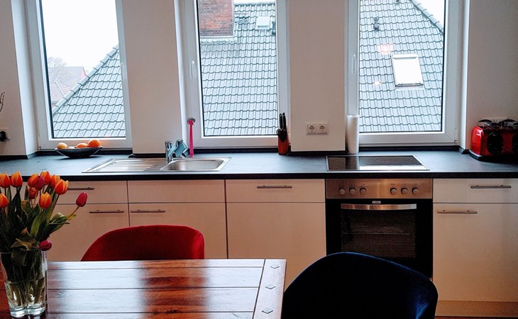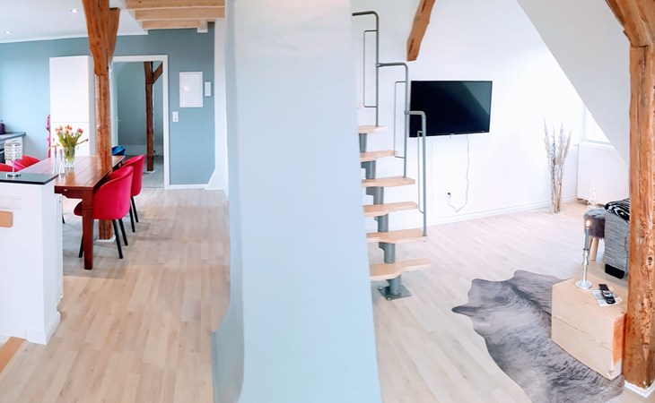New, luxurious loft flat for up to 6 people.the 85sqm is individually and high quality designed and can be used by families, friends or couples.the flat offers an open kitchen with inviting dining table, a living area with smart TV, a cosy maisonette area with two additional sleeping places and the large bedroom, also with smart TV.the highlight is the 25sqm balcony with a view of the garden over the roofs of Syke....and the whole thing 20 minutes from Bremen.